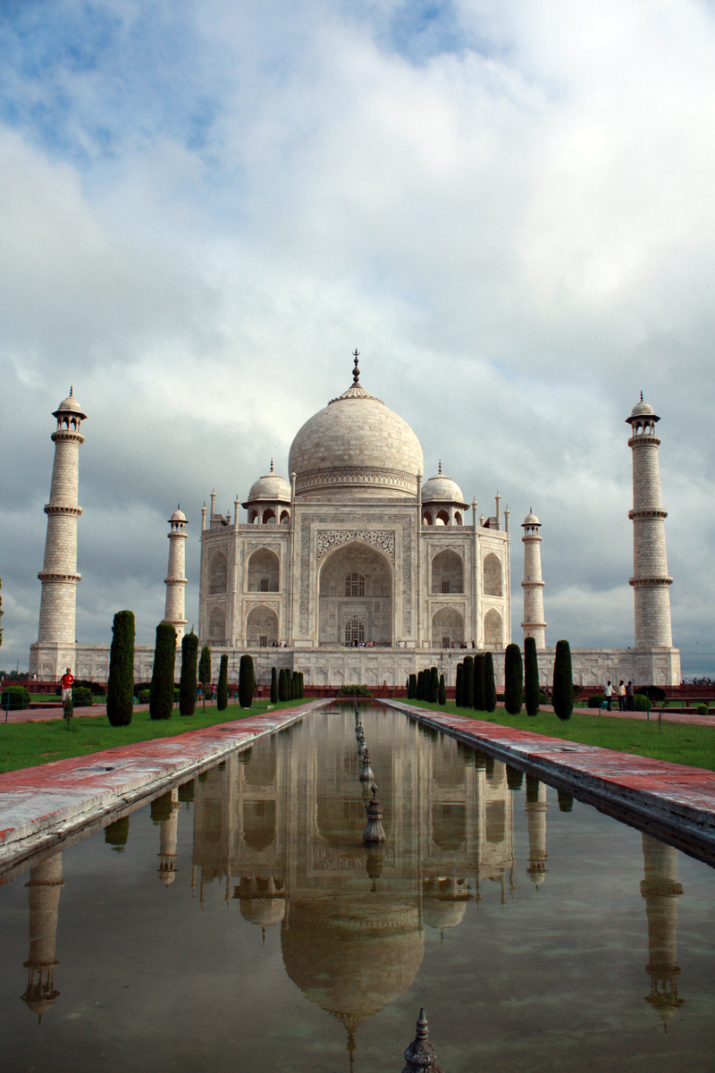 Passem un control de seguretat com als aeroports, fins i tot ens catxegen a tots, i entrem al recinte. Hi ha una altra gran porta, de com a mínim 10 metres d’alçada, i ja comencem a entreveure el Taj. Quan entrem, l’impacte visual és brutal. Personalment no m’havia passat mai emocionar-me veient un edifici; en aquest cas se’m posa la pell de gallina (literalment). La seva bellesa és difícil d’expressar amb paraules, has vist fotos i penses que tampoc serà per tant, però sí que ho és. El Taj Mahal és, sense cap mena de dubtes, la construcció humana més bonica i espectacular que mai he vist. És senzillament preciós. El seu disseny és esquisit, amb els quatre minarets decoratius de 40 metres d’alçada embolcallant l’edifici principal, que tot i ser immens, té una delicadesa sorprenent. Tot el conjunt està alçat sobre una plataforma de marbre, de tal manera que queda totalment emmarcat pel cel, no hi ha res que trenqui la meravellosa armonia visual del conjunt, de marbre blanc amb decoracions florals i escrits del Corà al voltant de la porta. Potser sembla que és una mica exagerada tanta emoció, però realment s’ho val.
