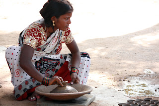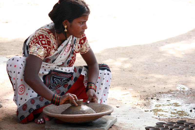 Preguntem si podem fer la resta a peu, i ens diuen que sí… O amb bici. Ens decantem per la segona opció, llogant 4 bicis per tota la tarda per 30inr (0.45eur) cadascuna. L’experiència és fantàstica, Khajuraho és un poble força tranquil i molt petit (8000 habitants), i ens dirigim pedalejant al poble vell. Aquí ens trobem amb una de les coses que havíem trobat a faltar fins ara: nens jugant als que comencem a donar galetes i veiem com se’ls il-lumina la cara, artesants fent pots de fang al carrer, carrers de cases encalades sense gent ni sorolls (amb alguna vaca rumiant, això que no falti), … Trobem nens jugant a caniques (quins records de la nostra infantesa!); els faig un vídeo amb el mòbil i es tornen bojos quan després els hi ensenyo, és possible que mai s’haguessin vist a sí mateixos en una pantalla amb moviment! La passejada, repartint galetes i somriures, fent fotos o simplement admirant el poble, és genial, no havíem tingut una sensació semblant des que vam tornar del Senegal.