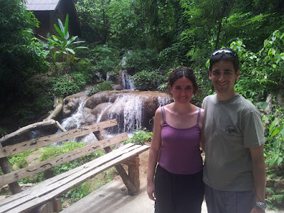 Tot seguit hem creuat el riu amb una tirolina força llarga. Ens hem quedat amb ganes de més, molta preparació per 30 segons d’emoció relativa… El següent que hem fet ha estat dinar… a les 11h del matí! El menjar era així així (típic dels mega buffets de les excursions organitzades), però es deixava menjar. Quan hem acabat, hem començat el trekking… no sabem qui ha pensat el plàning, però dinar a les 11 per fer una hora de trekking a continuació, amb el menjar encara a la gola… en fi. L’excursió ha estat bé, pel mig de la selva (tot i que el camí estava bastant trillat i preparat) i al final, després d’1h de suar, hem arribat al nostre destí: una bonica cascada… on ens esperava la furgoneta, que havia pujat per la carretera! Per cert, dues curiositats: les xineses no han fet el trekking (la guia ens ha dit que els turistes asiàtics no volen caminar, i que el trekking el fem només els europeus, en general). L’altre fet curiós és que el noi irlandès portava sandàlies (digue-li preparat per anar d’excursió a la jungla) i ha anat mig camí descalç :O Per flipar…