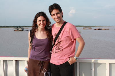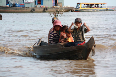 Després de dinar hem anat a visitar un poble flotant que hi ha a 20 minuts d’aquí, per veure la Cambodja de debò. Els seus habitants són pescadors que traslladen periòdicament les seves llars segons el nivell de l’aigua, que varia 8 o 10 metres segons l’època de l’any. Per arribar-hi hem agafat una barca, bastant cara, 20usd per persona, que ha trigat uns 30 minuts. No ens ha acostat gaire a la zona on viuen perquè estem al final de l’estació seca i no hi havia prou profunditat, cosa que hem descobert a la tornada, quan la barca no tirava. Després de 10 minuts d’intentar-ho el barquer (amb un pal llarg), ha anat a ajudar-lo el nostre guia (el conductor del taxi del matí) que ha estat a punt de caure a l’aigua. Sense pensar-s’ho dues vegades, el Sergi ha corregut al rescat i una mica més i cauen tots dos a l’aigua. Que per cert, neta, neta, neta, no estava 😀