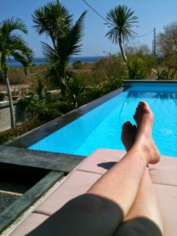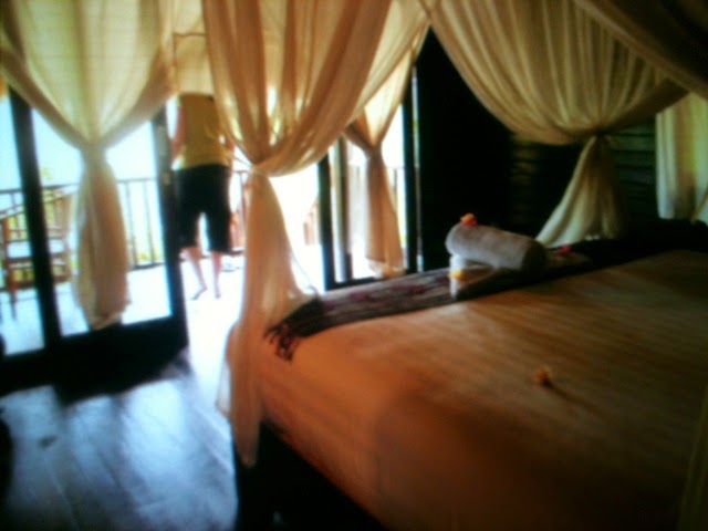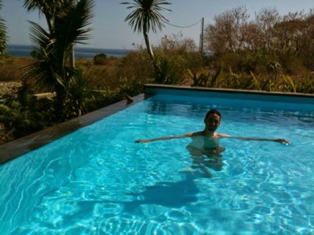 No ens ha volgut dir el preu fins que no veiéssim l’hotel, la veritat és que és espectacular: només hi ha 8 bungalows, de fusta, al voltant d’un jardí. Cada bungalow té un porxo, i el labavo, a la part del darrere, és semi-exterior (només està cobert per sostre a mitges). La piscina té vistes directes al mar, i està encarada a l’oest, així que les postes de sol, estirat a la tumbona de la piscina, amb una cerveseta fresqueta, han de ser espectaculars. Total, que ja ens era igual el preu que ens digués, ens volíem quedar! Quan finalment ens ho ha dit, hem flipat: 400.000 rúpies (24 euros). A Booking l’havíem vist per 35 euros, i ja ens semblava una ganga abans de veure’l, però una vegada aquí, i a sobre a aquest preu… doncs el noi ens ha mirat una mica cohibit i ens ha demanat disculpes, “és que estem en temporada alta”, ens ha dit! OoO Està clar que aquest no sap que a Salou pots gaudir de meravelloses torres de ciment i platges massificades pel fabulós preu de 150 euros la nit 😉