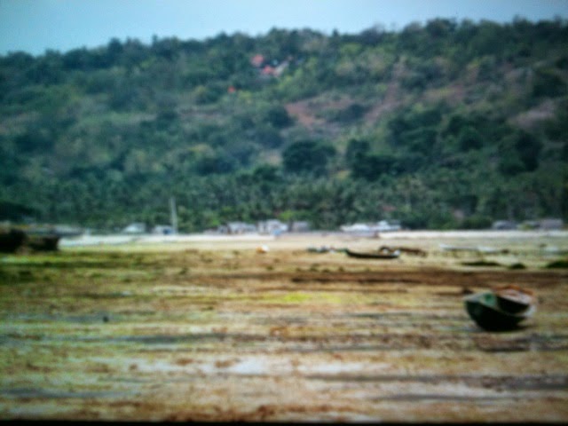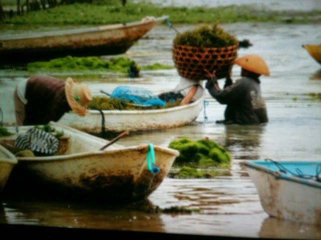 Després hem anat a veure les plantacions d’algues. L’economia de Lembongan, abans de la irrupció del turisme, es basava gairebé exclusivament en el cultiu d’algues, i avui dia encara són molts els habitants de la illa que hi treballen. Al sud-est de la illa hi ha una gran zona on es cultiven les algues, i amb la marea baixa la gent hi va a recollir-les. Hi havia bastanta gent treballant-hi, hi ha una bona extensió. Són curiosos els contrastos que es poden trobar en aquest país…