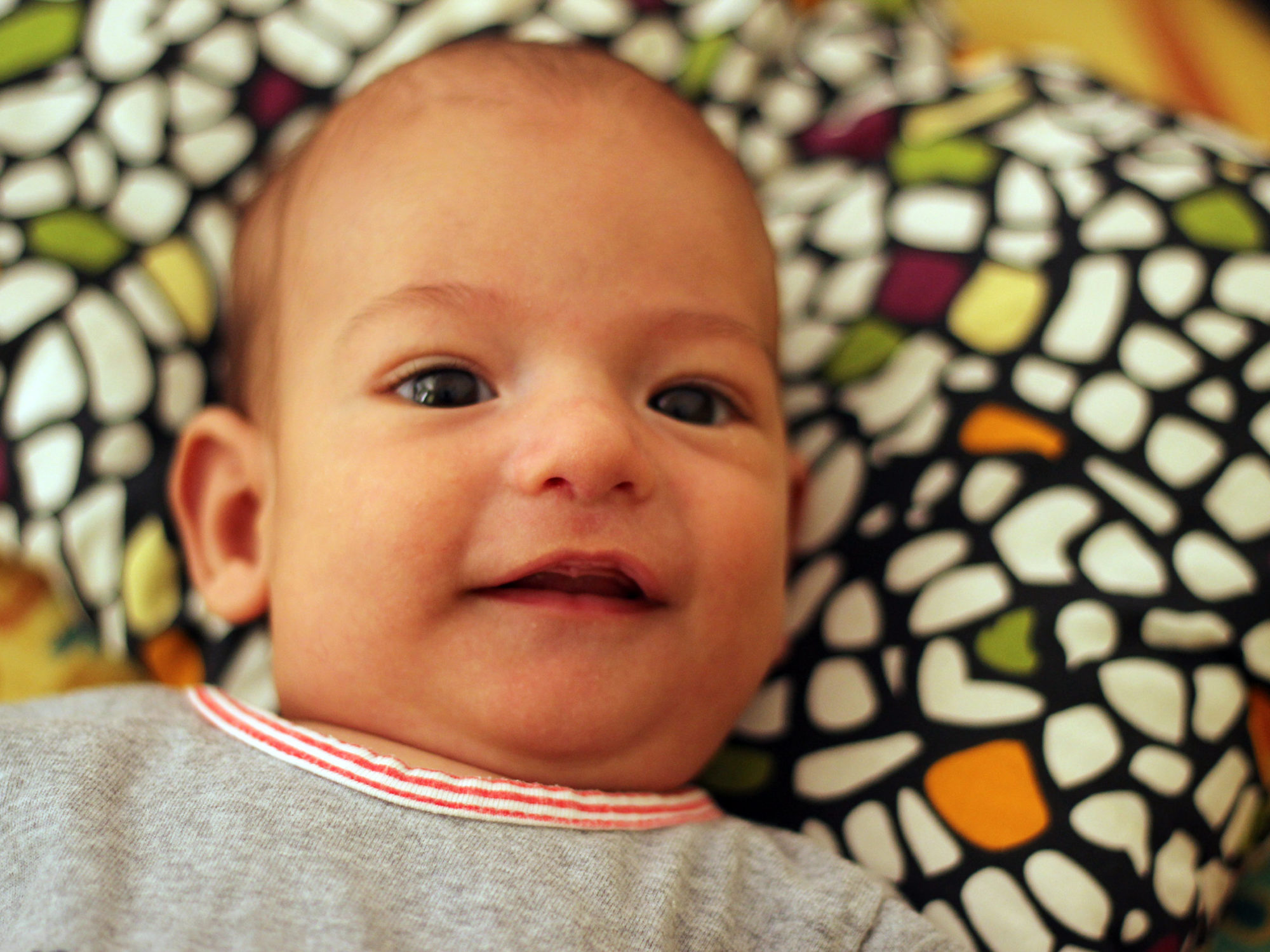 Cada dia està més despert. Ja fixa la mirada molt més enllà de 20 centímetres. Ens mira quan portem el cotxet i quan li ensenyem objectes els segueix amb la mirada sense problemes.