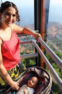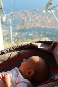 En el nostre intent de batre el rècord Guiness de mitjans de transport utilitzats per un nadó de 4 mesos, avui hi hem afegit el telefèric (si el veiés l’avi Antoni, cauria de cul 😉 N’hi ha un que puja fins al cim de la muntanya que hi ha darrere de la ciutat (300 metres d’alçada) i que et proporciona unes vistes espectaculars de Dubrovnik. No és barat (15€), i sí que és una mica turistada, però les vistes són molt molt xules i l’alternativa (pujar-hi a peu) no és encara viable amb el nen.