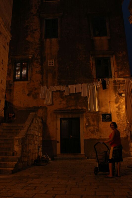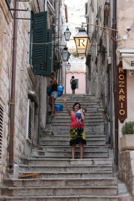 Després de gaudir de les vistes i de presenciar un atac de claustrofòbia, hem baixat cap a la ciutat vella. El telefèric té l’estació al nord de la muralla, just al costat exterior. Per entrar-hi, hi havia dues possibilitats: fer una caminada per fora i anar a buscar una de les dues portes principals, o entrar per una porta secundària que no havíem descobert fins ara. Hi havia unes quantes escales, i la Beth m’ha dit que no ho veia clar, que ella podia portar el nen en braços però jo hauria de carregar el cotxet. M’ha semblat que no eren gaires escales, i com que sóc un imbè… valent, he insistit en baixar les (3 o 4, he pensat) escales. Craso error!!! Dins de la muralla hem anat a parar a un carrer de la part de dalt de la ciutat, i per arribar al centre hi havia un carrer tot ple d’escales, llarg llarg llarg (es veia la gent al final, així petiteta petiteta 😉 i, és clar, com que havia insistit jo, m’he fet el fort (ah, no passa res, això ho baixem en un moment -amb la millor veu de xulo putes que m’ha sortit-). Collons, si hi havia escales! He arribat a baix com si hagués corregut una marató! 😀