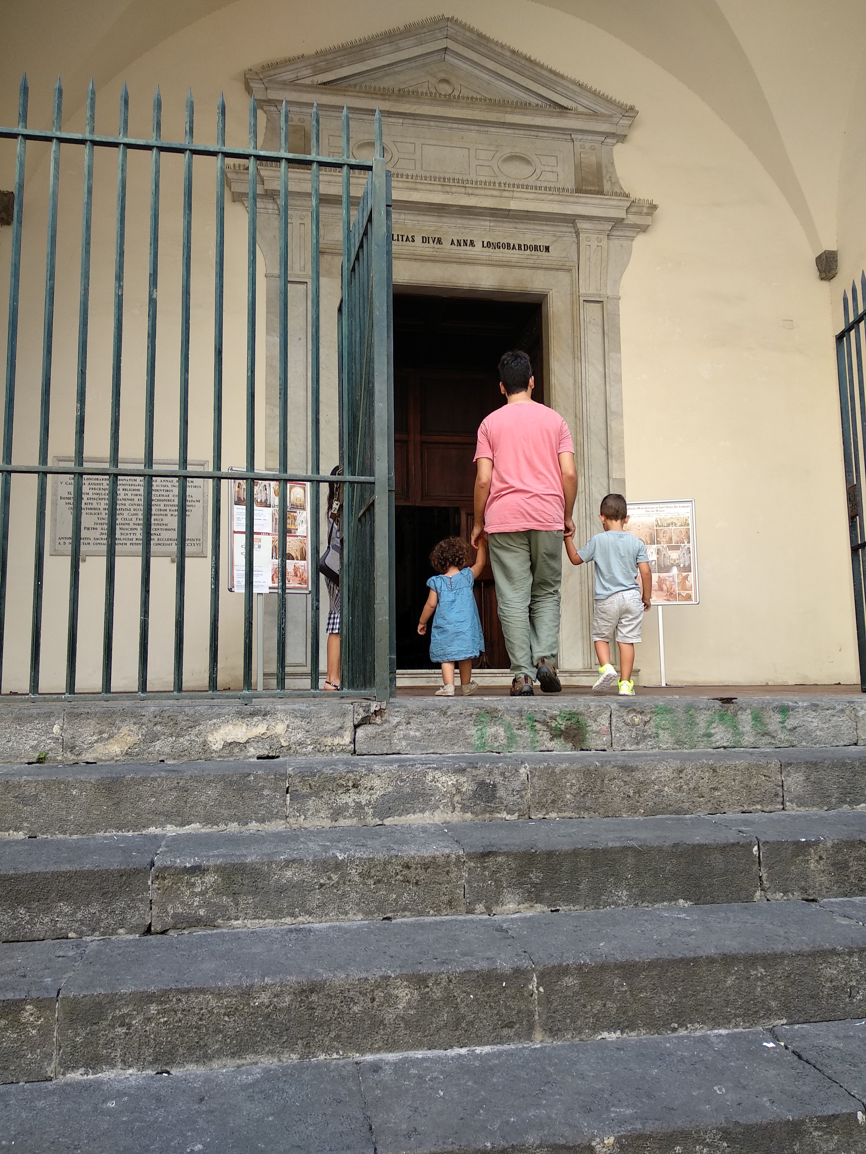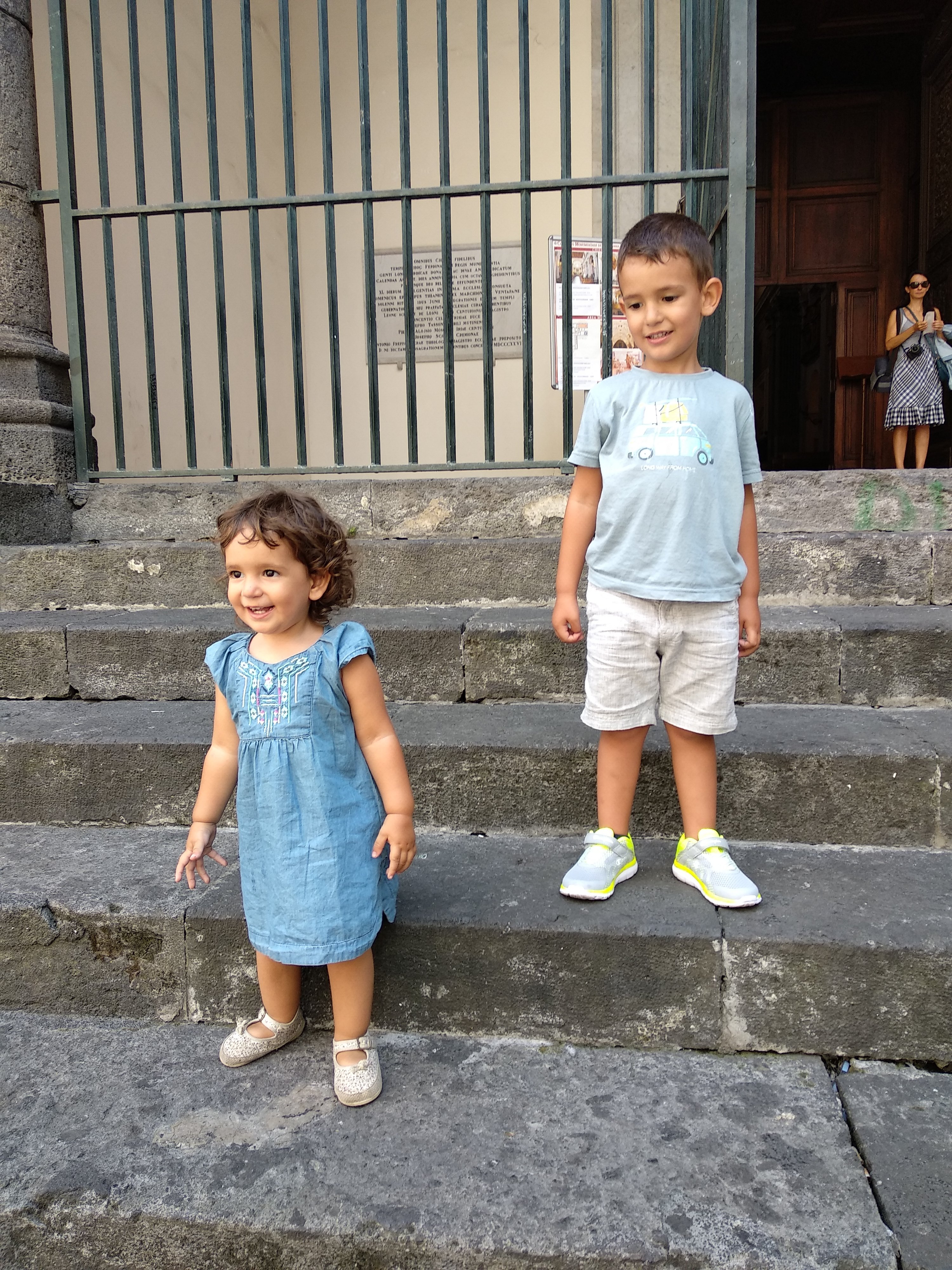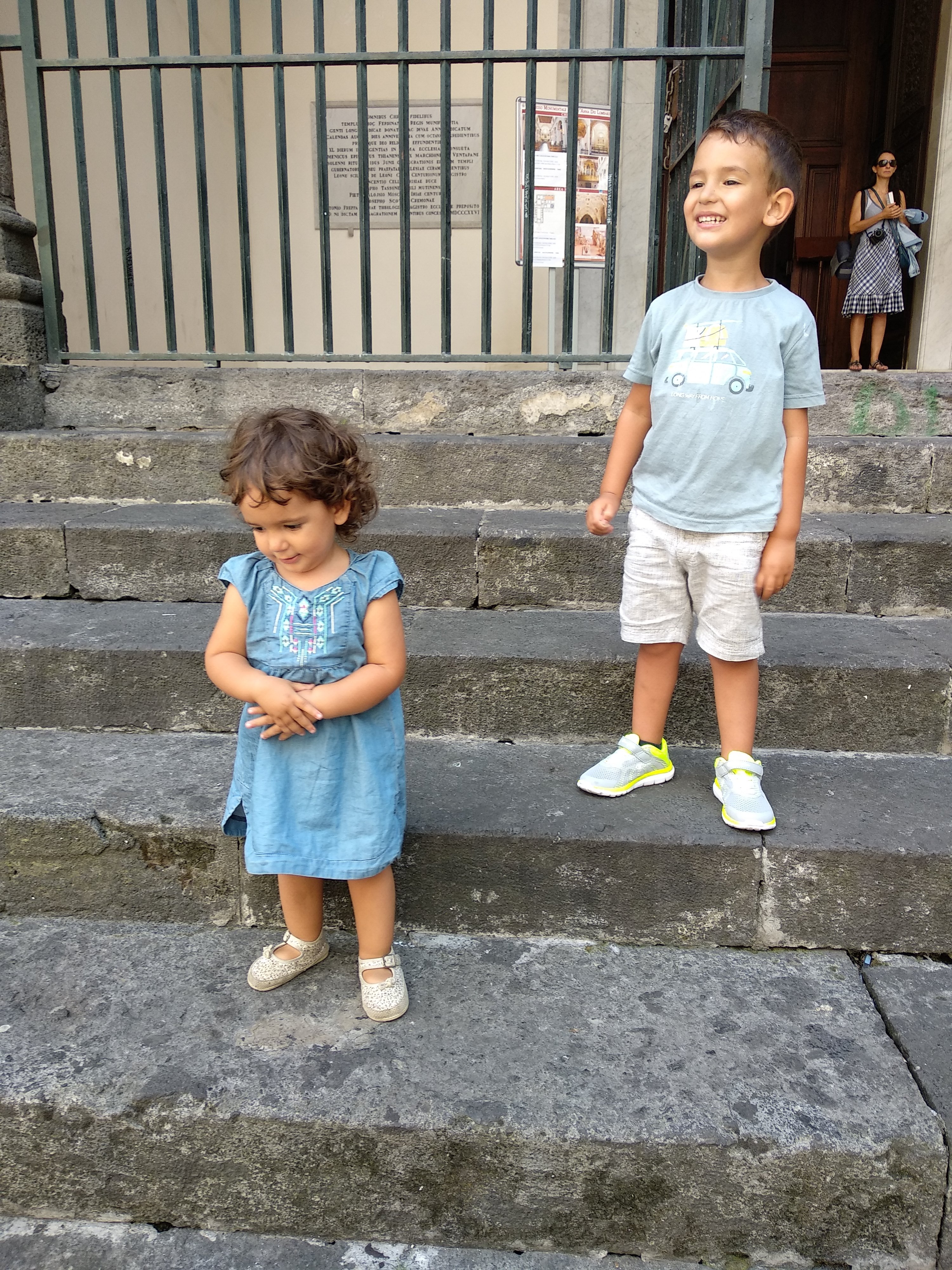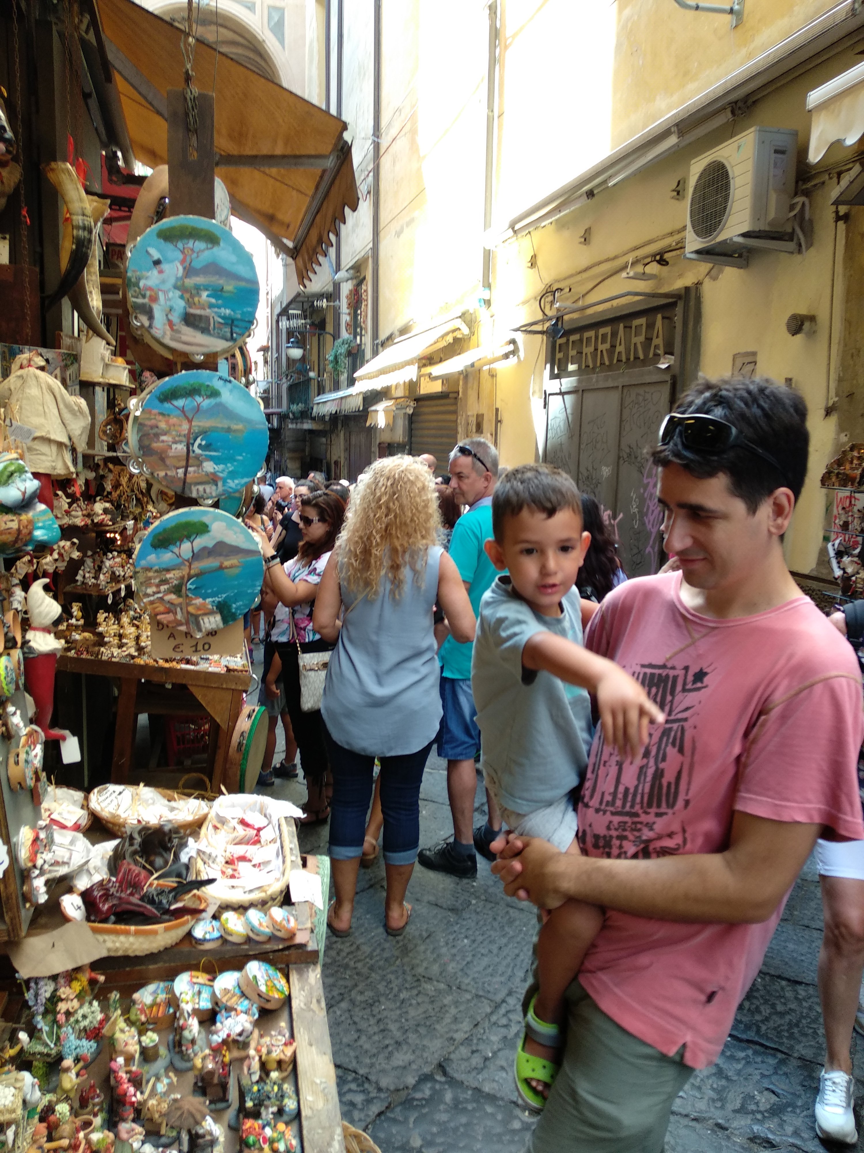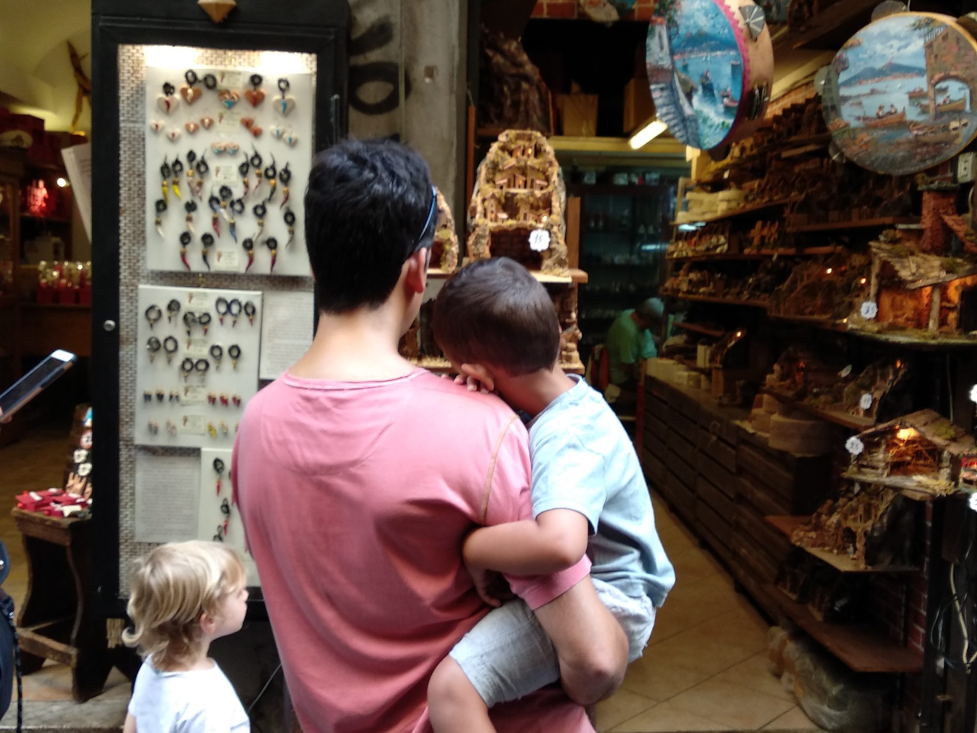Després d’esmorzar hem sortit tots 4, i hem anat a visitar el Centro Storico. El nostre apartament està molt ben situat, just al costat del centre, així que no hem hagut de caminar gaire per perdre’ns en un laberint de carrerons on, a banda d’esglésies a tutiplen (si no n’hem vist 50 en 3 hores no n’hem vist cap), hem trobat una zona amb botigues que venien els millors pessebres que hem vist mai. Ens hi hem estat una bona estona mirant-los, al Gerard també l’hi han agradat molt (la Jana s’ho ha perdut perquè dormia…). Avui feia molta calor, però com que els carrers són molt estrets, estan sempre a l’ombra, així que el passeig era molt agradable i súper entretingut.