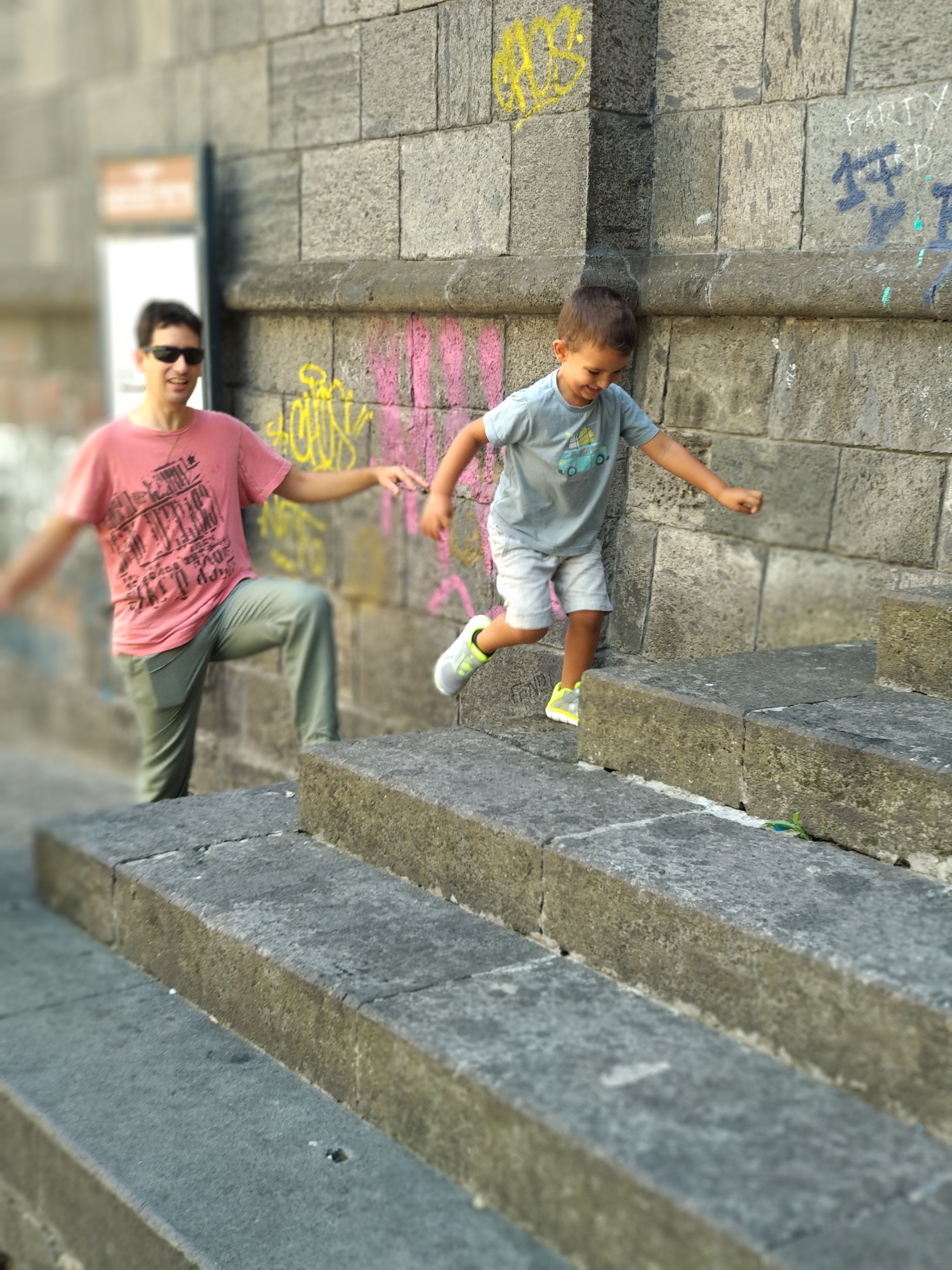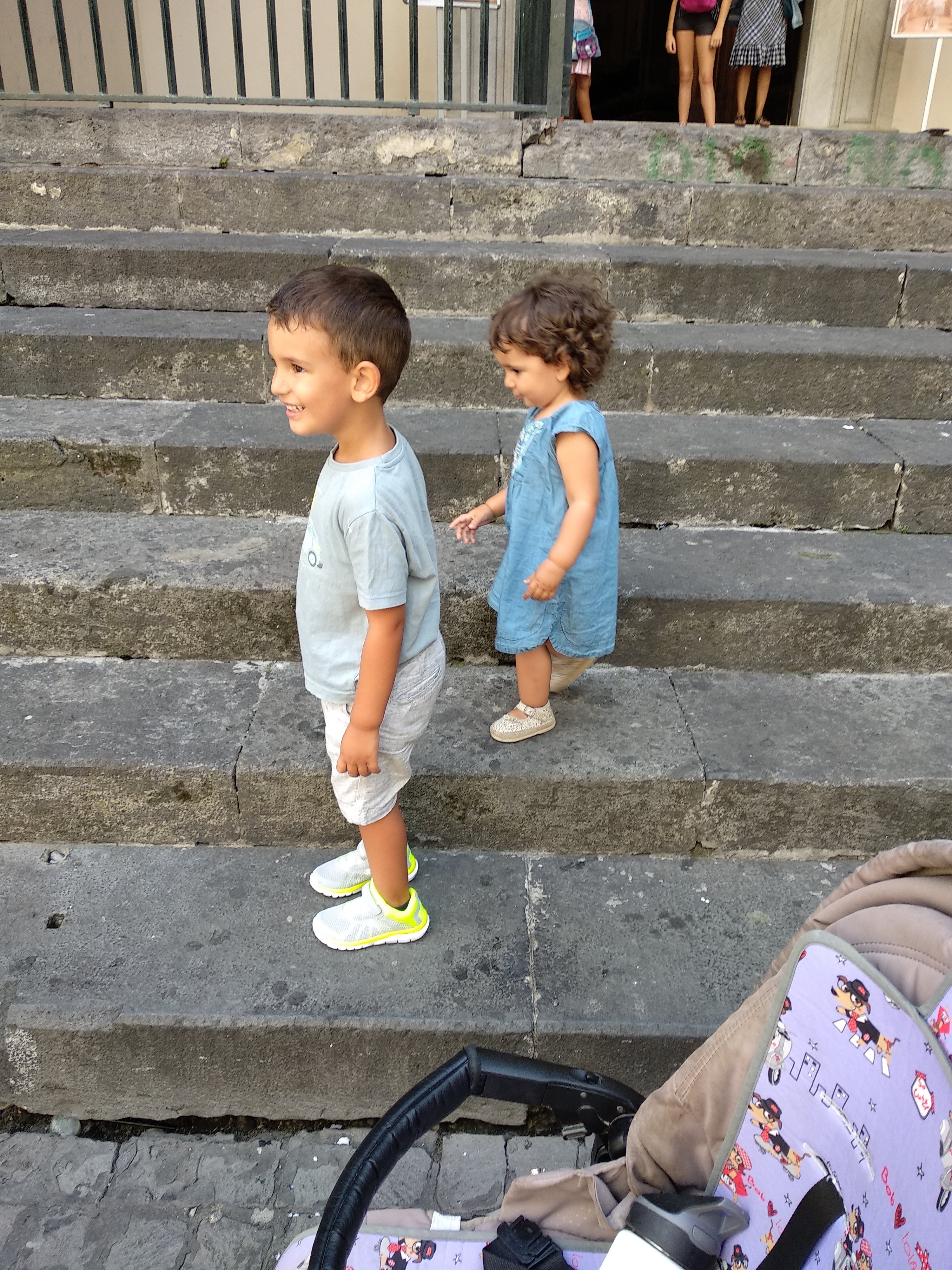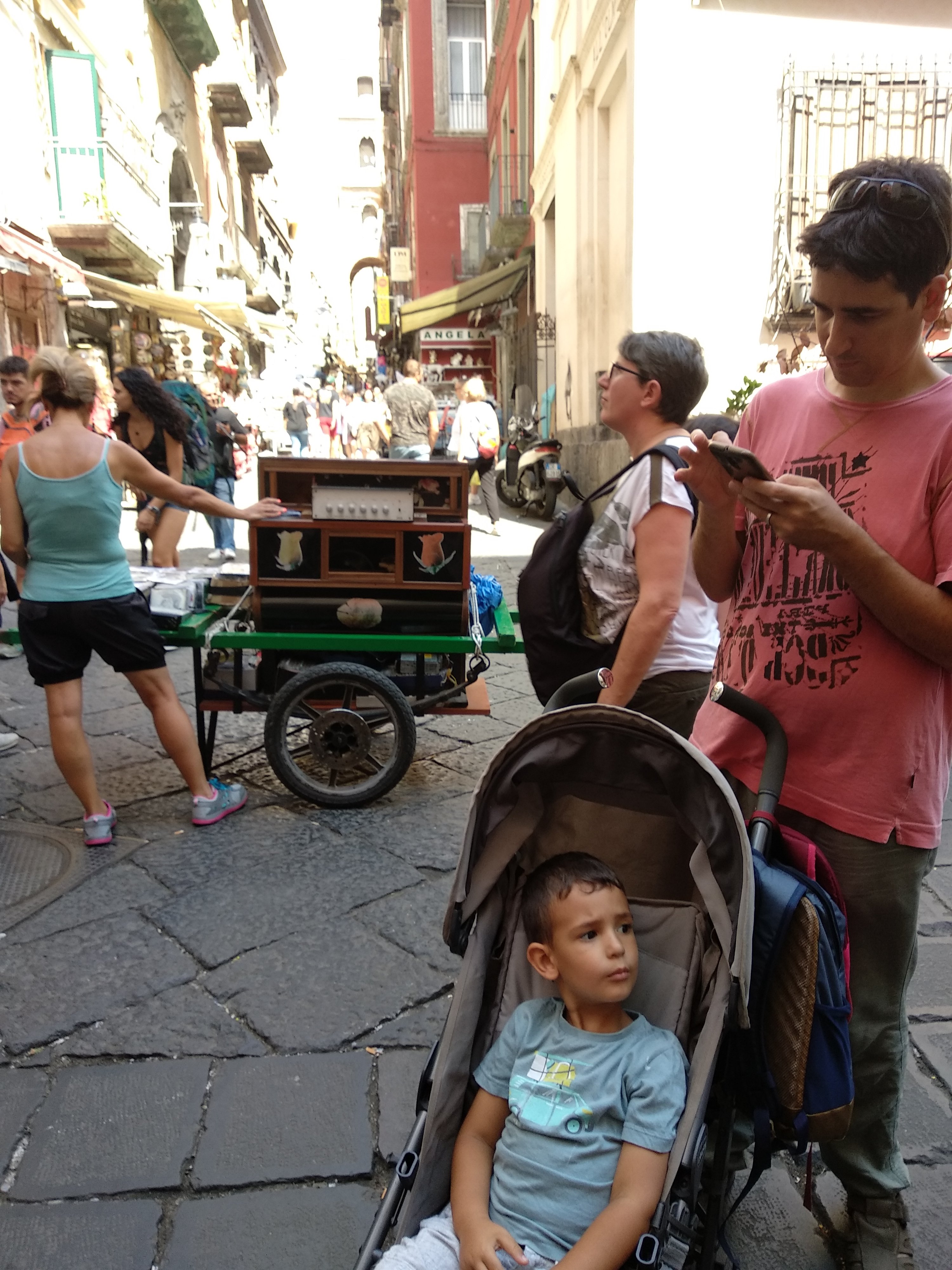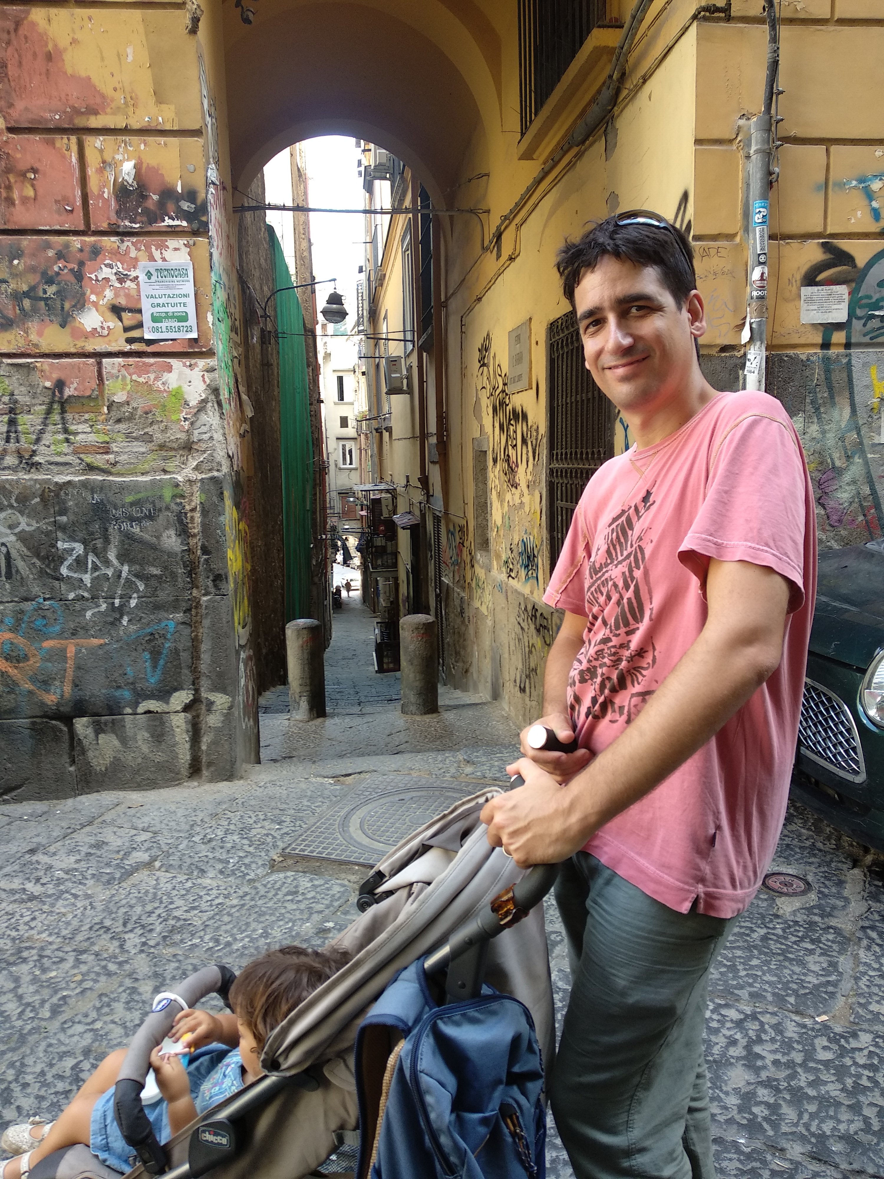 Així que a les 8 ja estàvem sortint per la porta de l’apartament. En 10 minuts ja m’he adonat que Nàpols és la ciutat europea menys europea en la que he estat. Els carrers són adoquinats i la majoria molt estrets, i estan plens de vida (mercats al carrer, motos saltant-se totes les normes de circulació, gent de tots colors, veïns fent el safareig amb unes cadires al portal de cases, …), fent que et submergeixis de seguida en un caos que em recordava molt les ciutats asiàtiques. L’Ernest deia que és una ciutat molt divertida, i és una molt bona definició. Ara feia temps que no viatjàvem així i la veritat és que m’ha agradat moltíssim.