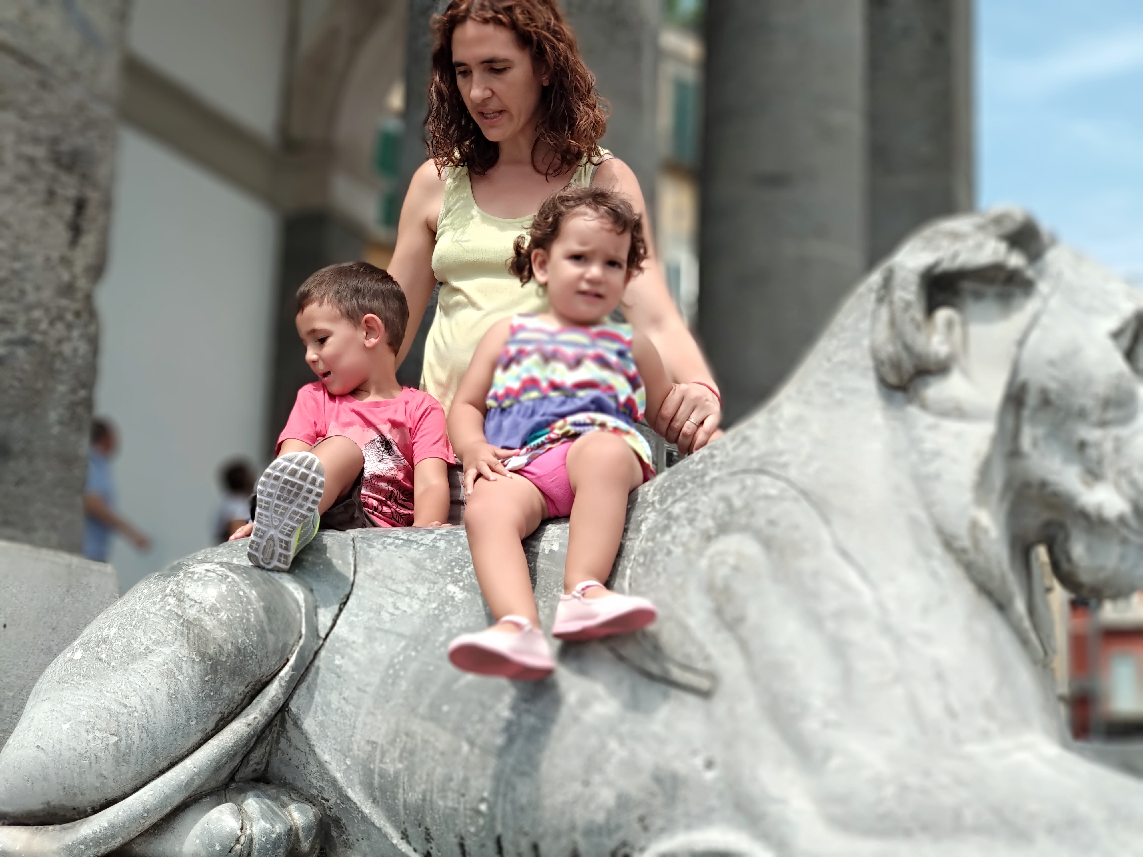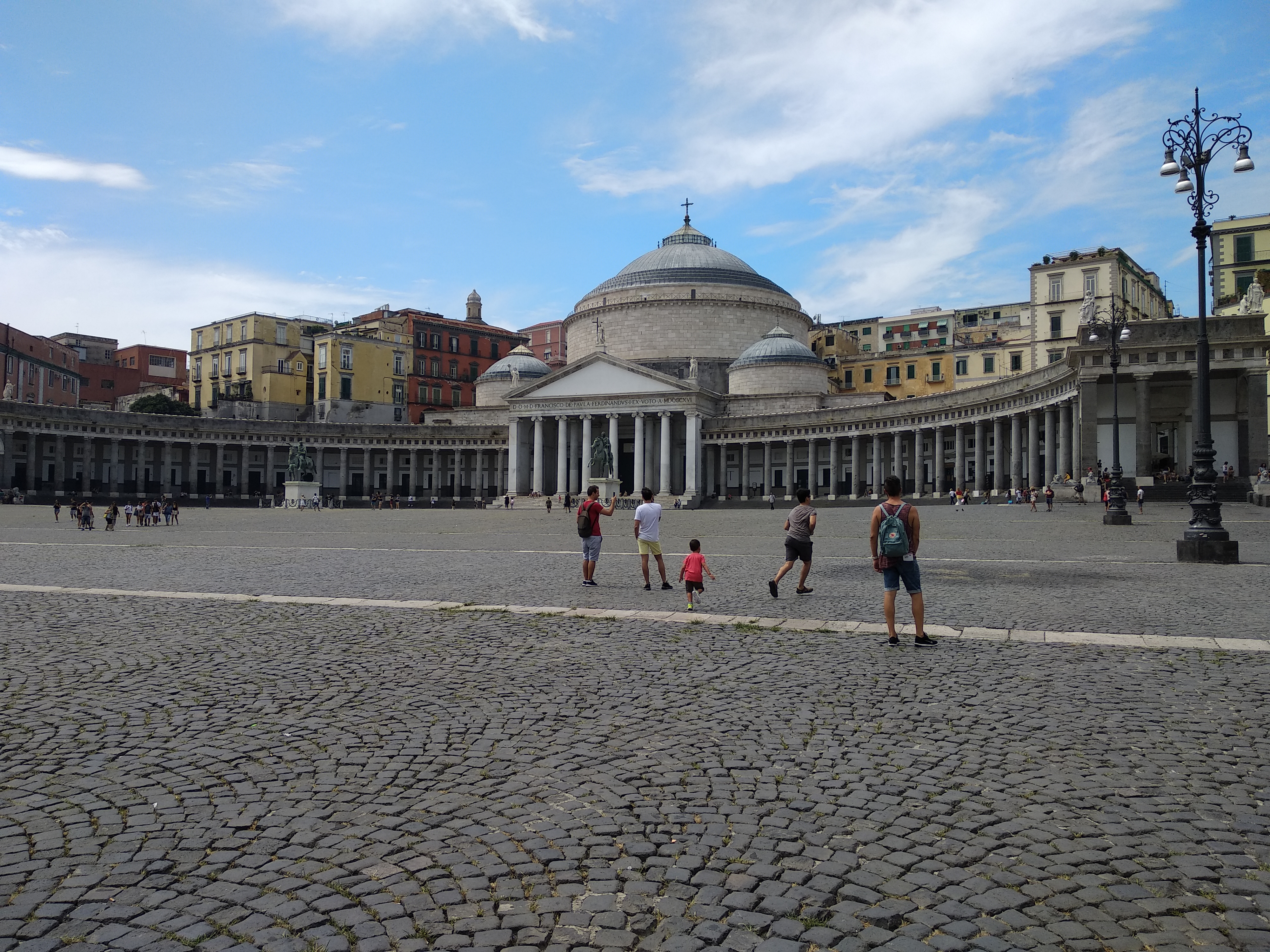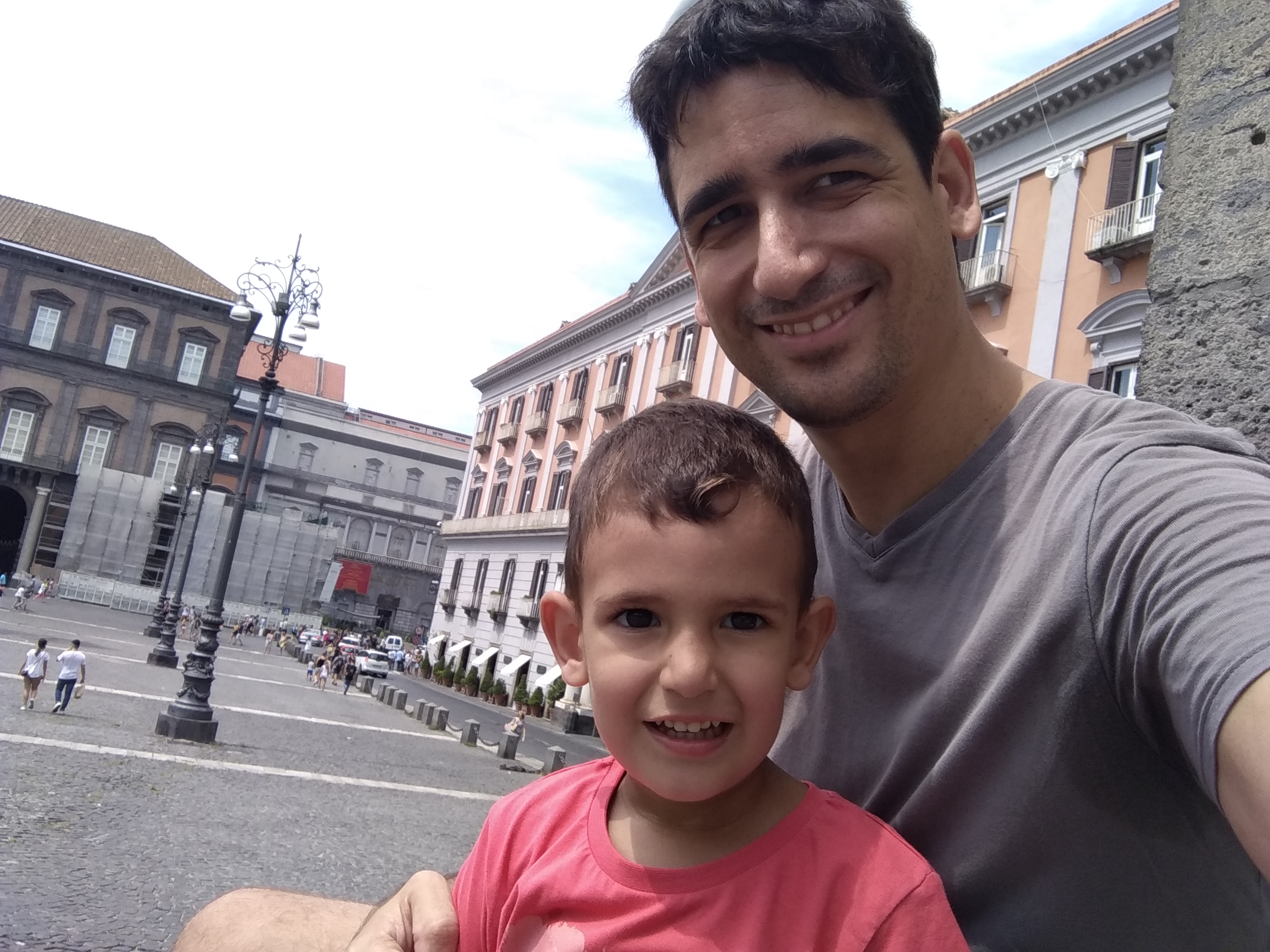 Hem baixat a la parada més propera al port i hem començat a caminar cap al Castel dell’Ovo. De camí hem trobat una plaça enorme (Piazza del Plebiscito) que recorda fortament al Partenó de Roma (la plaça del Vaticà). Es veu que fins fa 30 anys aquesta plaça la utilitzaven d’aparcament (aquest era el nivell de deixadesa de la ciutat cap als seus monuments), i quan la van recuperar li van posar aquest nom que significa “Plaça del poble”. Alla hem estat una bona estona jugant al pilla-pilla (és el que té viatjar amb nens petits, substitueixes visites a museus de fama mundial per córrer picant-te al cul amb una ampolla de plàstic a ple sol amb 30 graus de temperatura).