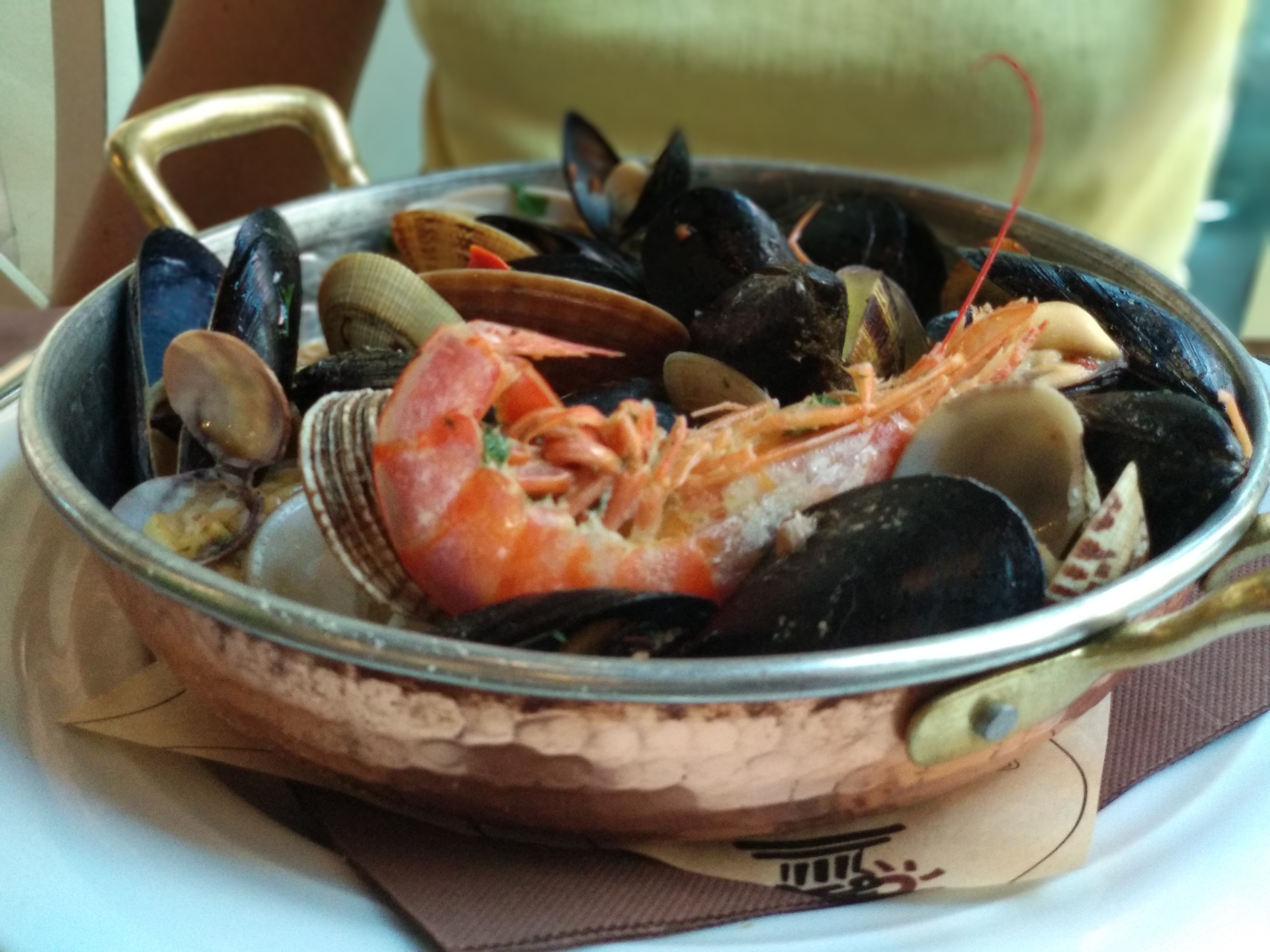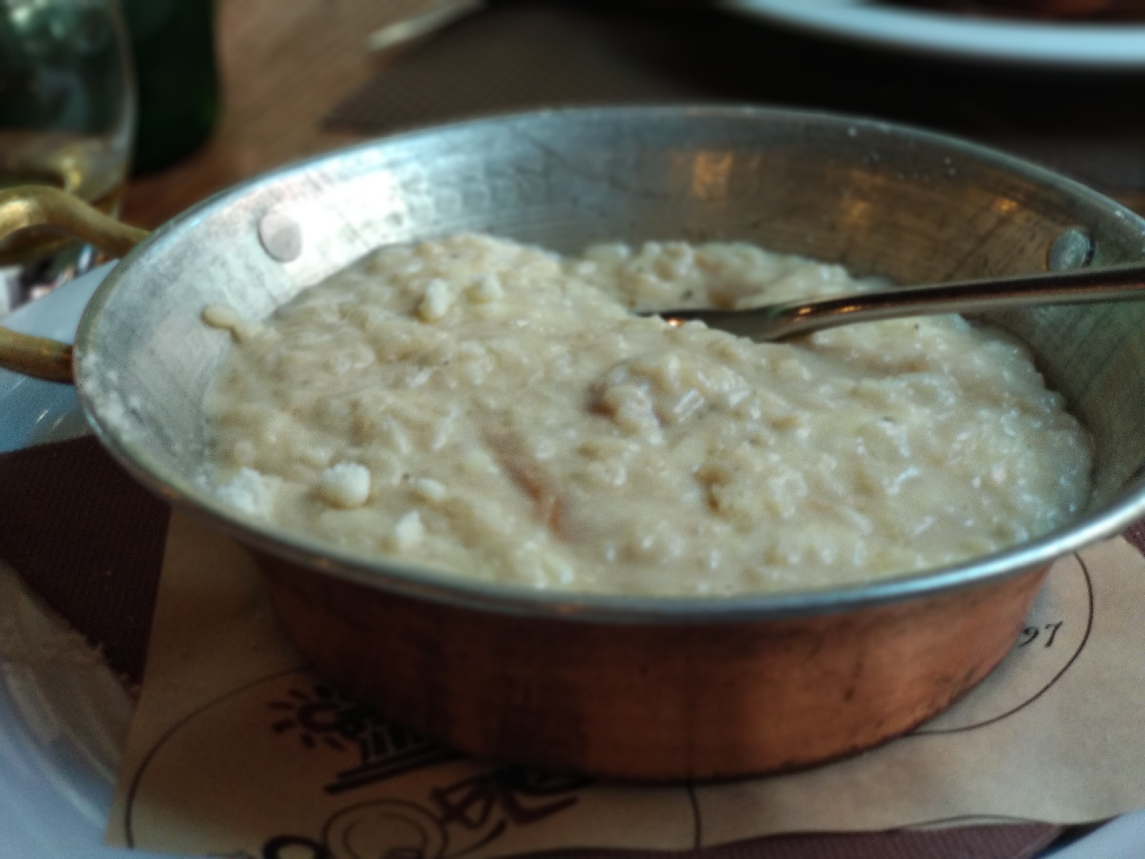 Hem parat (o ens han aturat, més aviat) per dinar en un restaurant molt gran que hi ha allà al costat. El lloc estava a petar de turistes, i els preus semblaven dignes de l’amo del castell que acabàvem de visitar. Entre això i una calor asfixiant a la terrassa, ens hem aixecat sense arribar a demanar. I hem fet ben fet, perquè en 5 minuts caminant hem trobat un restaurant gairebé buit on hem menjat un rissotto ai frutti di mare i un altre ai funghi que estaven per llepar-se els dits (presentats en una cassoleta de llauna). Una relació qualitat-preu excel·lent (40€ amb un entrant, beguda i cafè, i hem acabat més que tips).