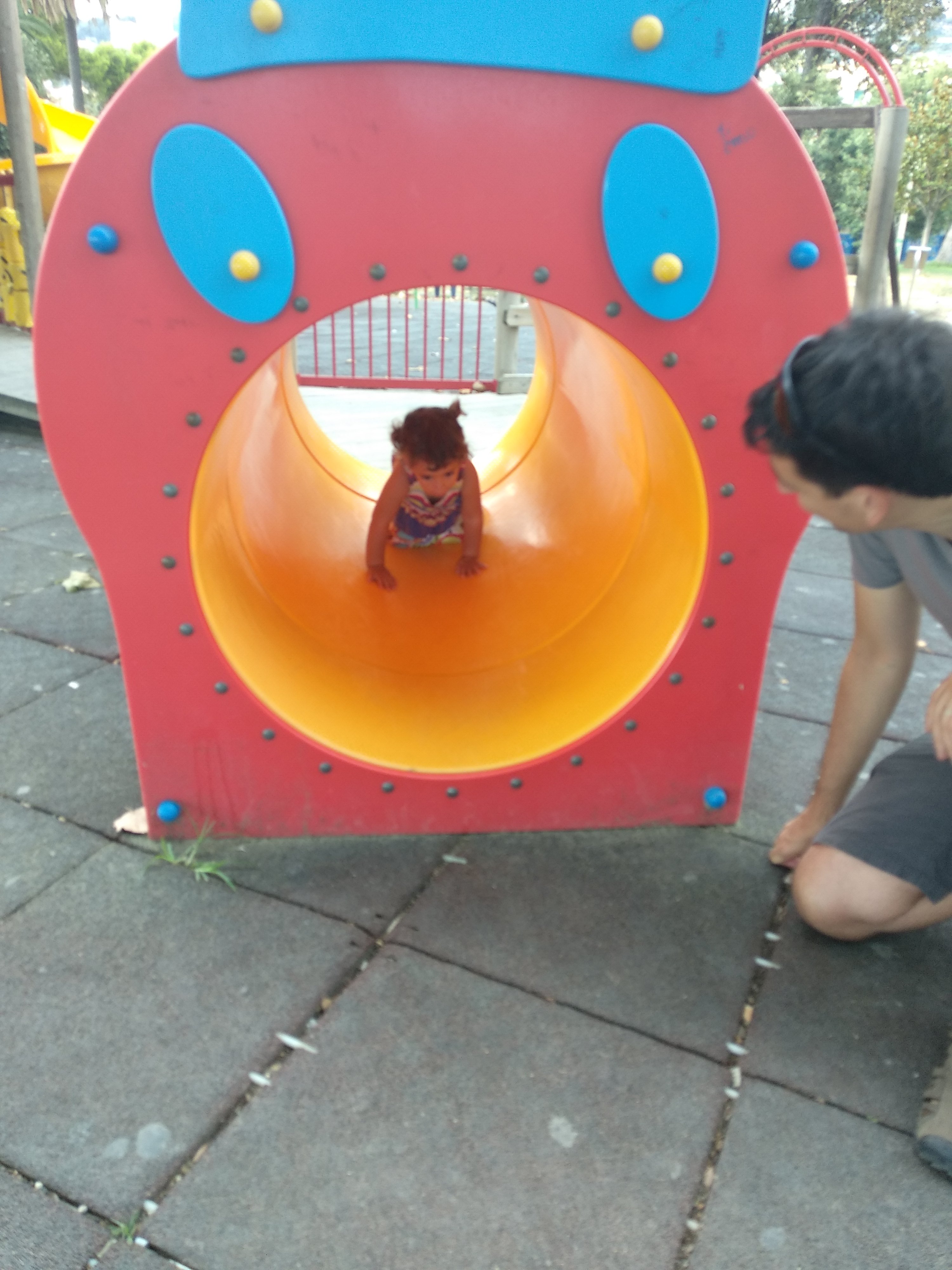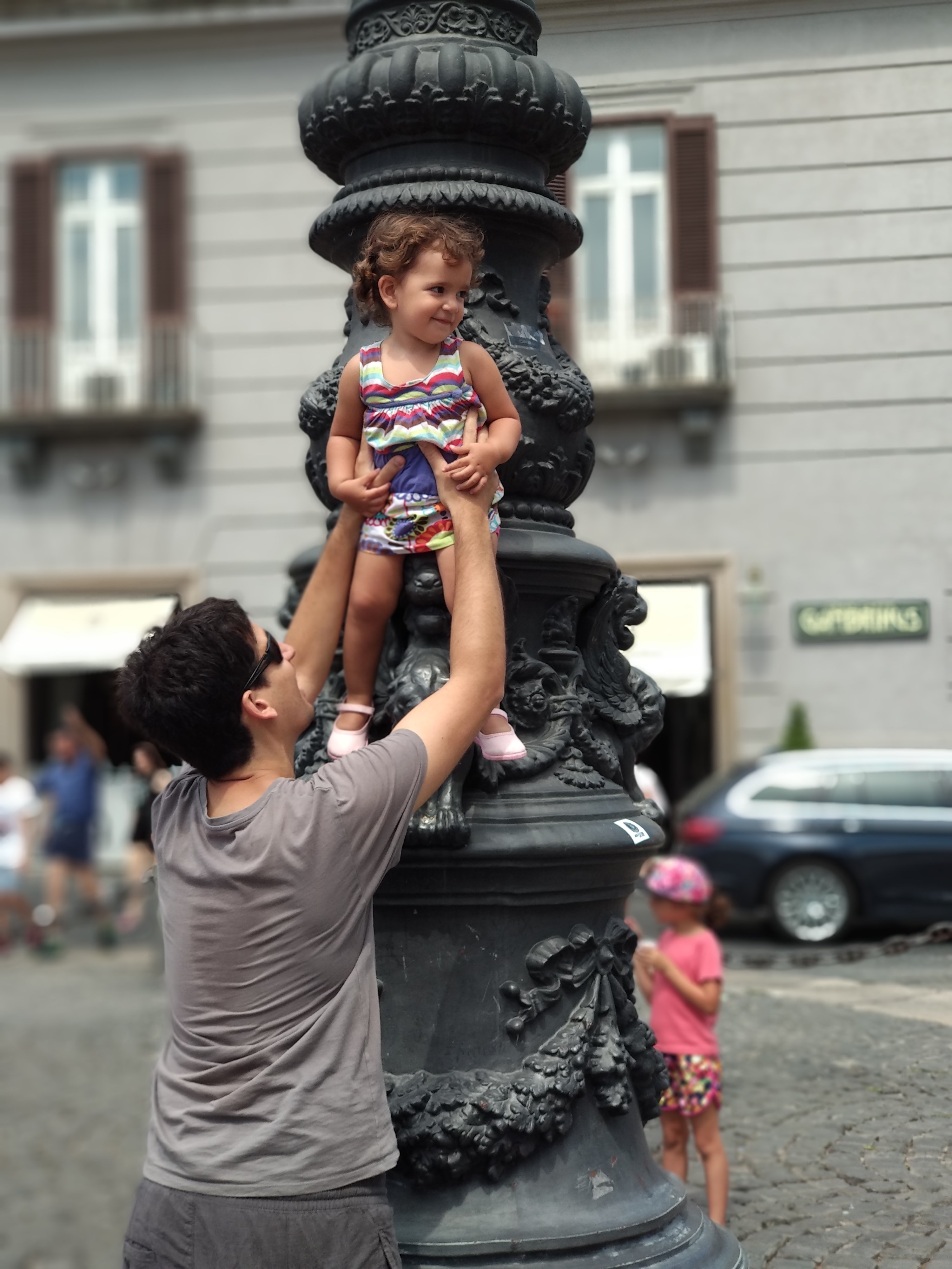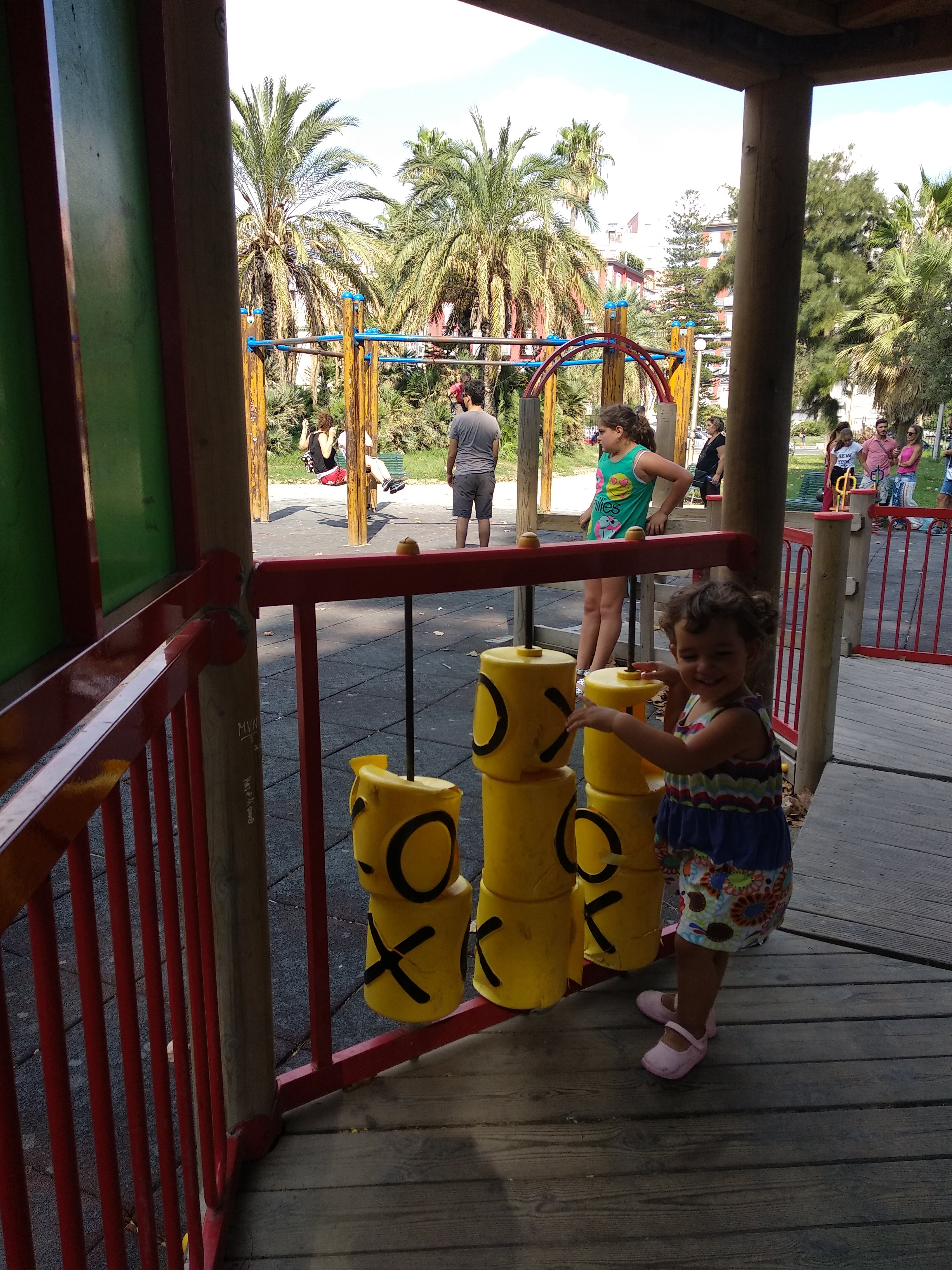 Des de dalt del Castel dell’Ovo havíem vist un gran parc (Villa Communale) que està al costat del mar, molt a prop d’on érem. I via Google Maps (activant la visió per satèl·lit) havíem descobert… un parc infantil! Així que hi hem anat. De fet n’hem vist tres a tot Nàpols: aquest, un que hi havia dins d’un conjunt monàstic al centre, i un altre que estava tot just a un minut del nostre apartament. Però no sabem per quins set sous aquest és l’únic que no estava en obres. Així que ens hi hem estat una bona estona, per treure’ns el mono (és evident que jo tenia un mono immens de poder estar gaudint de la sensació de fregir-me mentre vaig empenyent un gronxador, quan podria estar patint bevent-me una cervesa fresqueta en un bar amb aire condicionat al costat del mar).