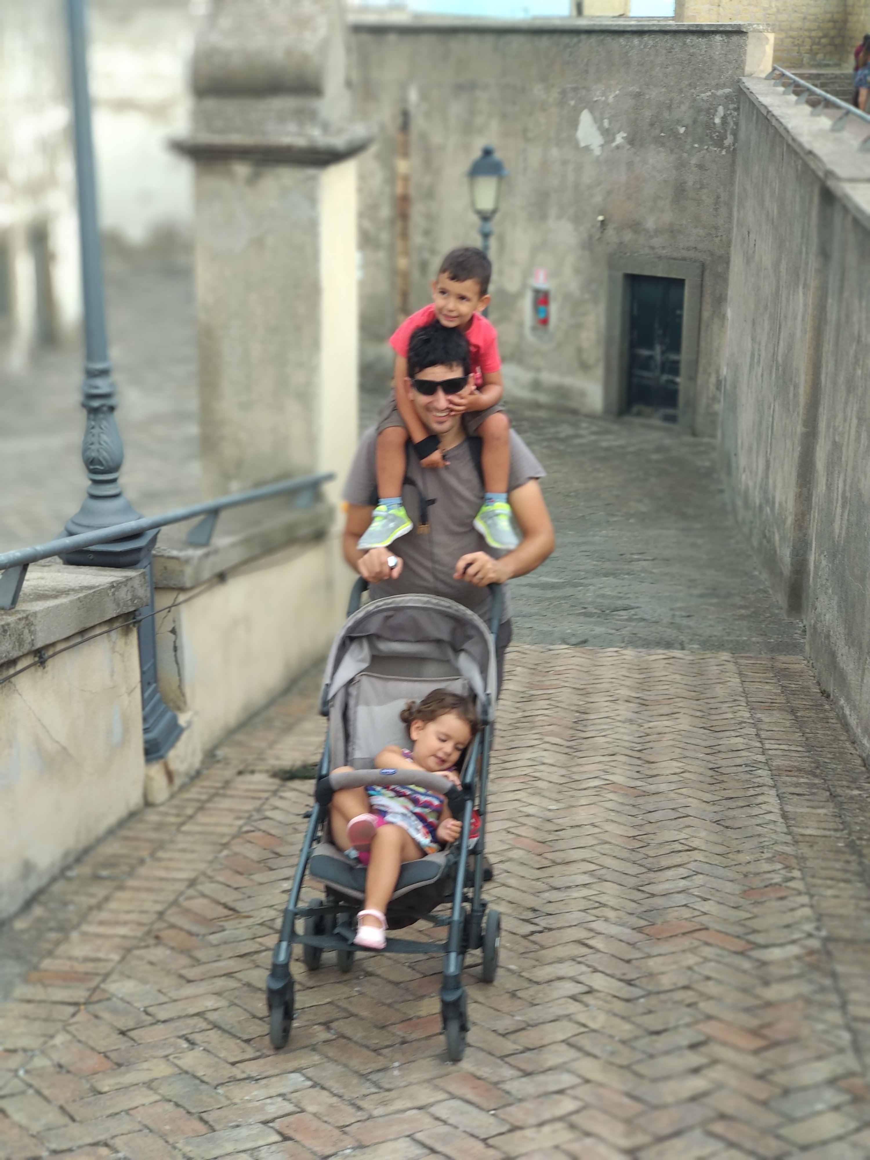 Clar que com a contrapartida l’ampli passeig marítim està a ple sol, així que no hem suat per la pujada però sí per la calor. Hem trigat uns 15 minuts fins al castell. Quan hi hem arribat el Gerard i la Jana ja estaven en mode “low battery”, i com era previsible a l’edat mitjana no acostumaven a instal.lar ascensors als castells (i tampoc crec que al s. XIII hi hagués gaires turistes amb cotxets a Nàpols), així que la visita ha estat parcial i a torns. De tota manera, l’entrada és gratuïta i des de dalt del castell hi ha unes bones vistes, així que ha valgut la pena.