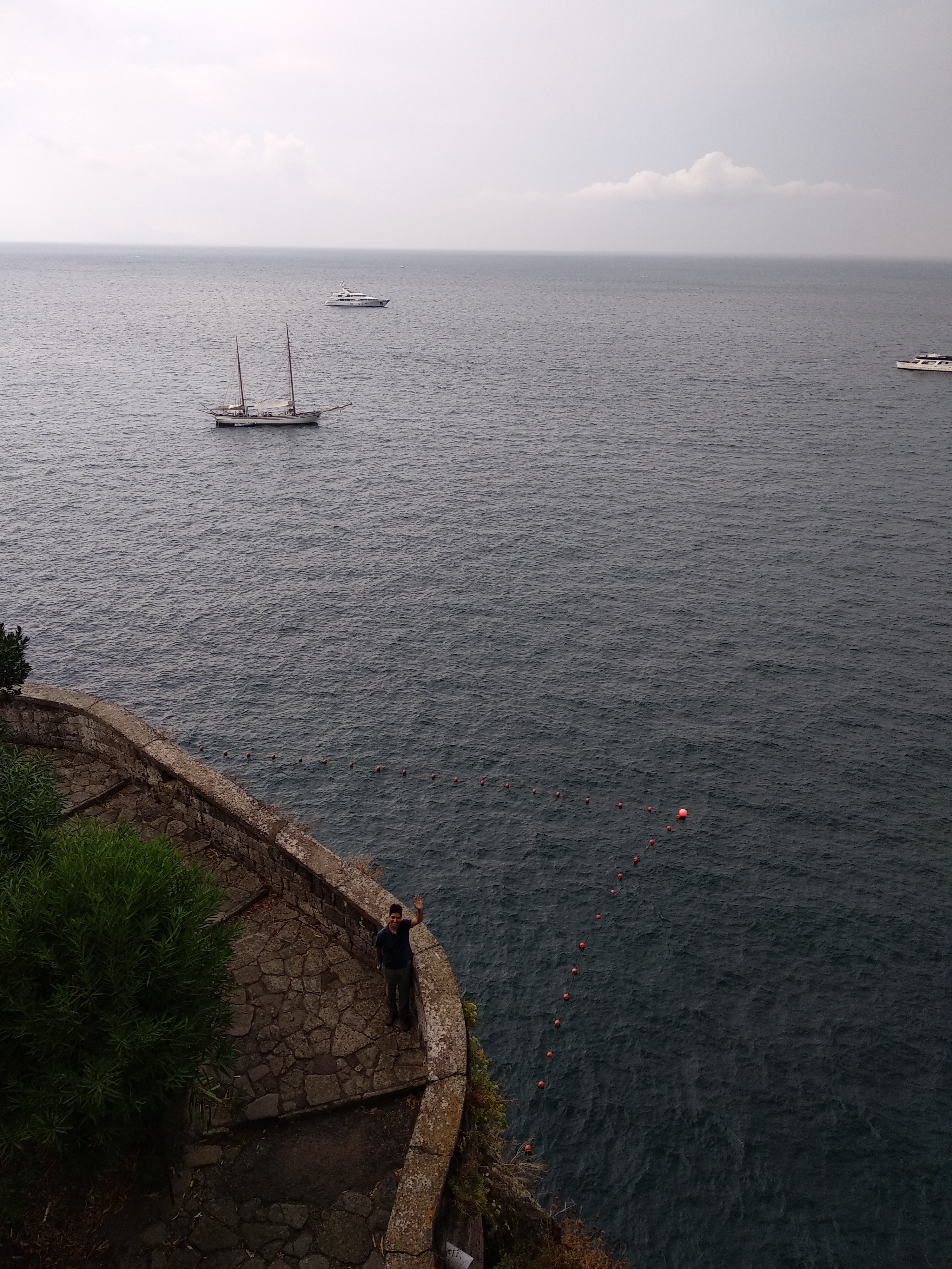 Mentre els nens dormien ha començat a ploure a bots i barrals. Hem aprofitat que ha escampat per baixar cap al poble. El mar és a uns 20 minuts caminant de la villa, i curiosament el camí més directe va a parar a l’hotel Mediterraneo, que és on es van allotjar la Sílvia & co quan van estar per aquí. El carrer acaba en un penya segat i a baix de tot hi ha la platja; pots baixar (i pujar!) caminant per un camí que passa per unes coves i túnels del penya segat o pots agafar un ascensor per 1€. Havíem decidit la opció gandula, però estava plovent novament i ens han dit que l’ascensor estava tancat. Com que no teníem intenció de pujar 30 metres caminant arrossegant nens i cotxet, hem decidit que ja tornarem un altre dia.