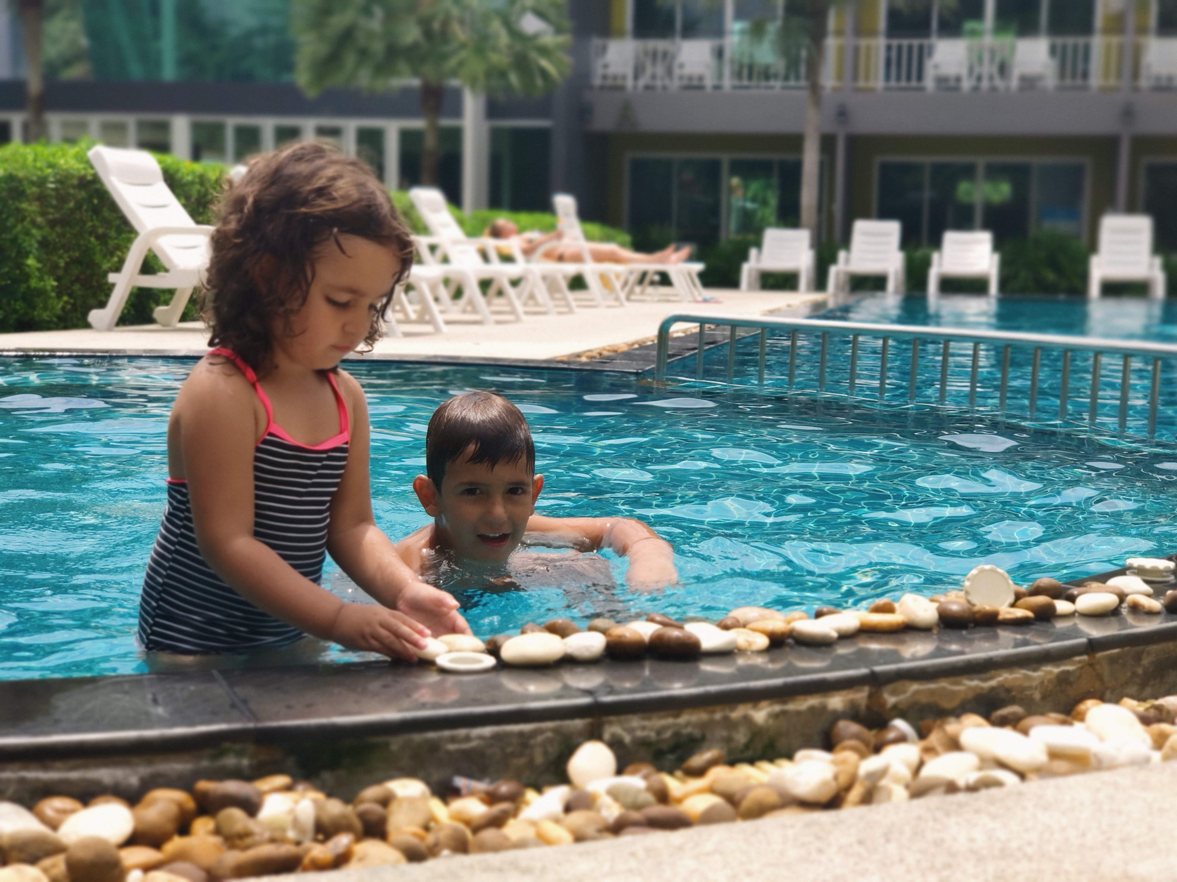 Abans, a primera hora, hem anat a la platja. Ls Jana s’ha negat en rodó a entrar “a casa, a casa, anava dient”; el Gerard sí que s’hi ha estat una estona però també s’ha cansat. Ara, quan han vist la piscina de l’hotel, la cosa ha estat radicalment diferent. Ens hi hem estat més d’una hora, i els hem hagut d’arrossegar per anar a dinar!