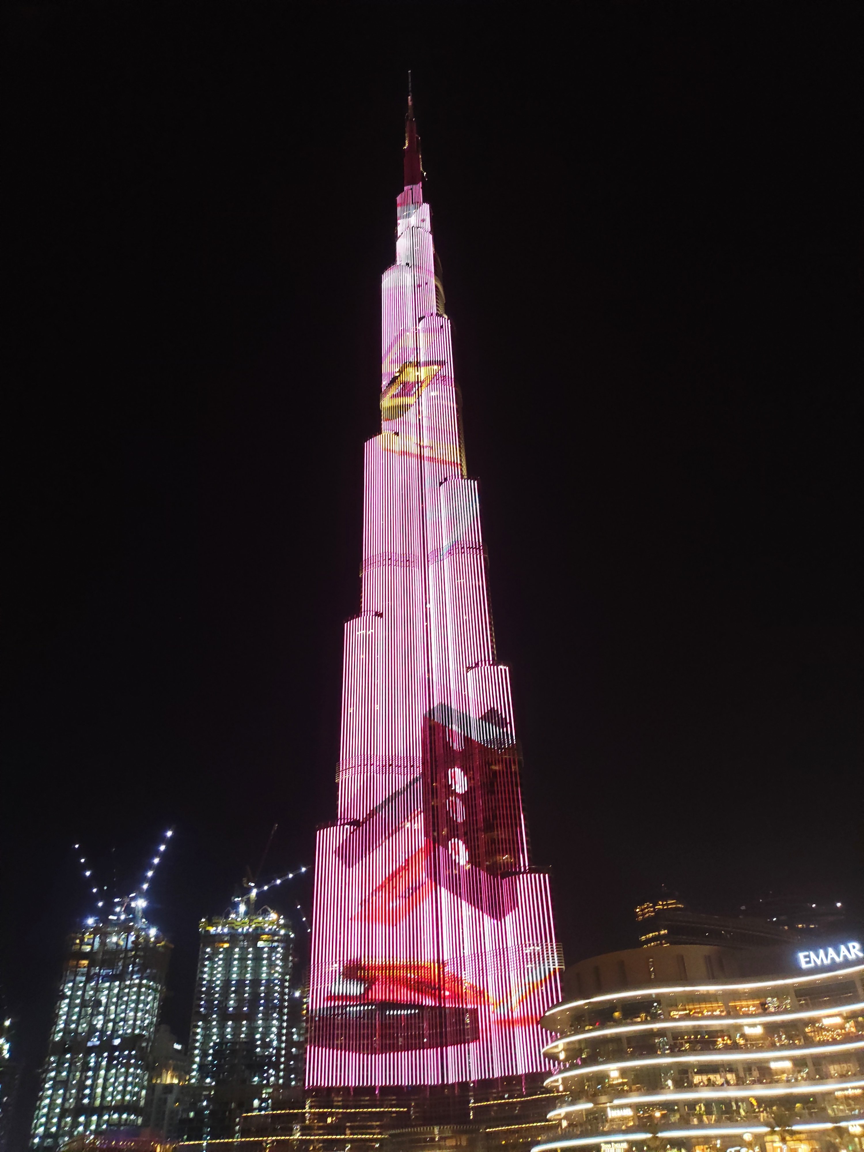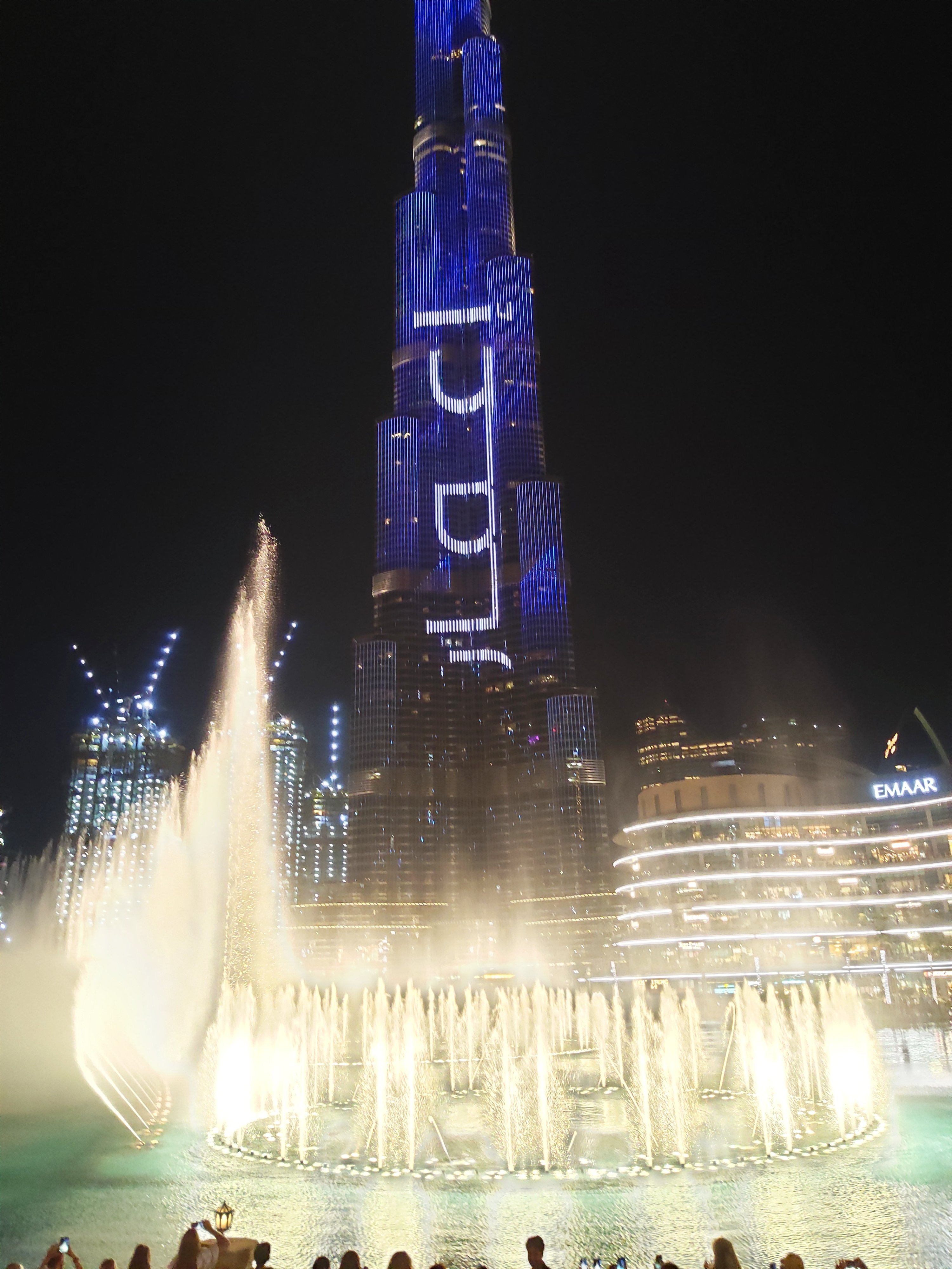 Mentre fan l’espectacle de les fonts, tot el Burj Khalifa s’il-lumina amb imatges en moviment
