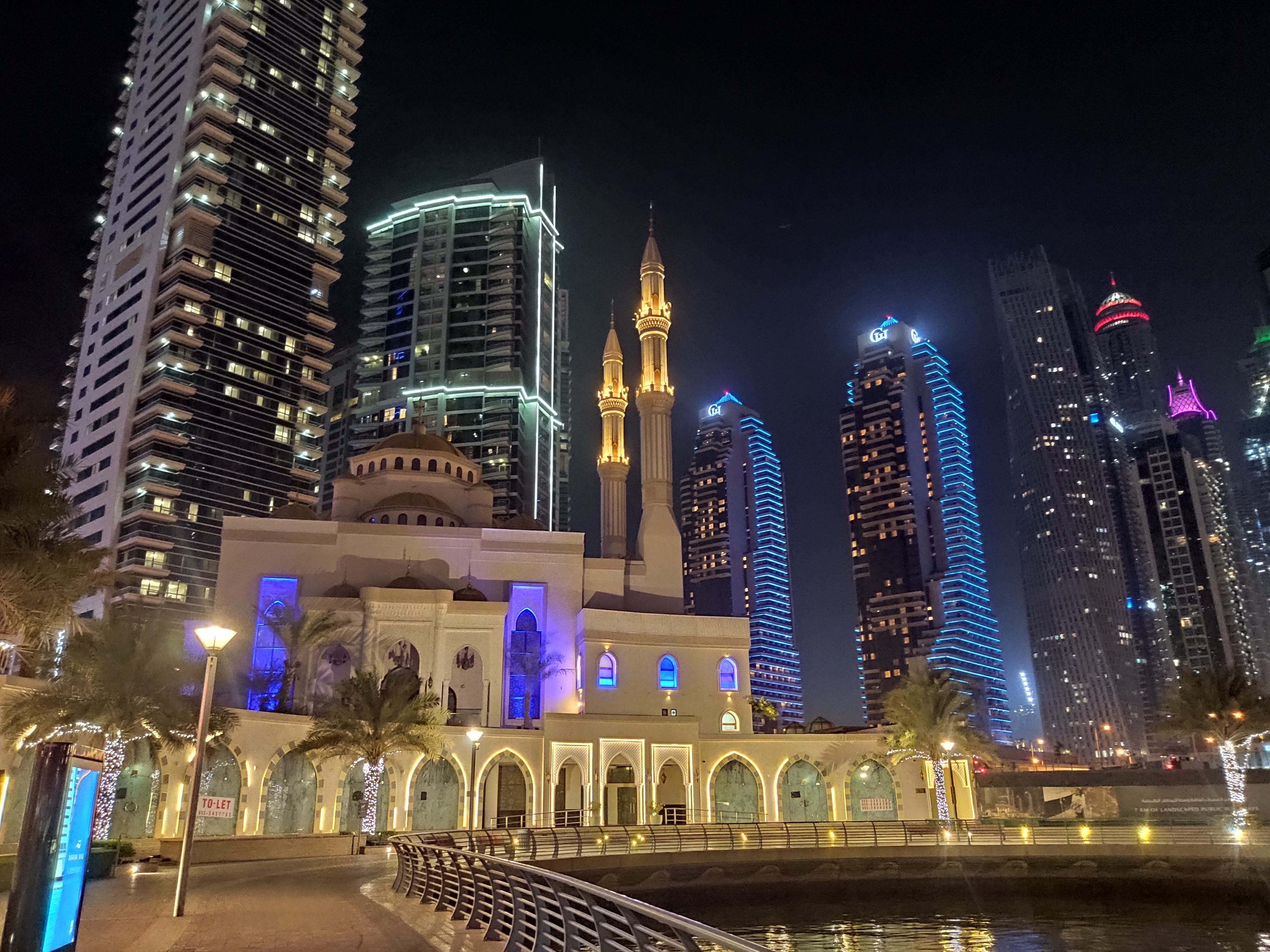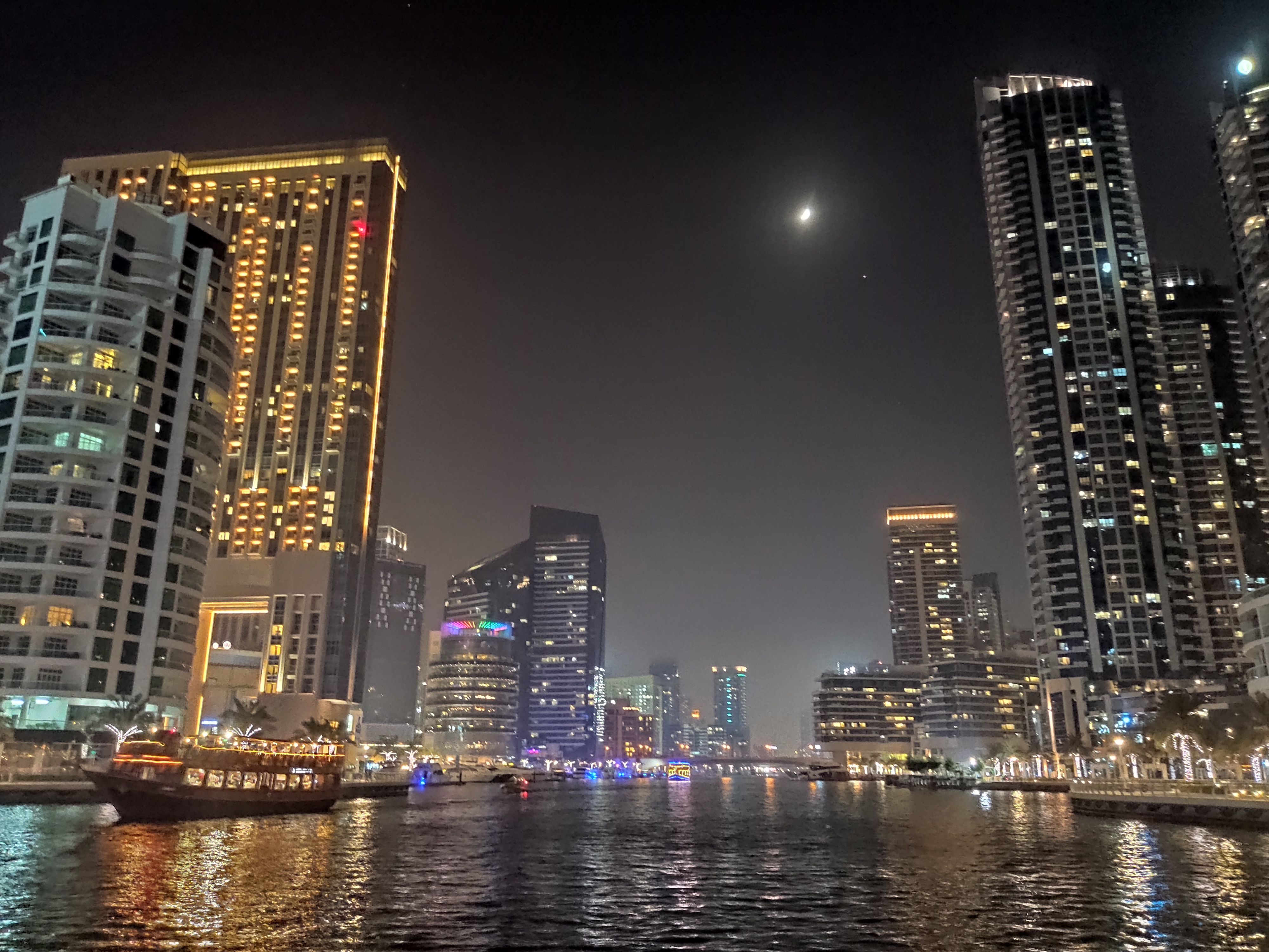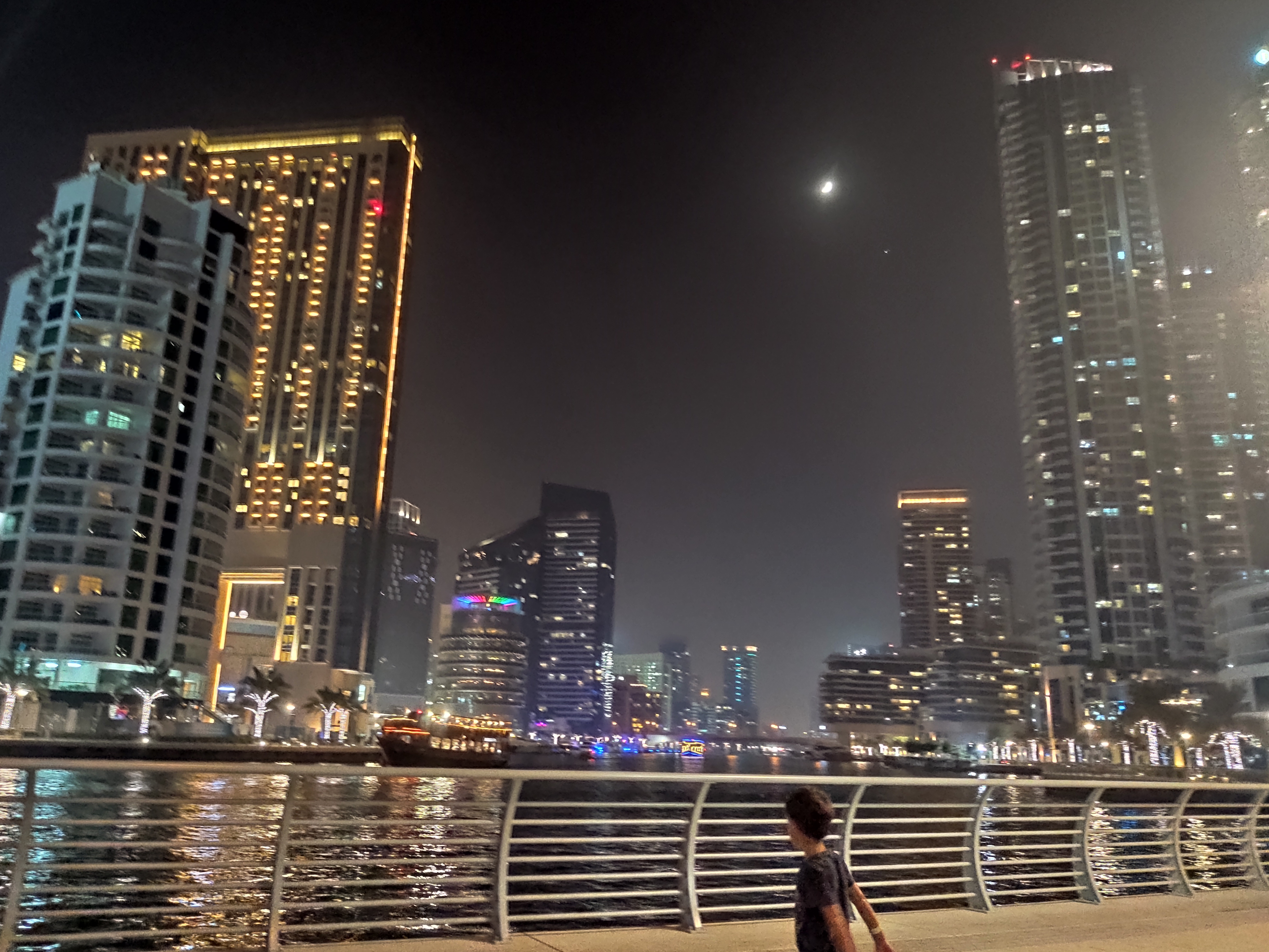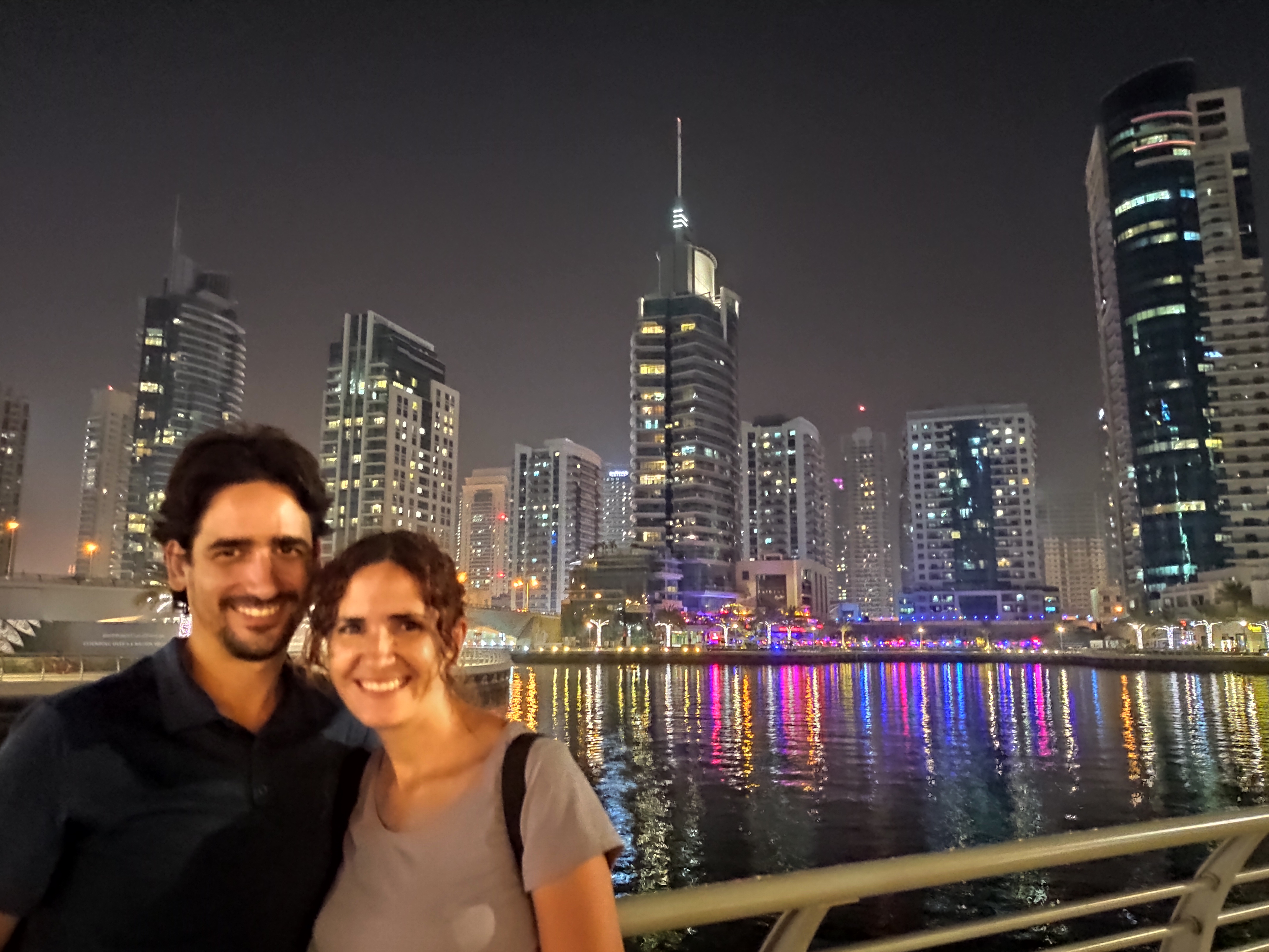 Quan hem sortit del museu ja era fosc i ja no feia tanta calor, la temperatura havia baixat en picat. JA! I un huevo! Enlloc de 40 graus estàvem a 39 i mig. Mig defallits hem aconseguit tornar al metro. Ens dirigíem a Dubai Marina, una zona de gratacels al costat del mar, que és espectacular i ens ha encantat. Té un passeig de més de 7km des d’on es veu tot l’skyline de la zona, amb els gratacels il-luminats. És molt xulo de veure, tot i que la calor seguia sent inhumana.