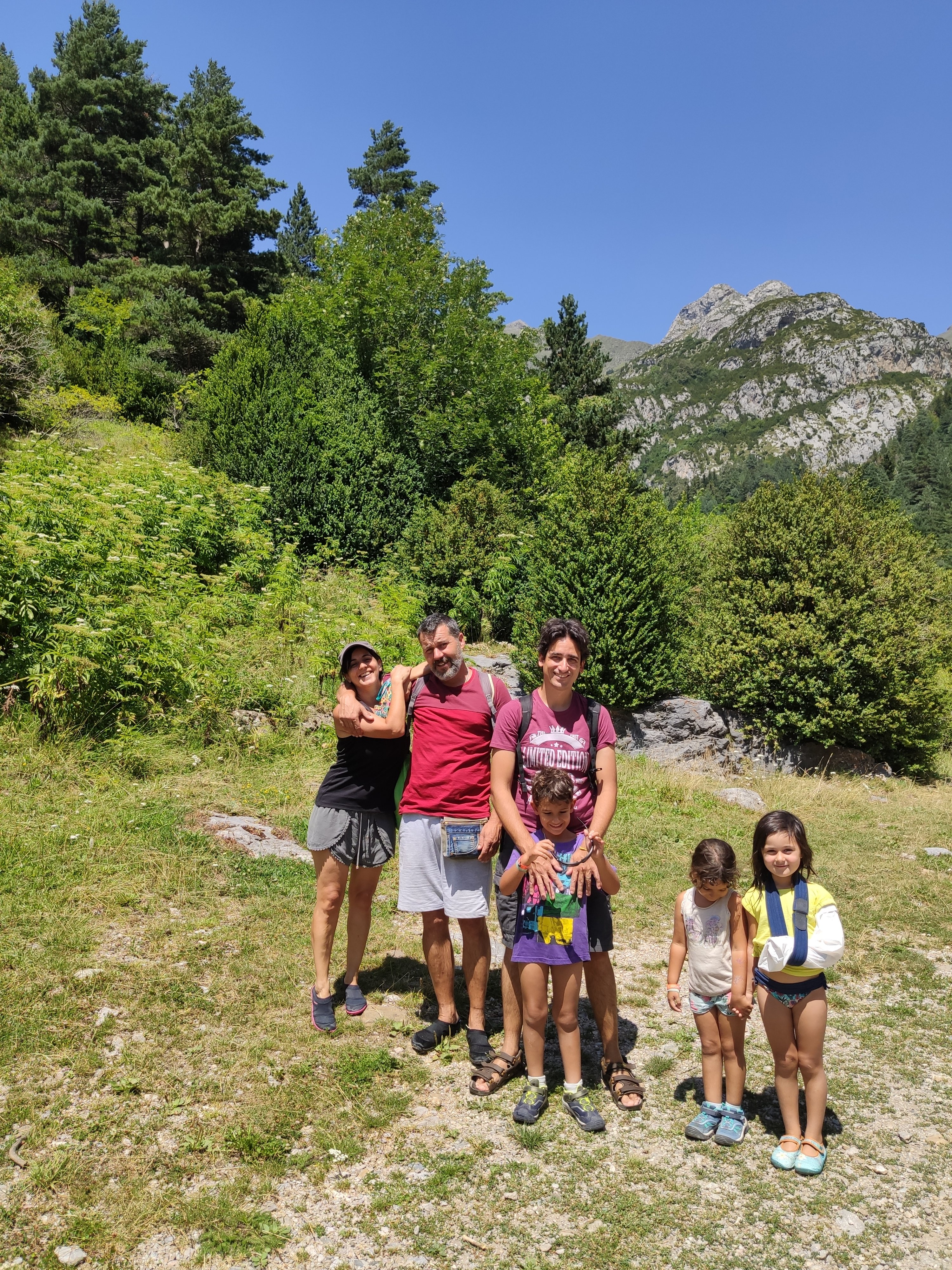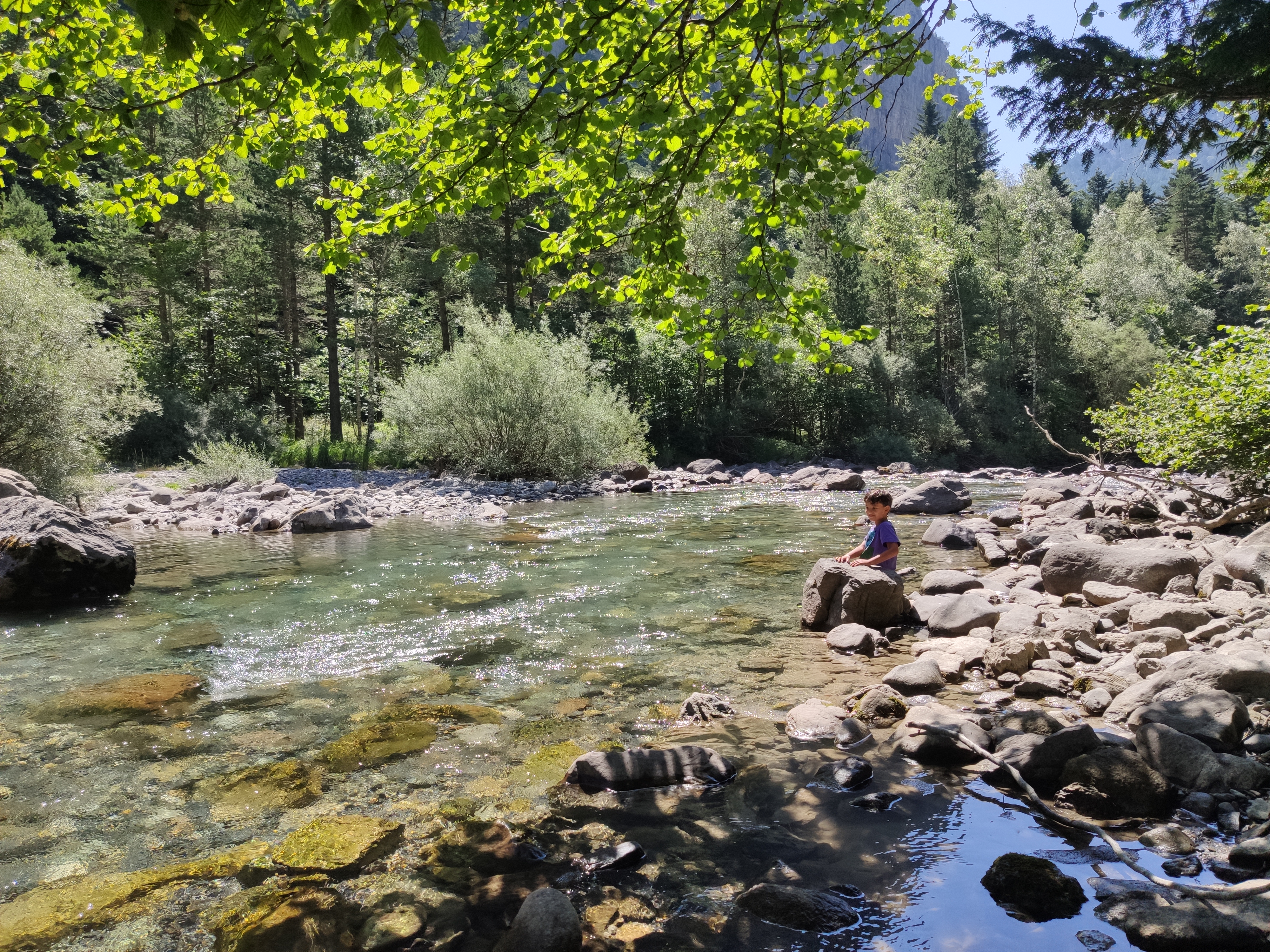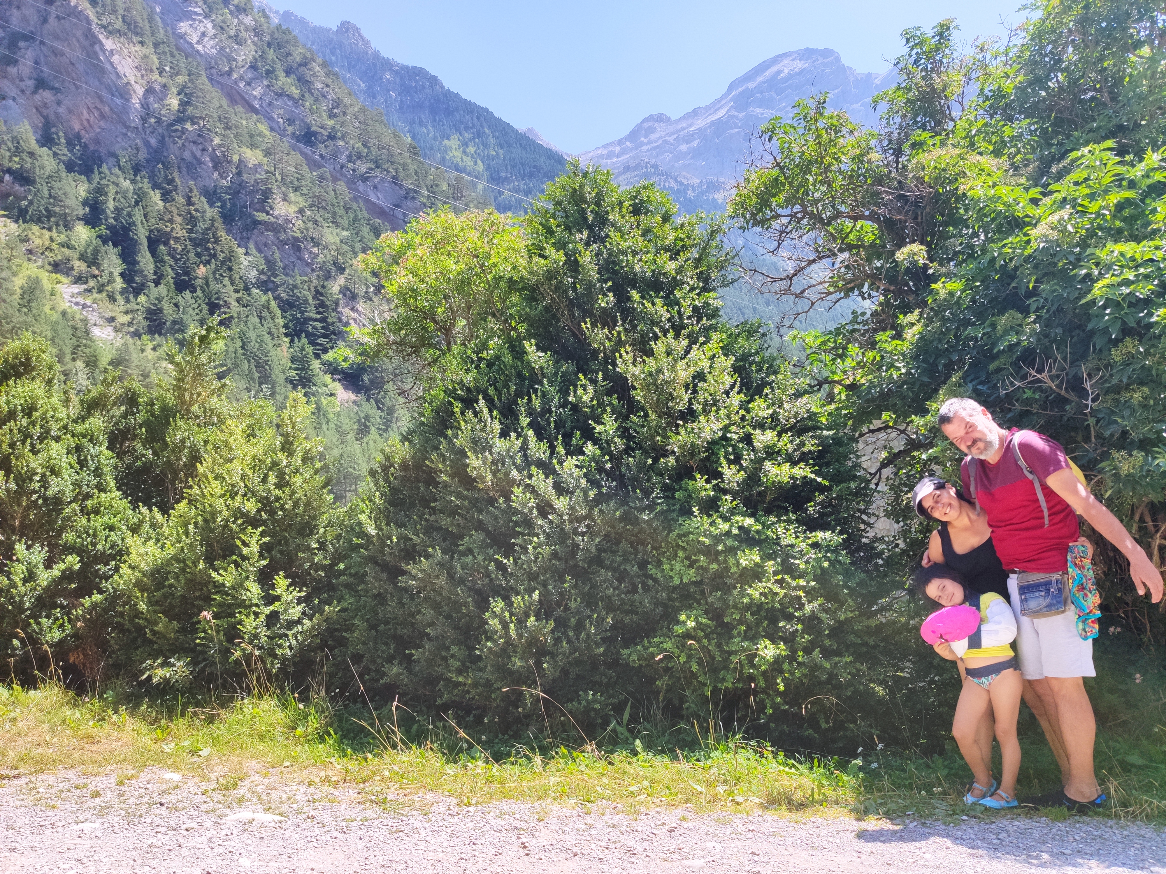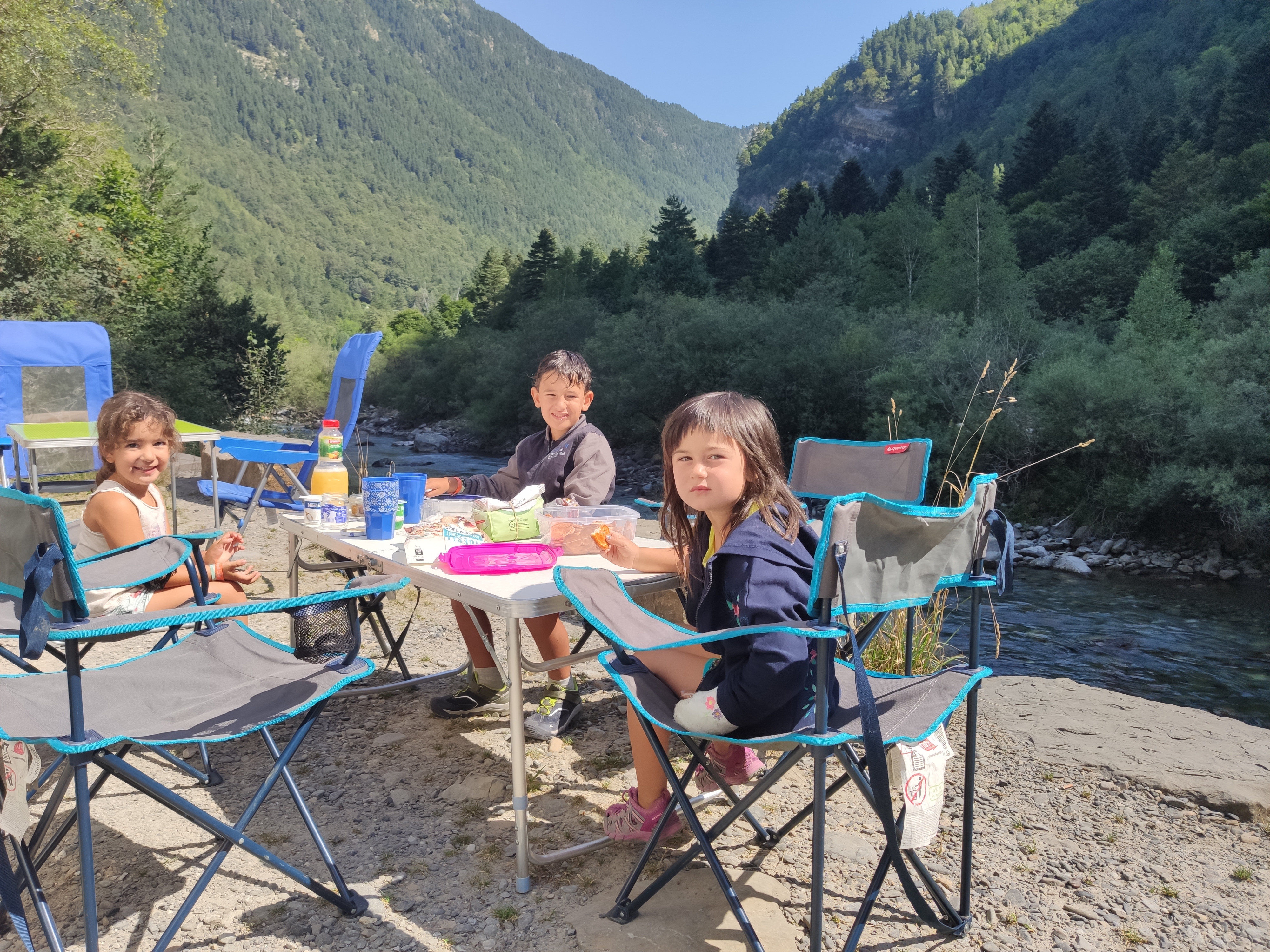Ens vam llevar tard (com de costum, però tenint en compte que el dia abans havíem estat jugant -els adults- al Carcassonne fins les 2 de la matinada, no va ser cap sorpresa) i vam enfilar cap a la vall de Bujaruelo. A 1km del lloc on havíem passat la nit comença una pista mig asfaltada que corre al costat del riu. A uns 2km ens vam aturar al marge i vam parar taula per esmorzar (els nens van alleugerir per poder remullar els peus al riu).
