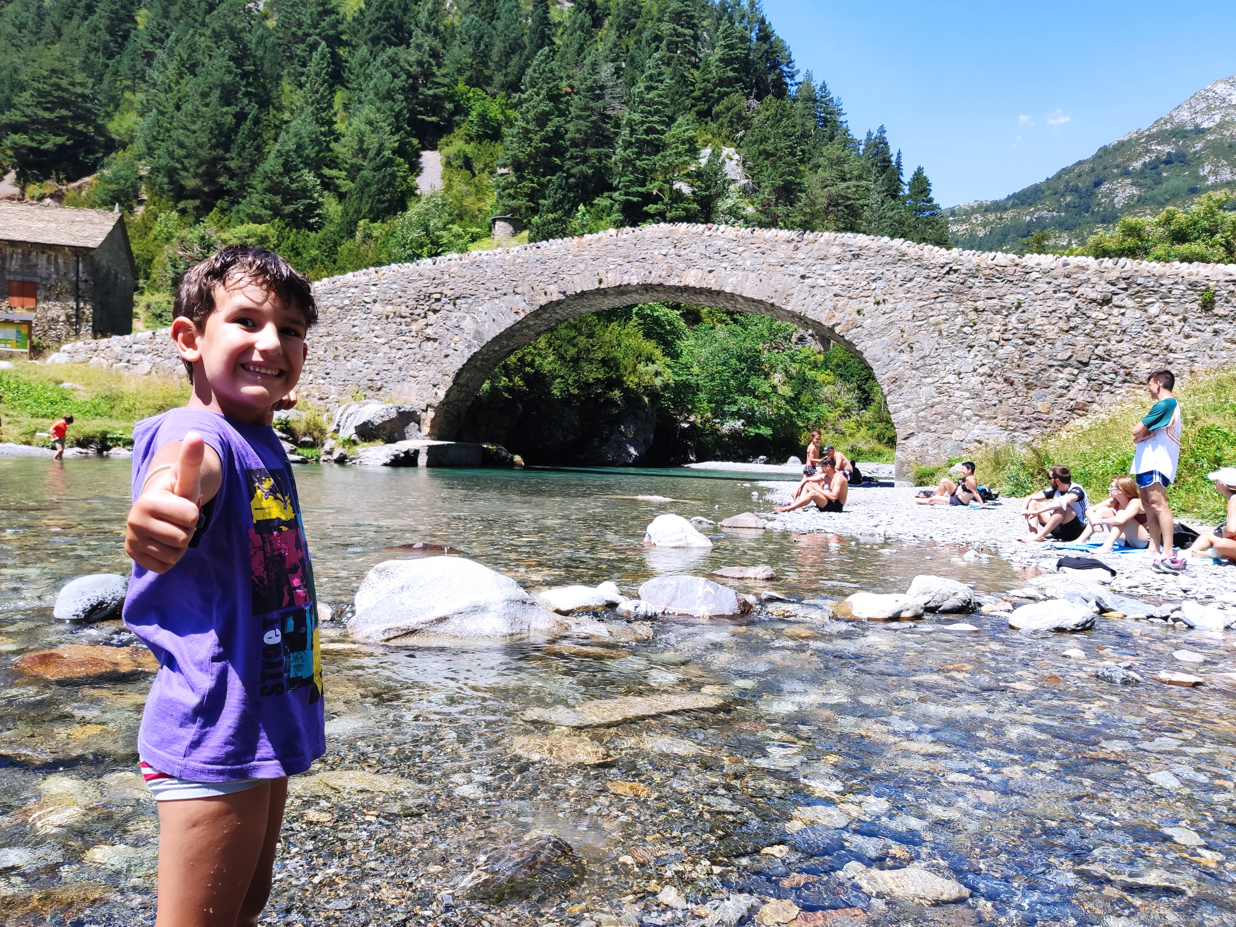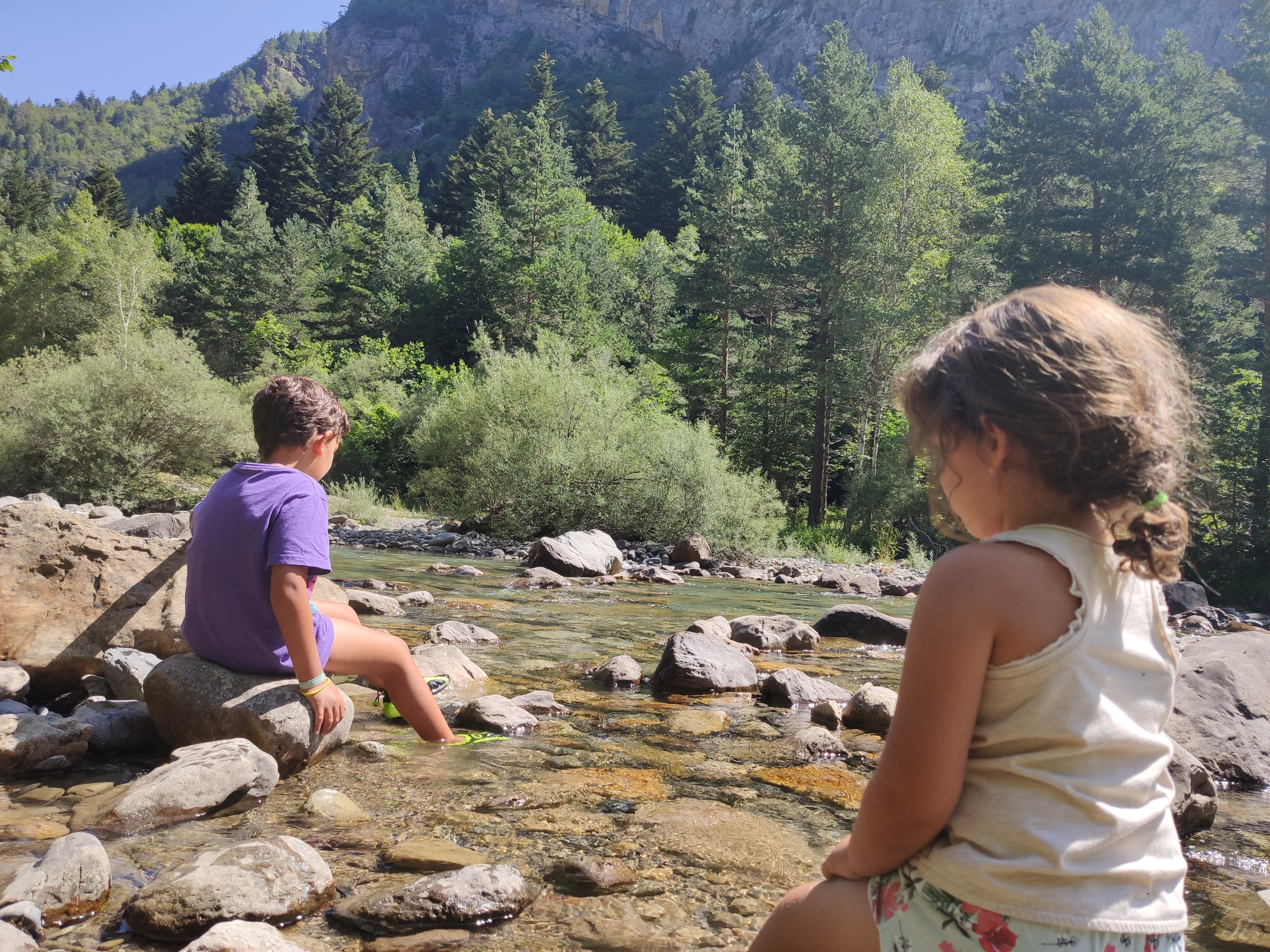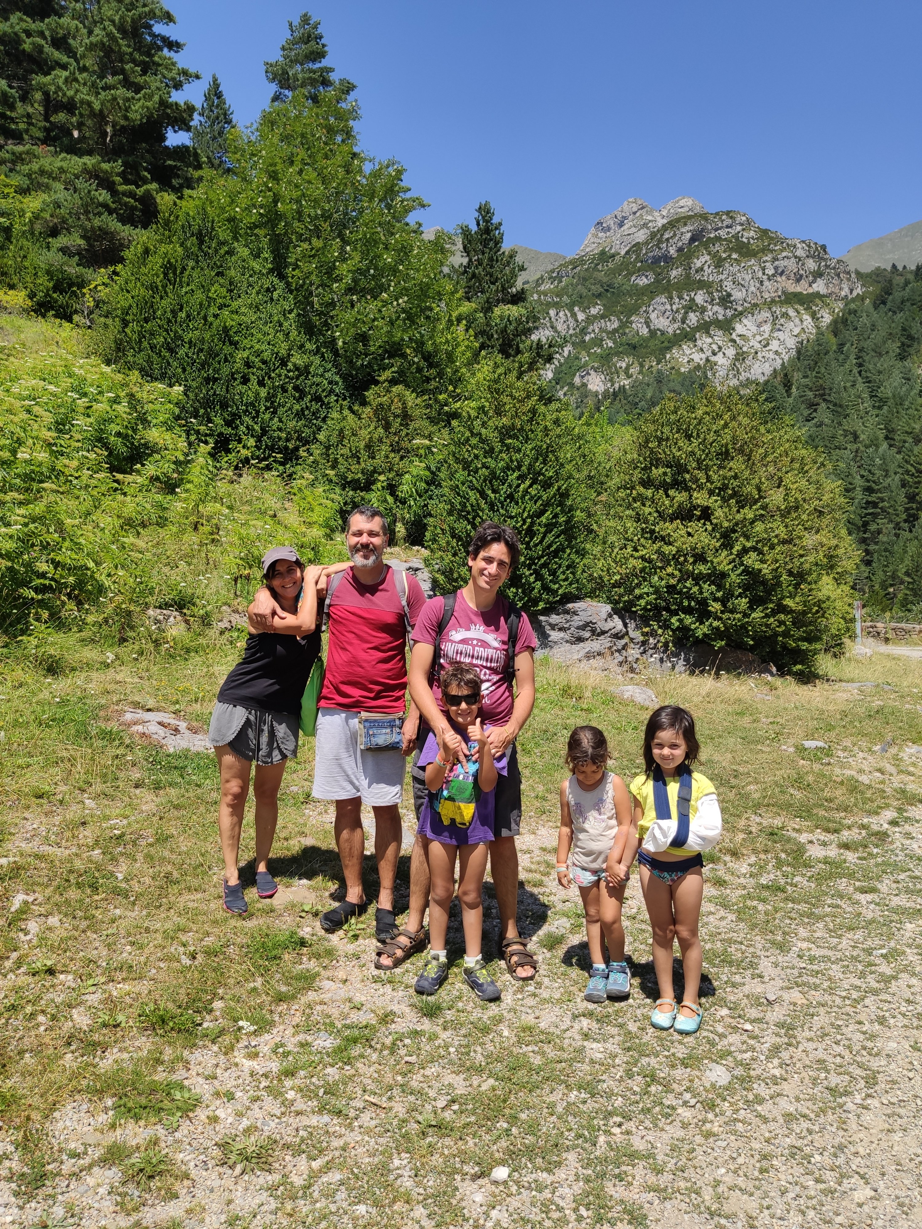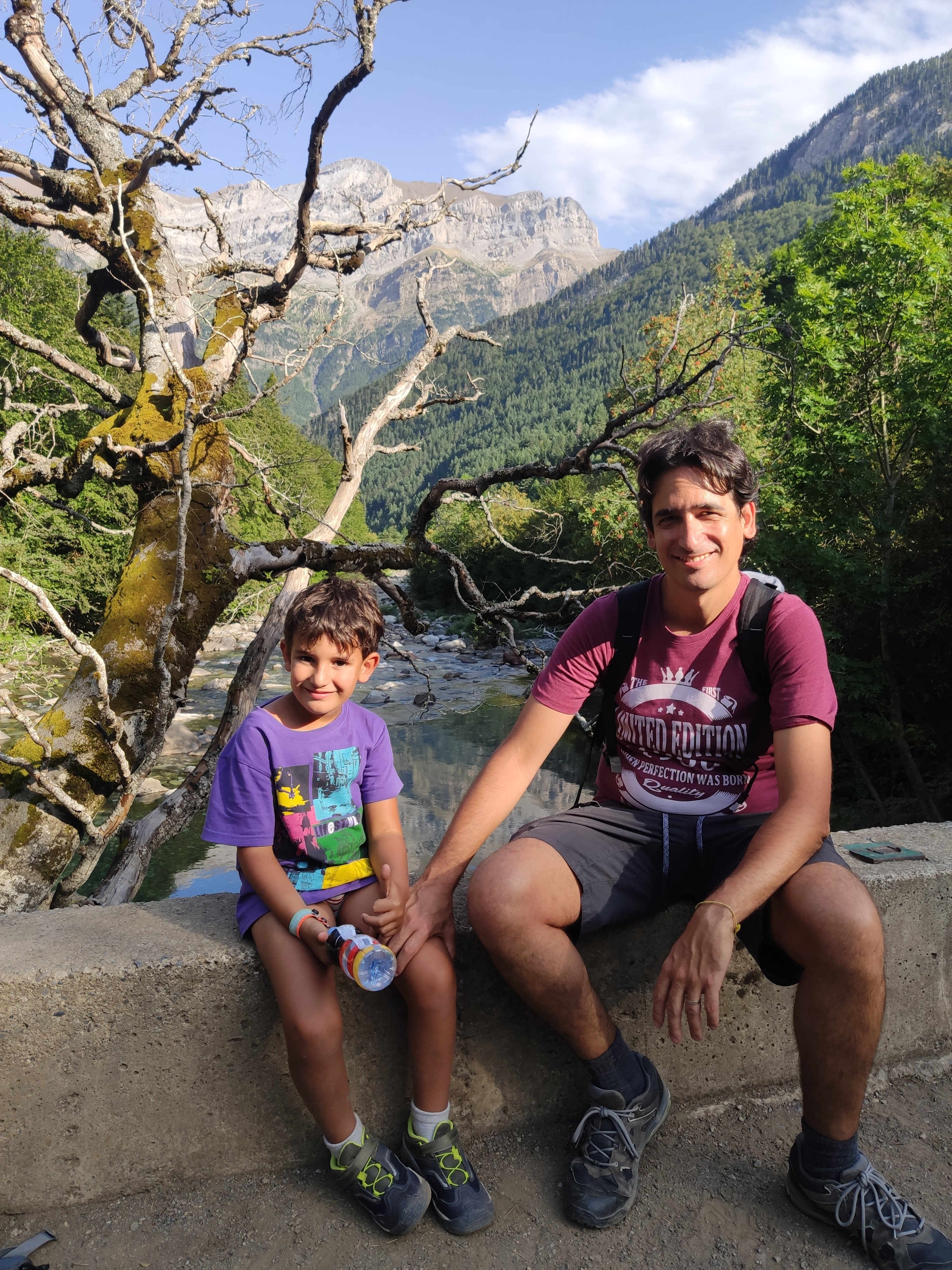 Ens vam llevar tard (com de costum, però tenint en compte que el dia abans havíem estat jugant -els adults- al Carcassonne fins les 2 de la matinada, no va ser cap sorpresa) i vam enfilar cap a la vall de Bujaruelo. A 1km del lloc on havíem passat la nit comença una pista mig asfaltada que corre al costat del riu. A uns 2km ens vam aturar al marge i vam parar taula per esmorzar (els nens van alleugerir per poder remullar els peus al riu).