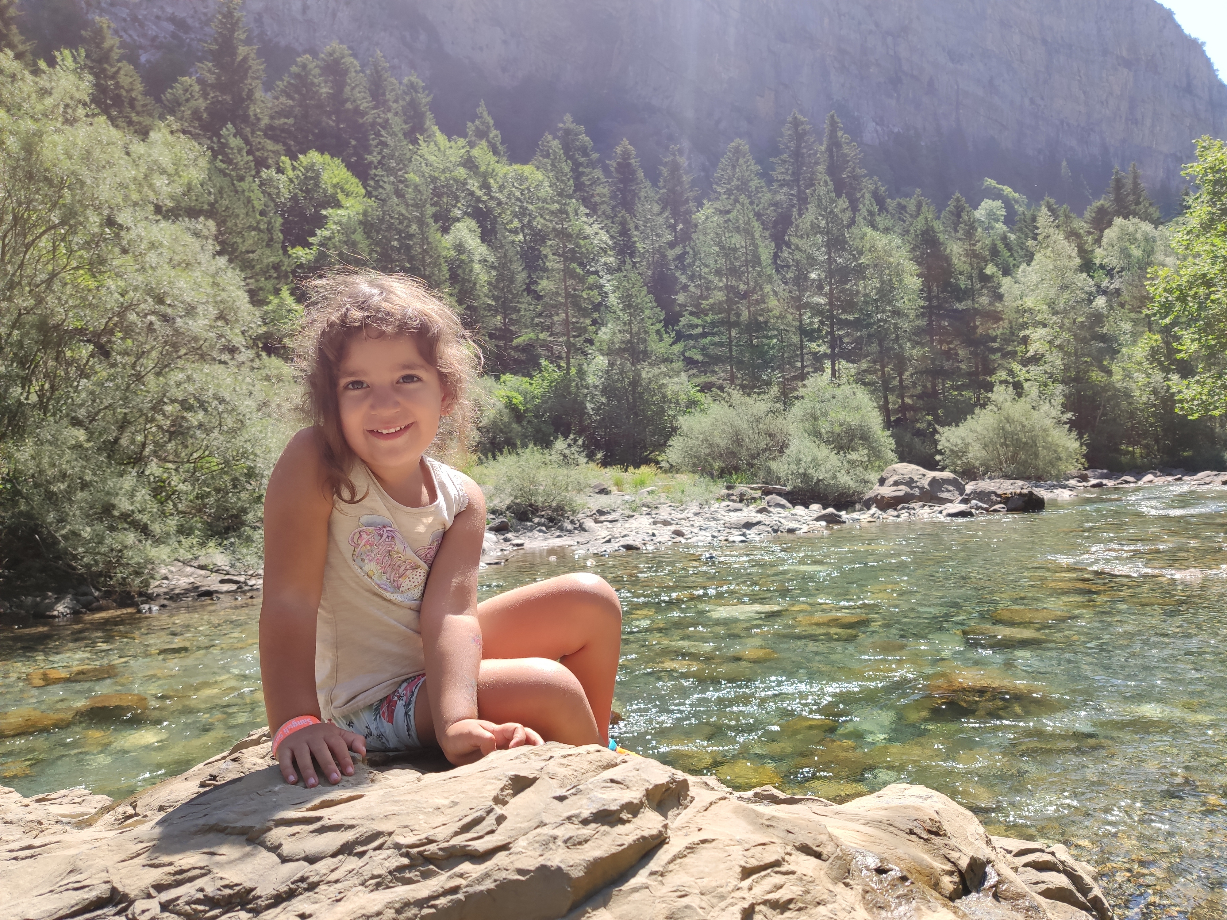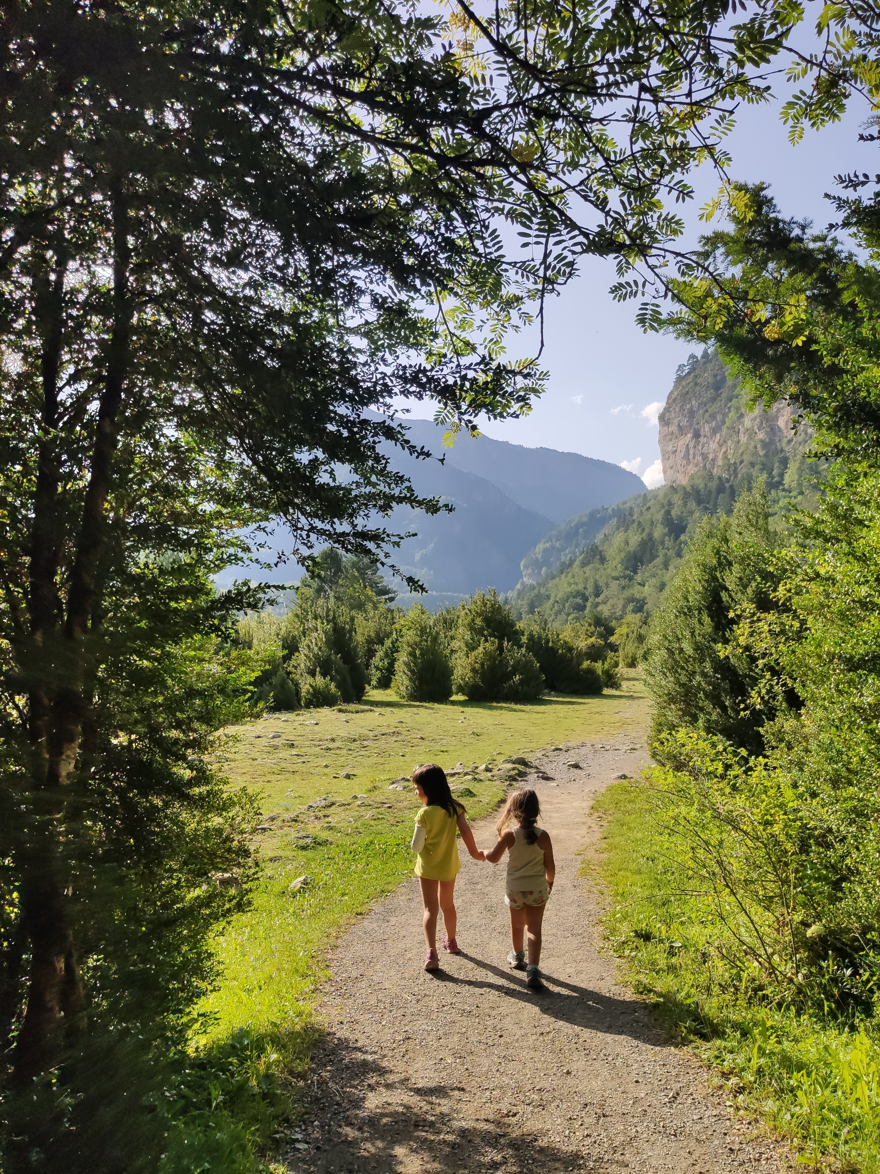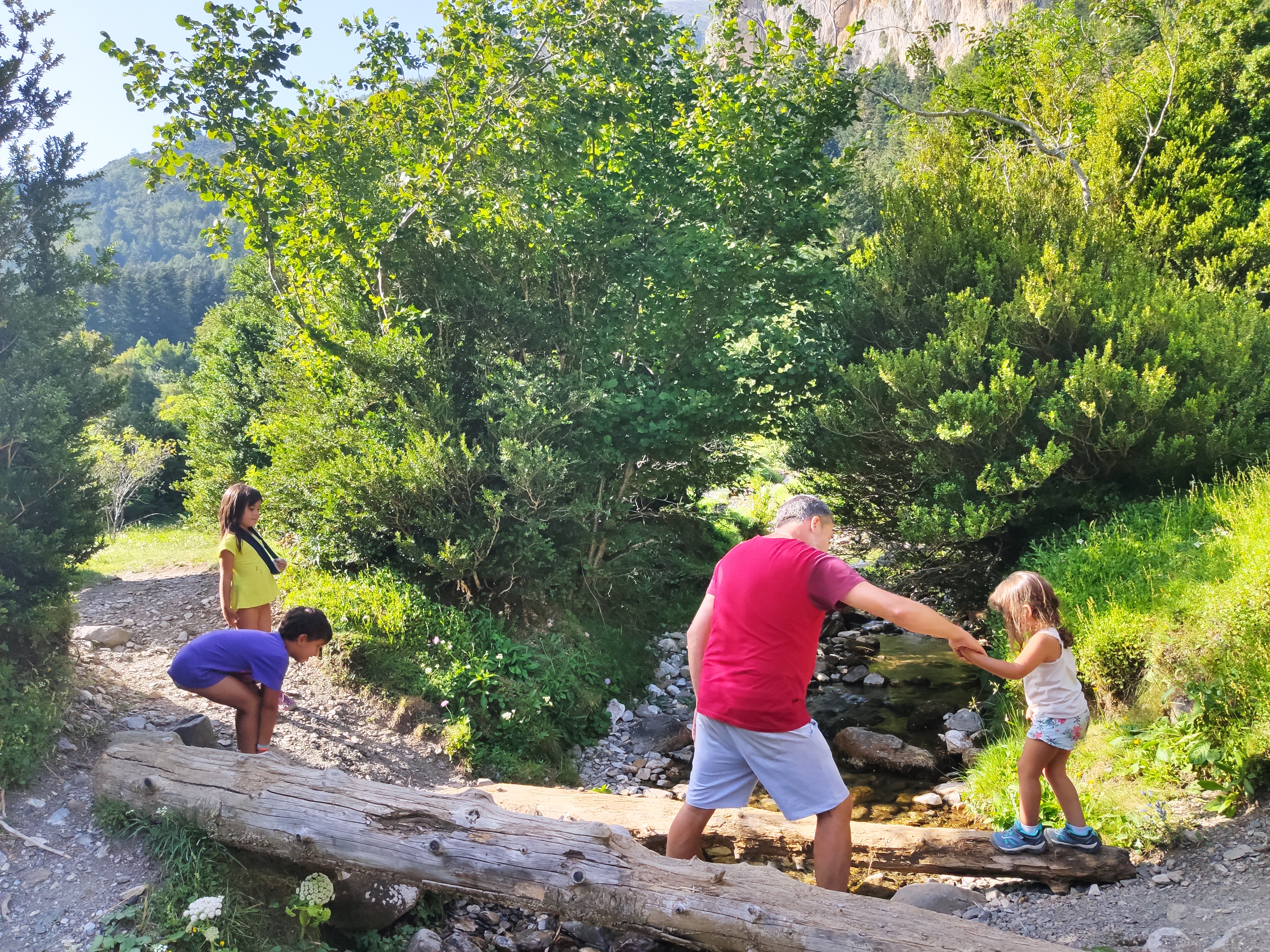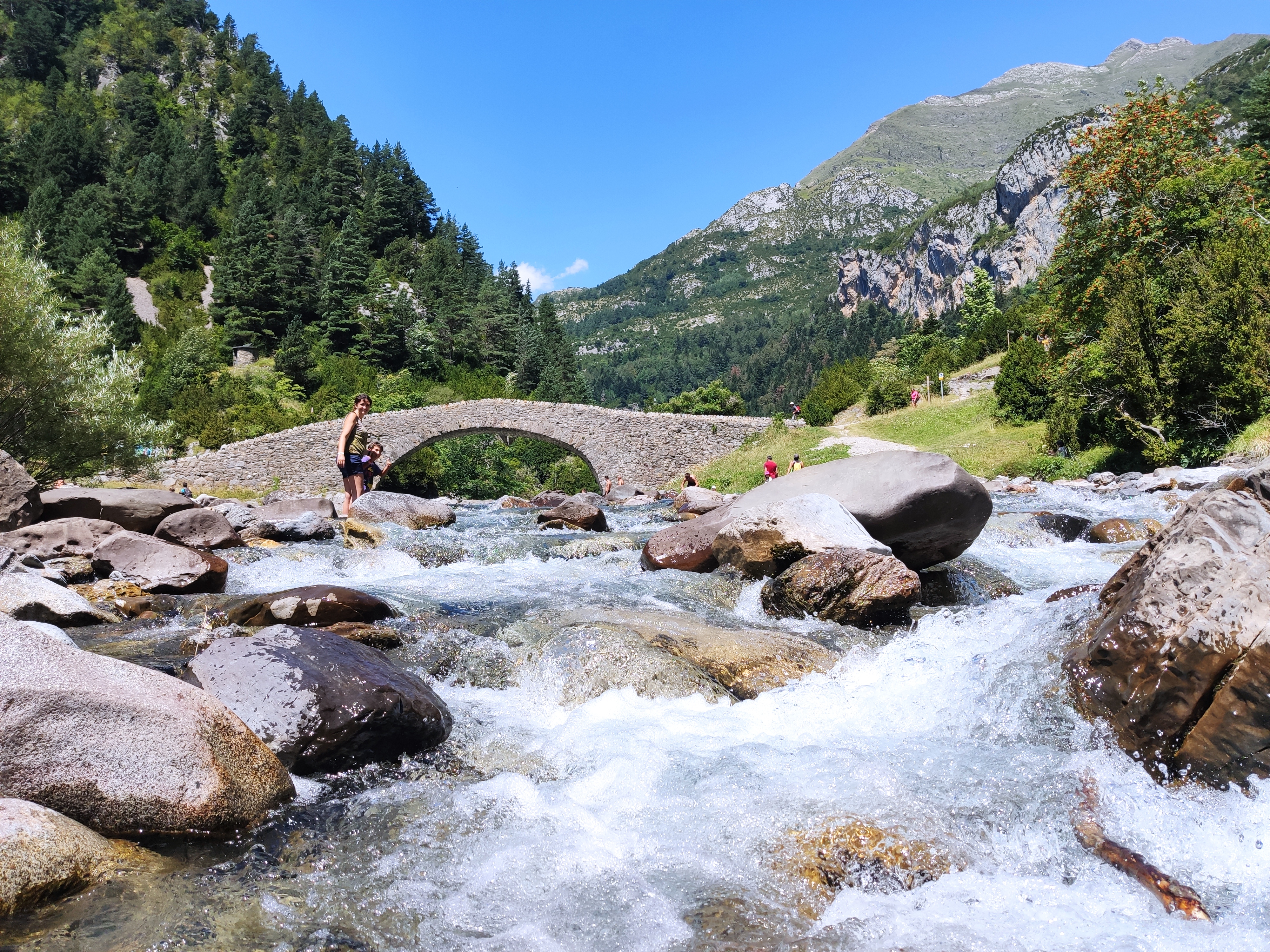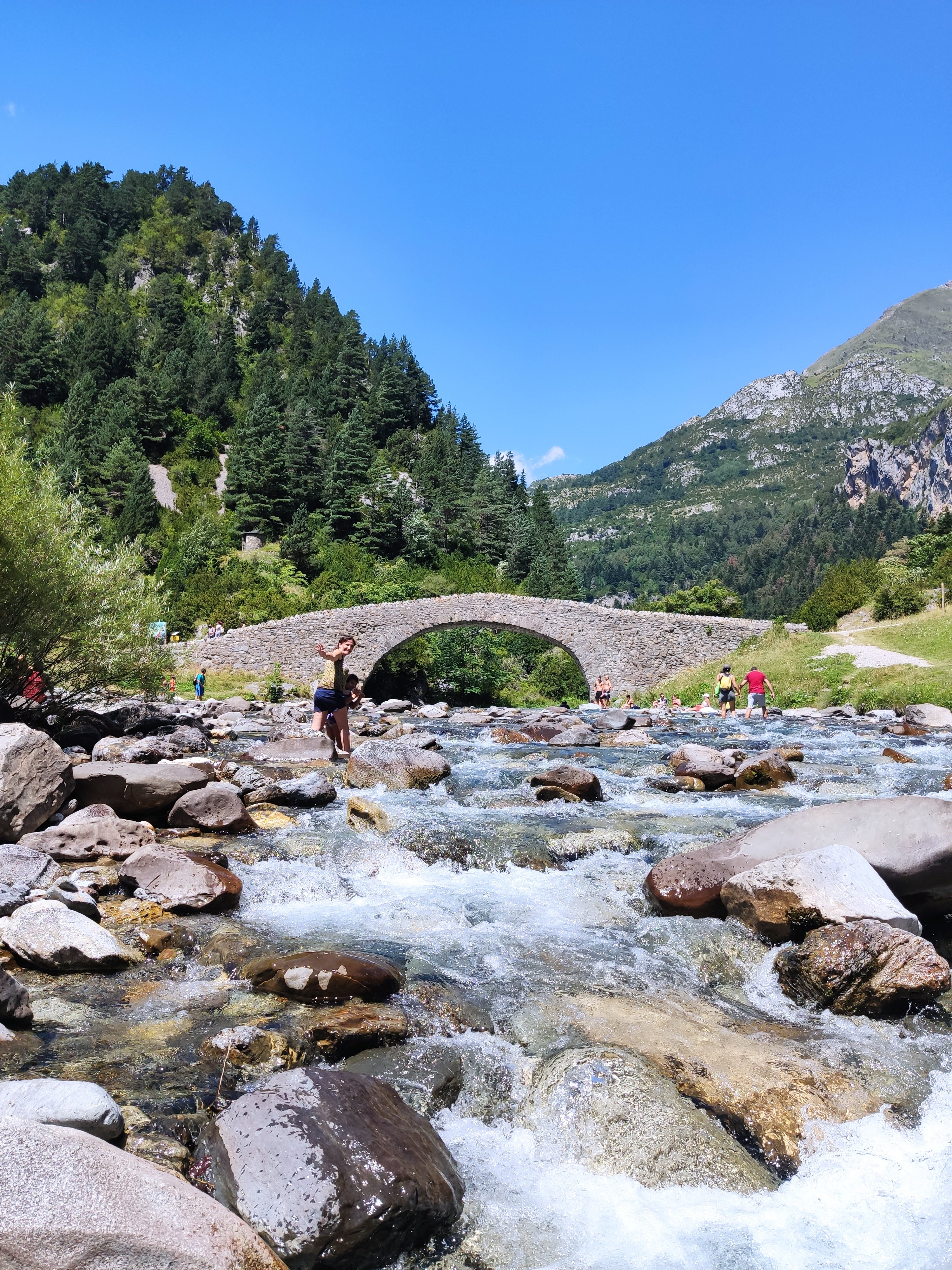 Ens vam llevar tard (com de costum, però tenint en compte que el dia abans havíem estat jugant -els adults- al Carcassonne fins les 2 de la matinada, no va ser cap sorpresa) i vam enfilar cap a la vall de Bujaruelo. A 1km del lloc on havíem passat la nit comença una pista mig asfaltada que corre al costat del riu. A uns 2km ens vam aturar al marge i vam parar taula per esmorzar (els nens van alleugerir per poder remullar els peus al riu).