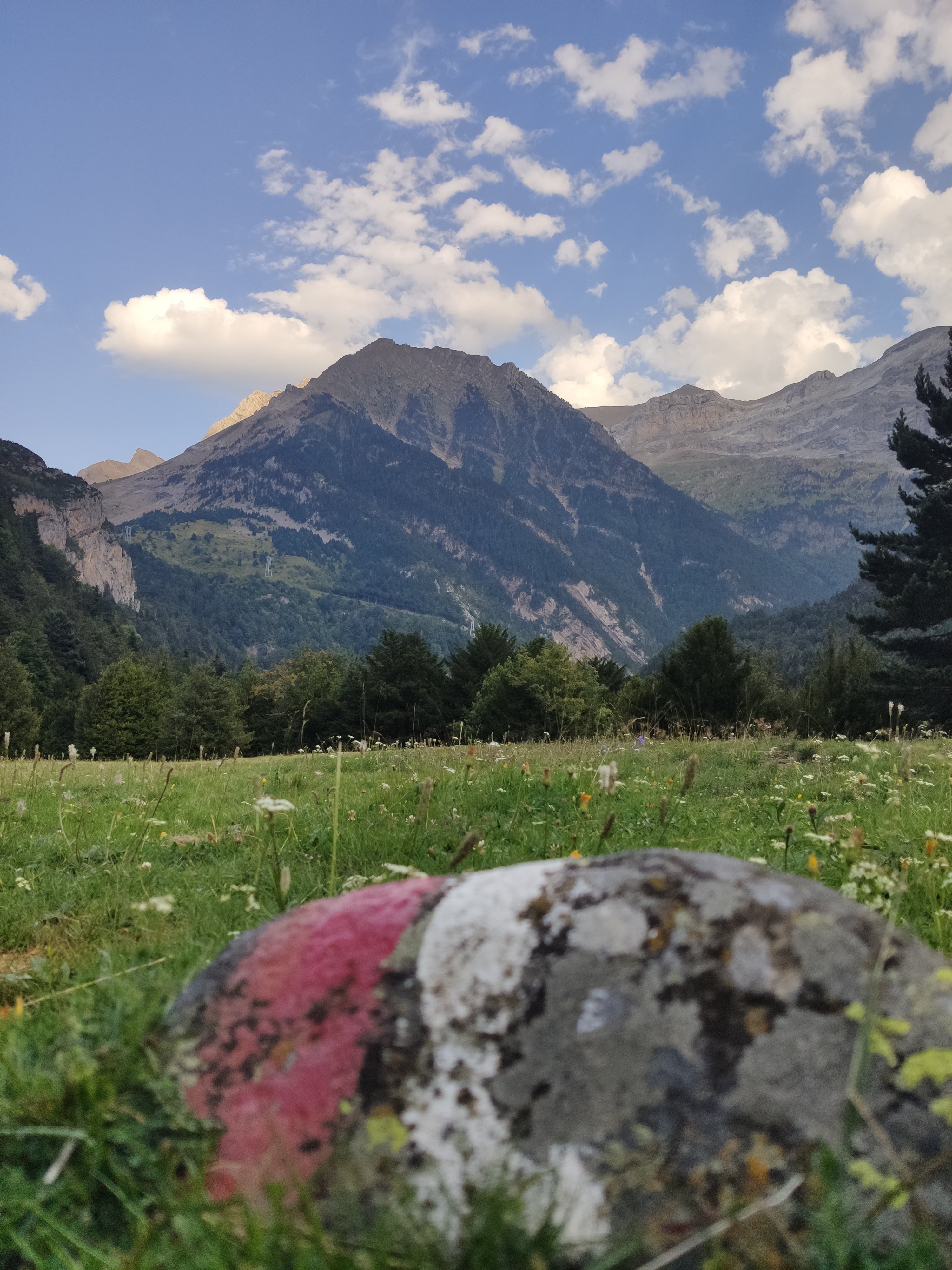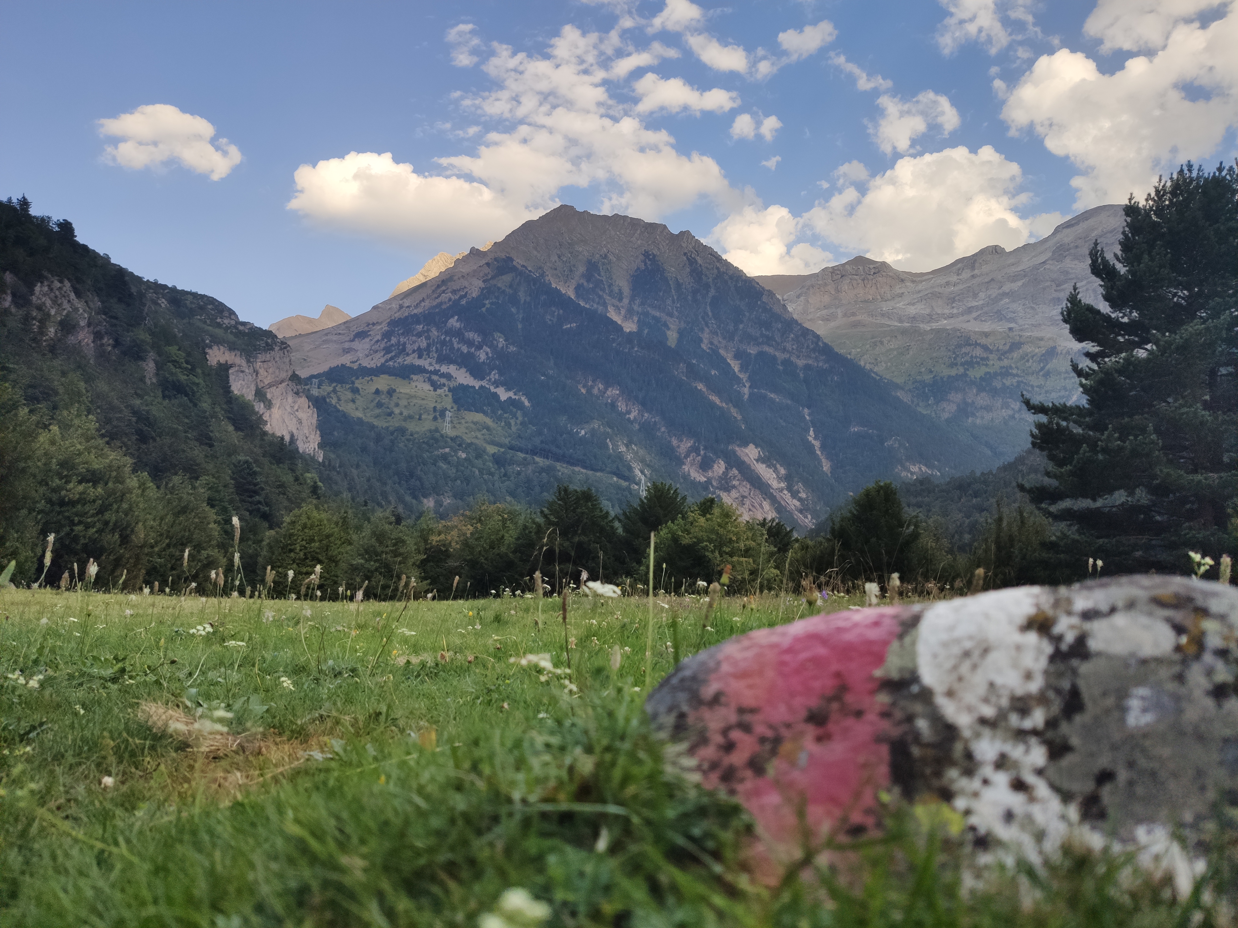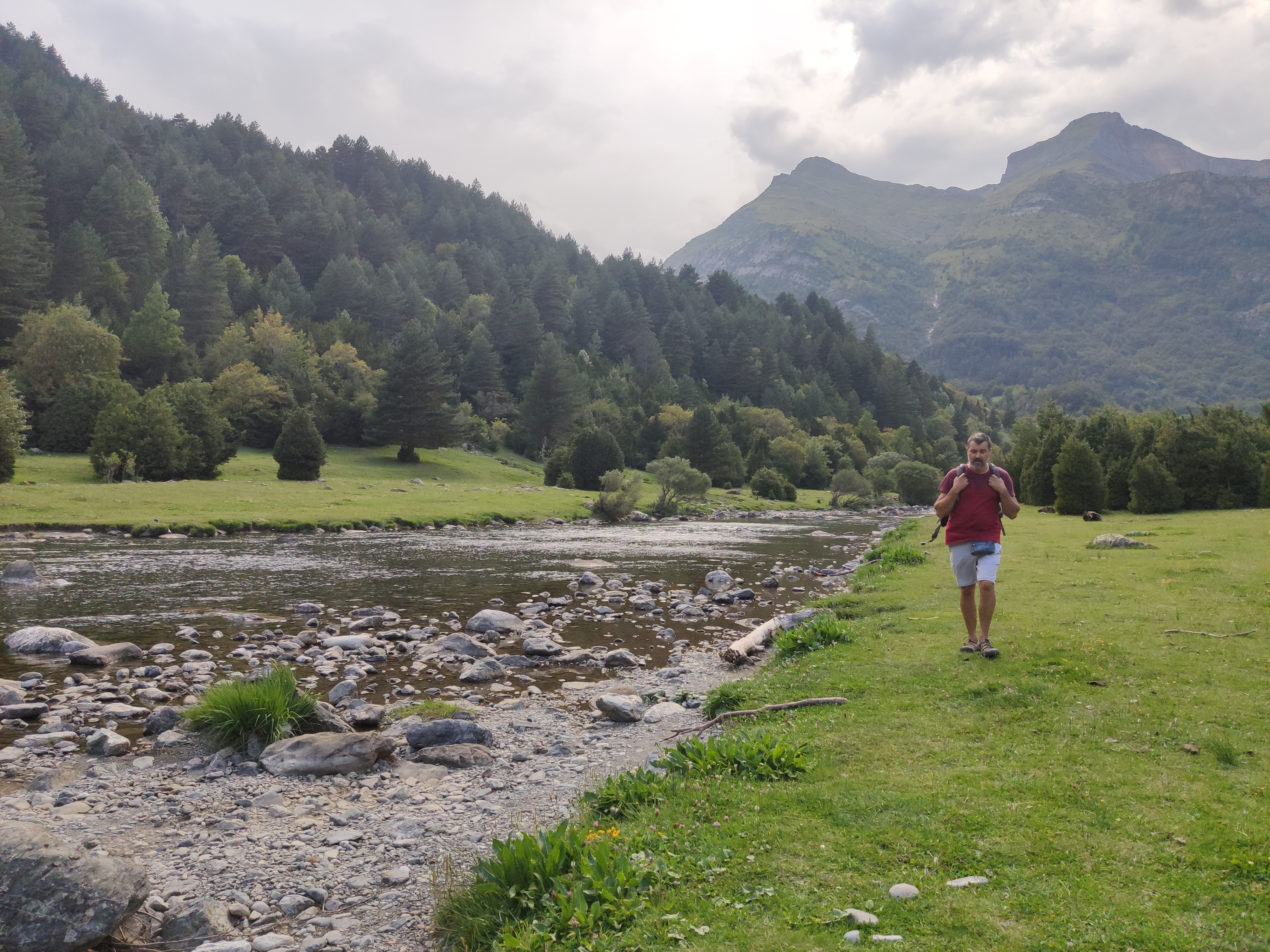 El paissatge és espectacular, amb prats d’un verd llampant envoltats de muntanyes majestuoses i el riu corrent pel mig de la vall. Abans de dinar ens vam ficar les sabates de riu per remuntar-lo (més per la gràcia de fer-ho que no pas per necessitat, ja que el camí va ben bé pel costat).