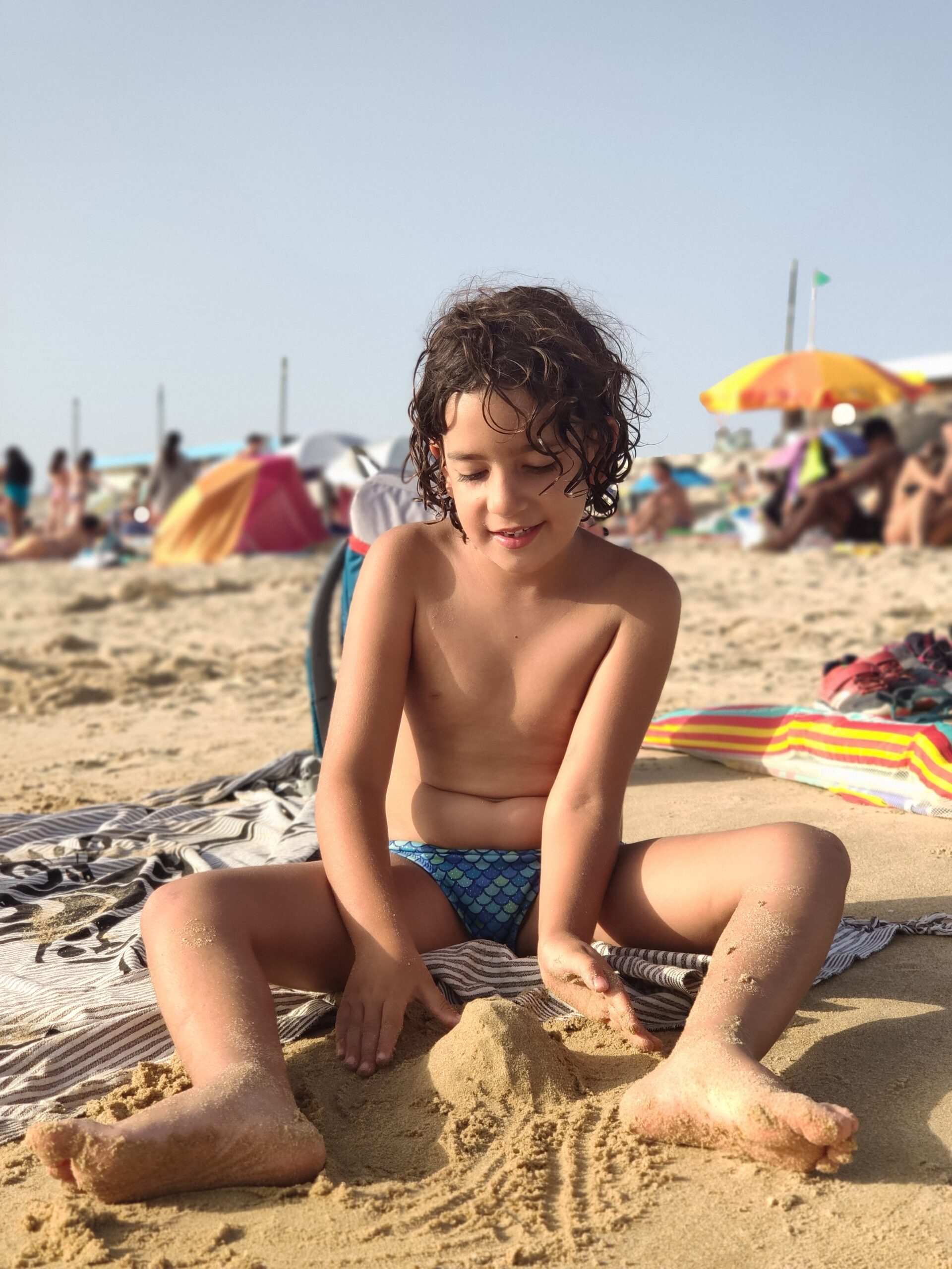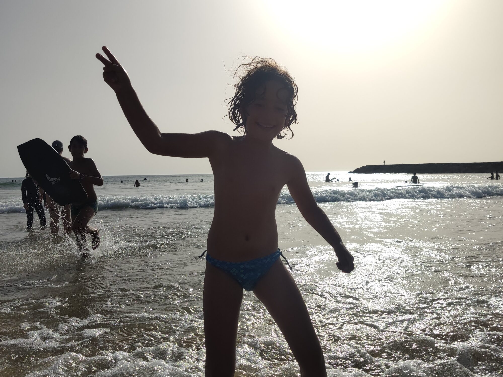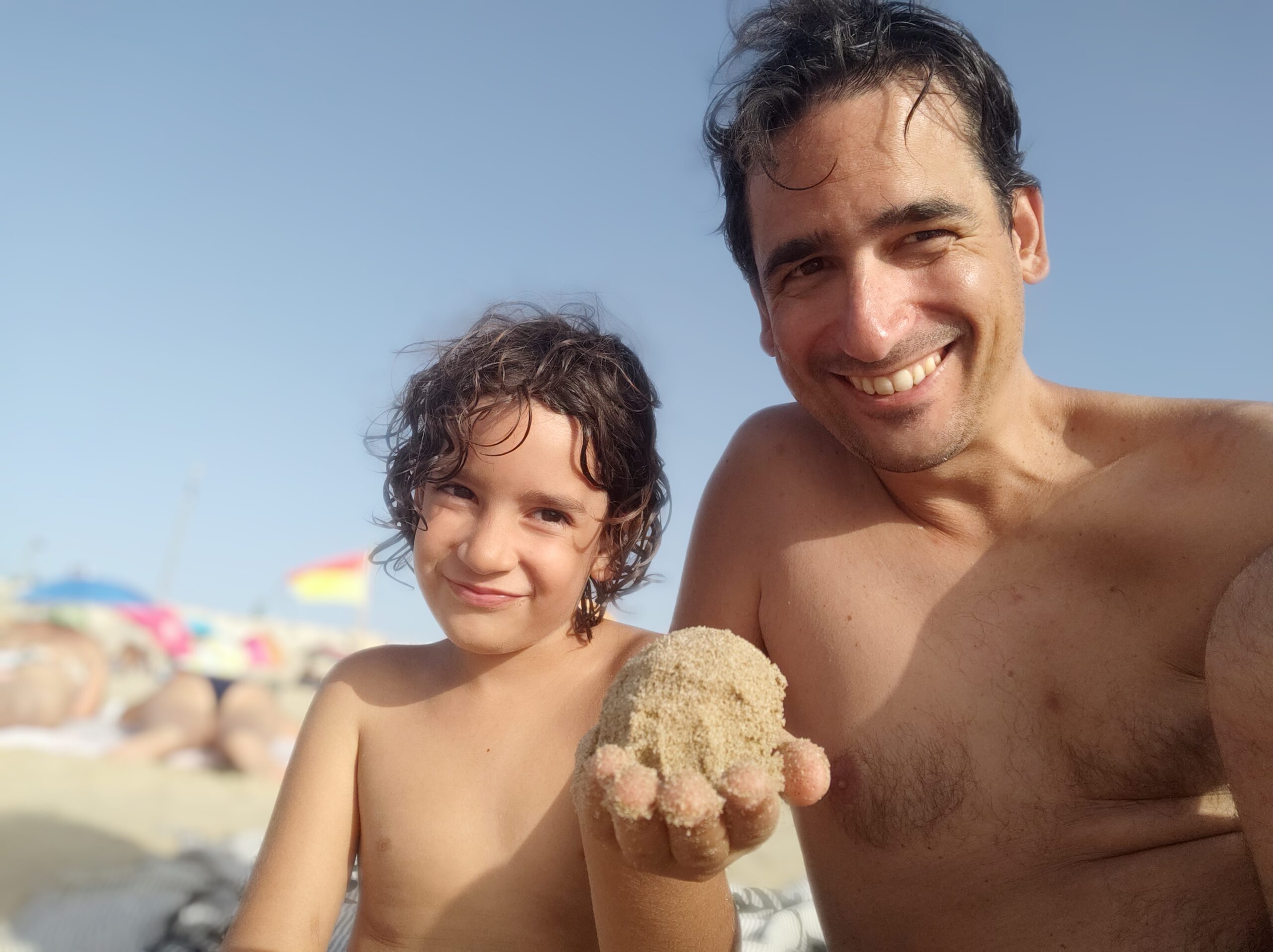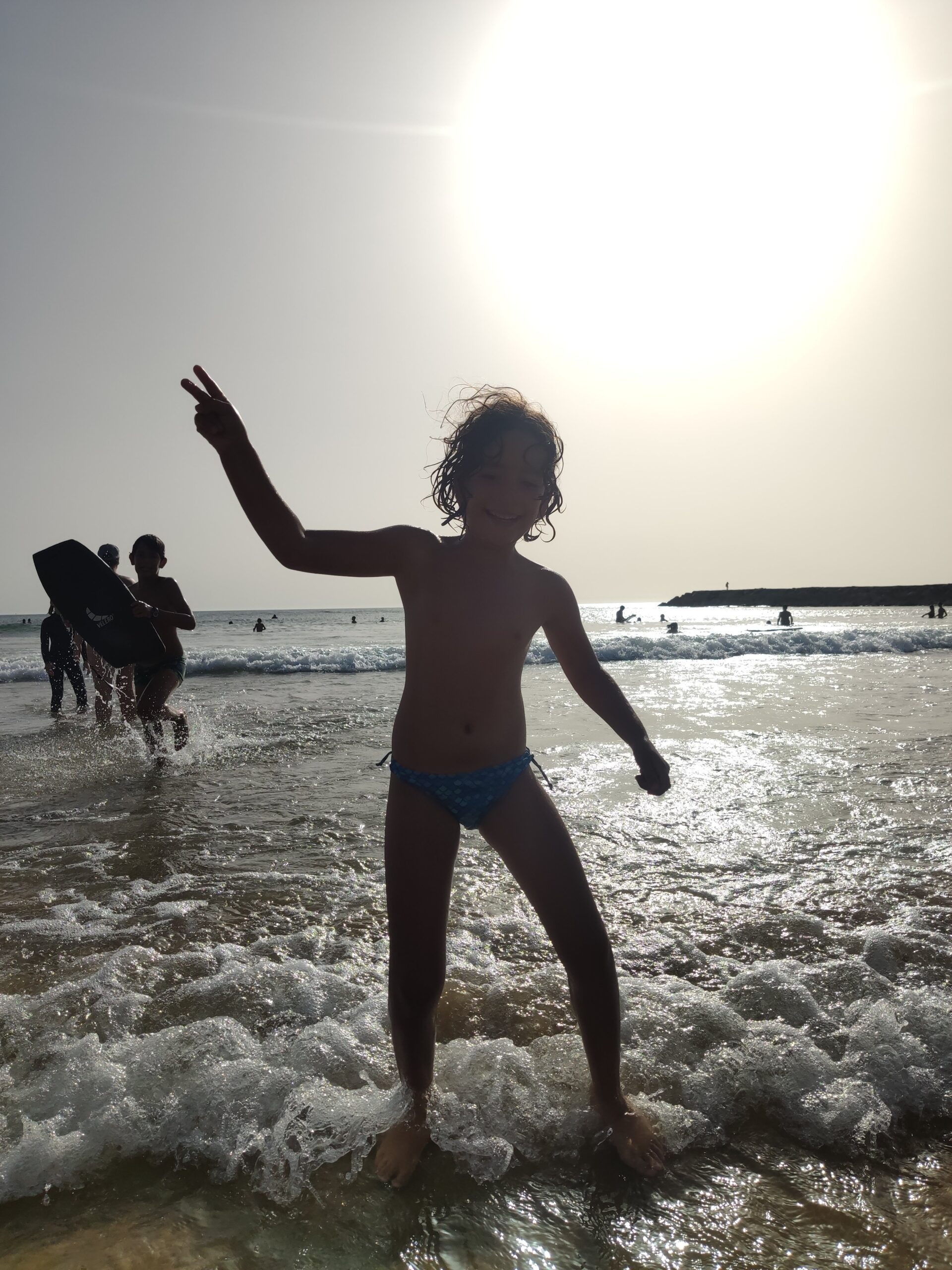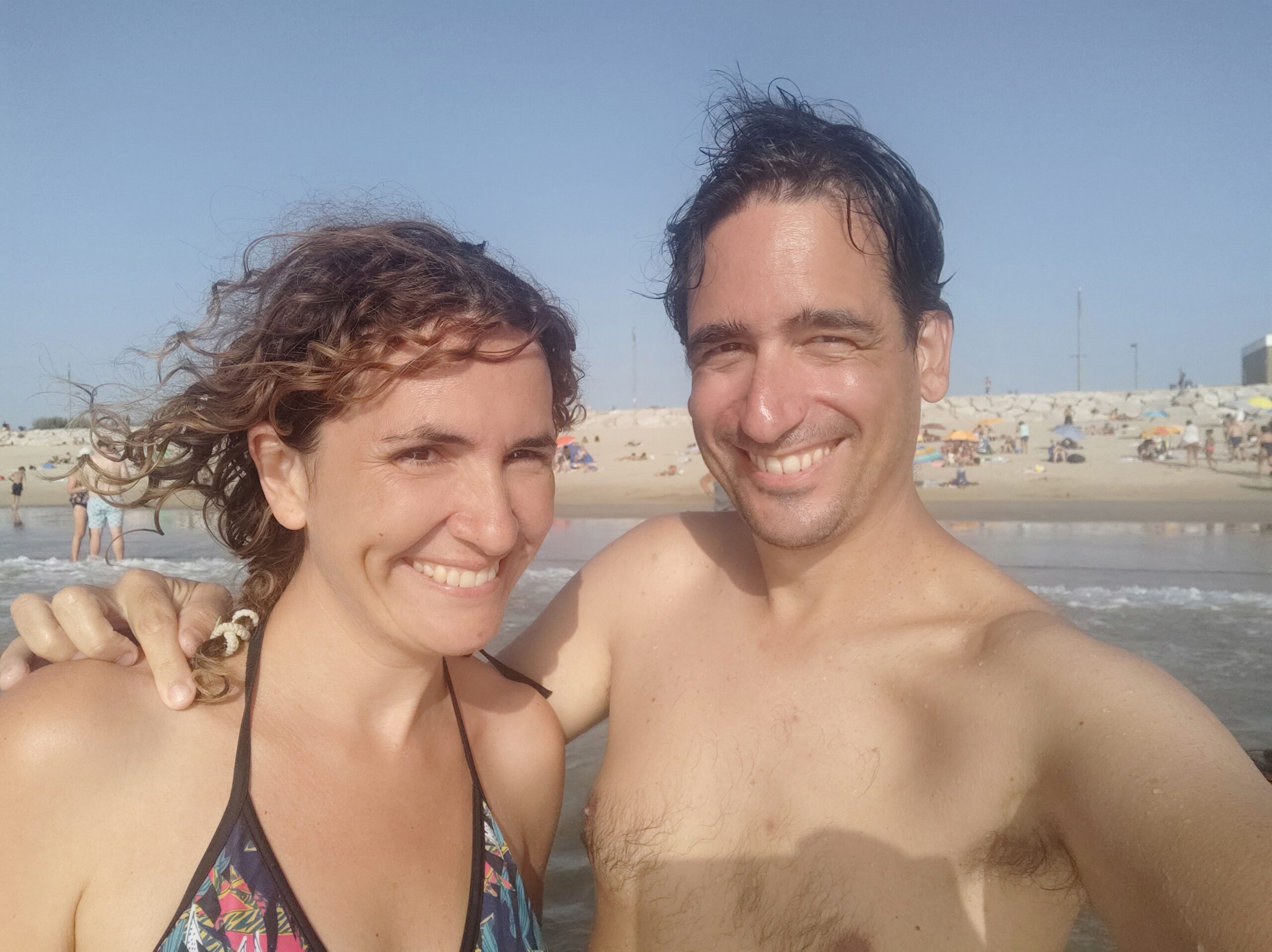 Teníem mirat el càmping Orbitur de Costa de Caparica, una localitat de platja al sud de Lisboa. Quan estàvem fent el canvi d’aigües a Óbidos uns autocaravanistes ens han parlat de Praia Grande, prop de Sintra, on van estar molt bé, i ens han fet dubtar, però finalment hem decidit d’anar a Lisboa primer. I ha estat un encert. Al càmping no hi havia cap problema de disponibilitat, i a cinc minuts hi ha una platja espectacular de sorra fina i aigües transparents que han fet les delícies dels nens. Hem estat saltant onades tota la tarda! (I veient un munt de surferos, perquè la zona és reconeguda com un dels millors llocs per a la pràctica del surf, com comprovarem… millor no fem spoilers).