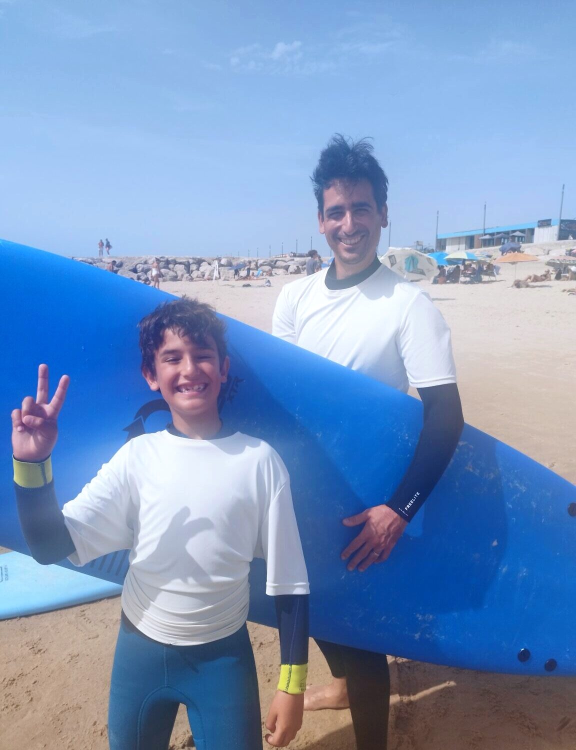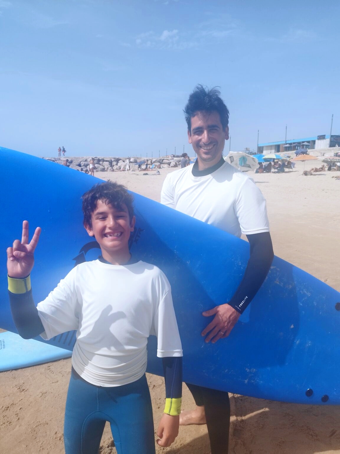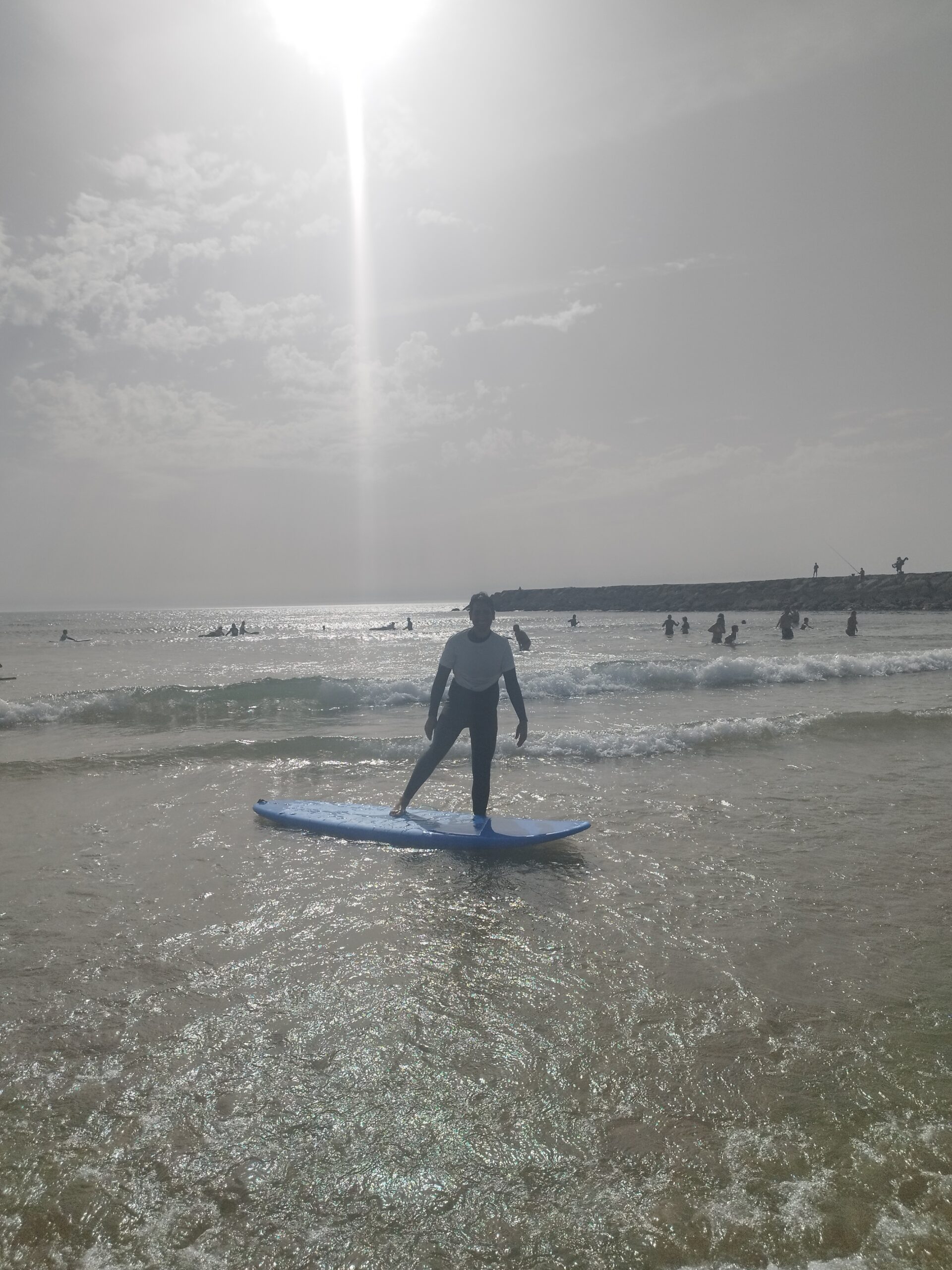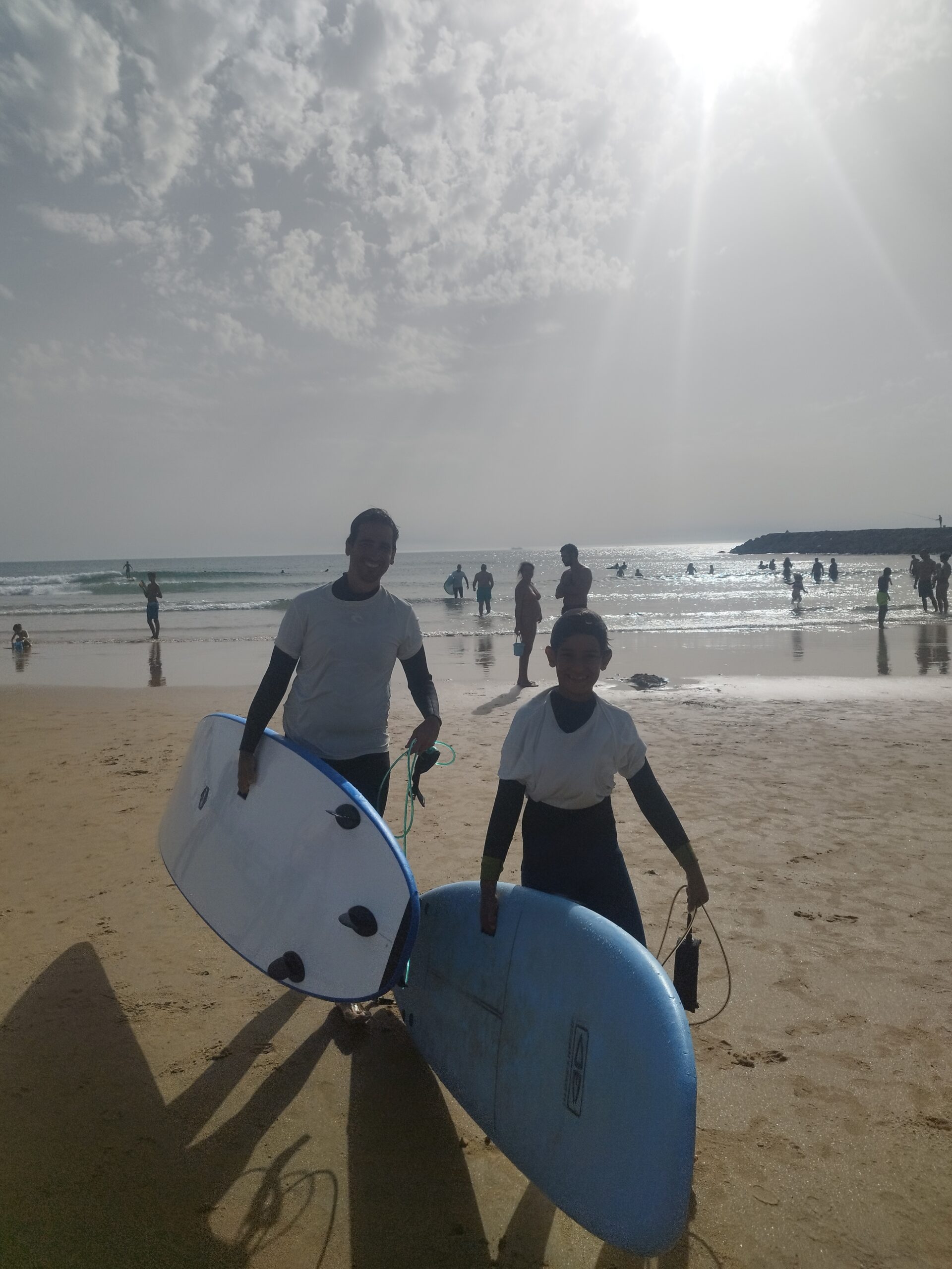 Al matí ens hem liat (entre altres coses perquè m’han emmerdat una mica amb la feina) i hem decidit passar el matí a la platja i anar a Lisboa a la tarda. Peeeero el Gerard tenia entre cella i cella provar el surf i jo, que també sóc un cul inquiet, m’he deixat arrossegar. Total, que hem agafat unes classes de dues hores i cap al mar falta gent!