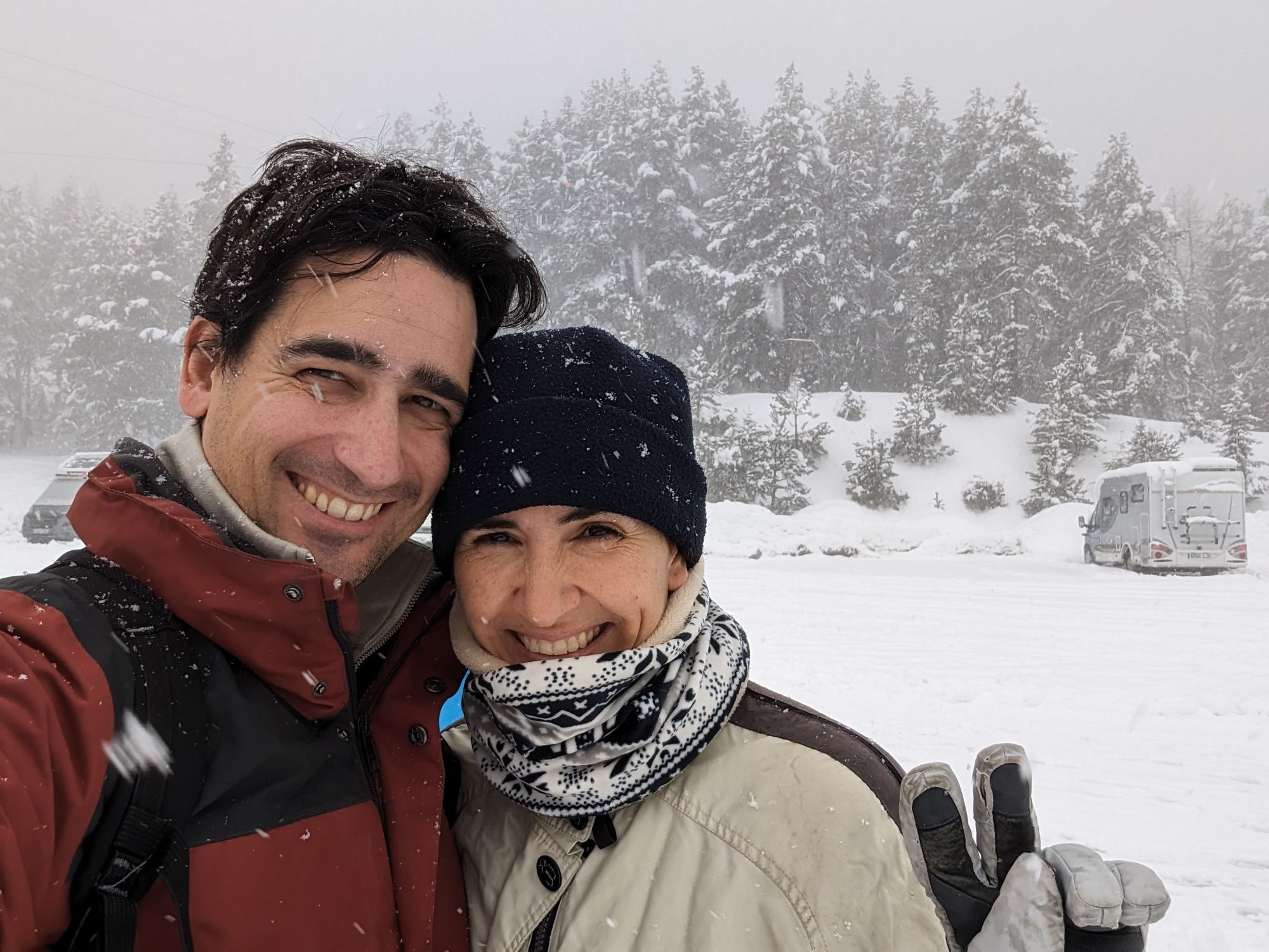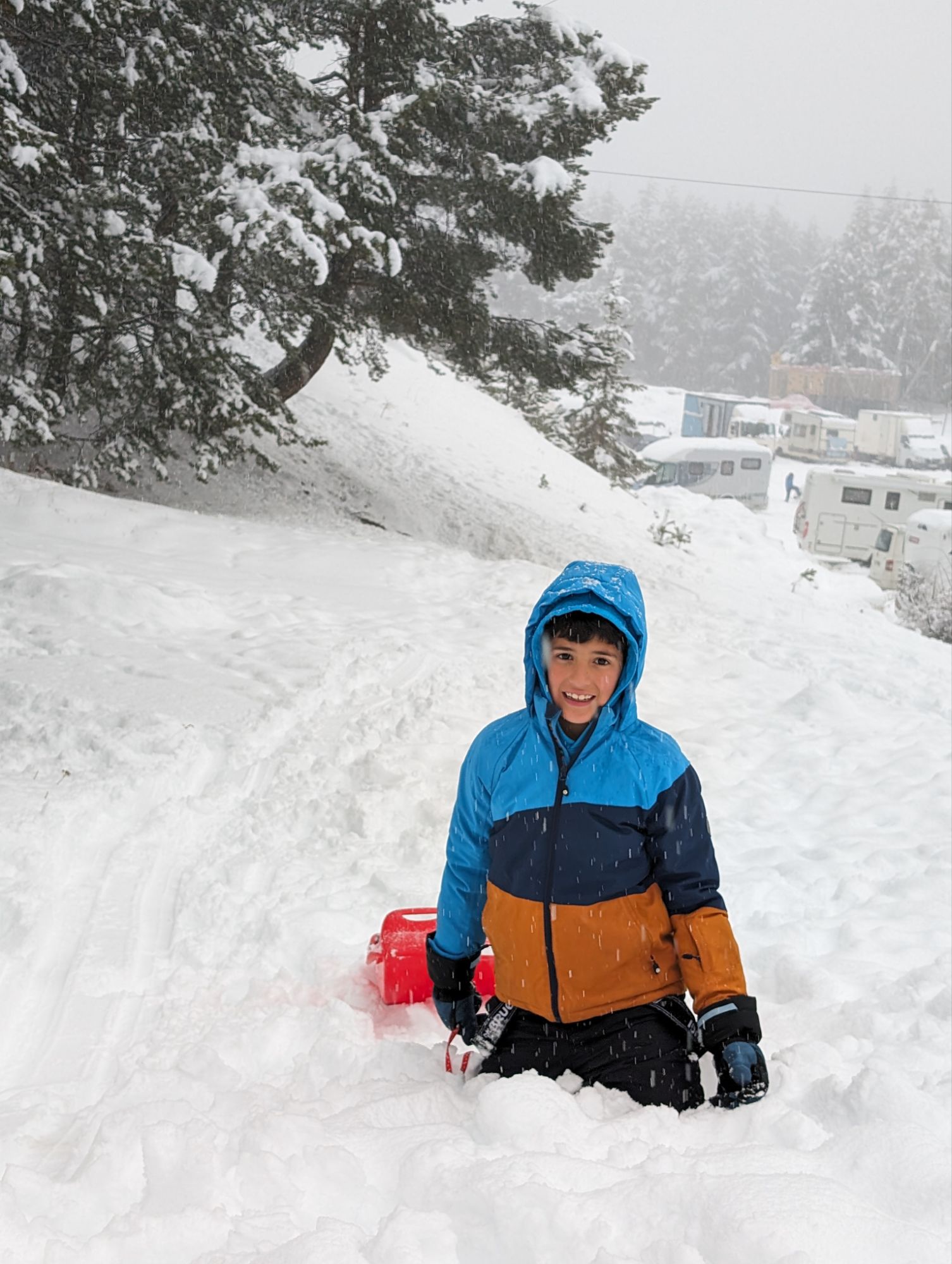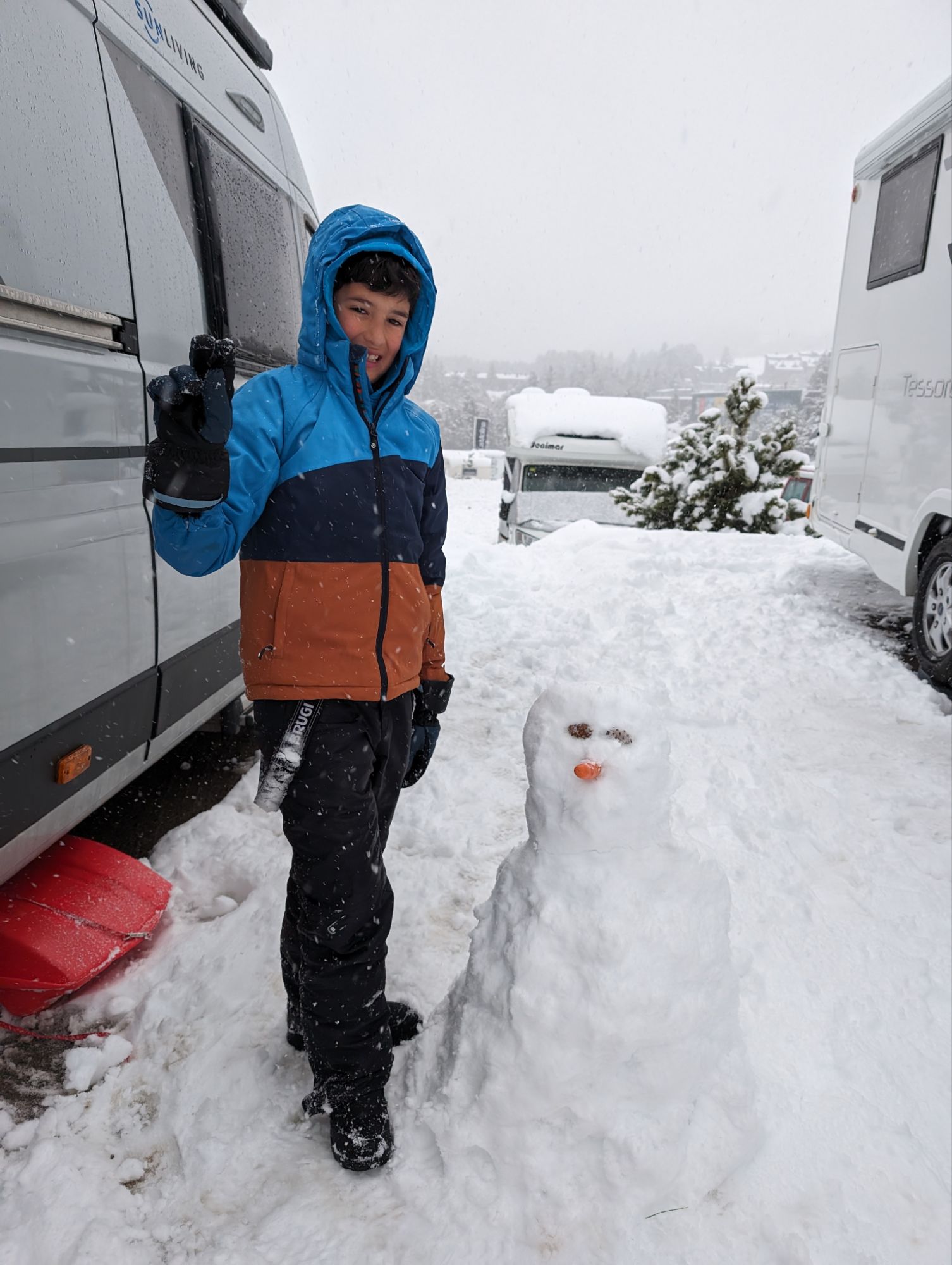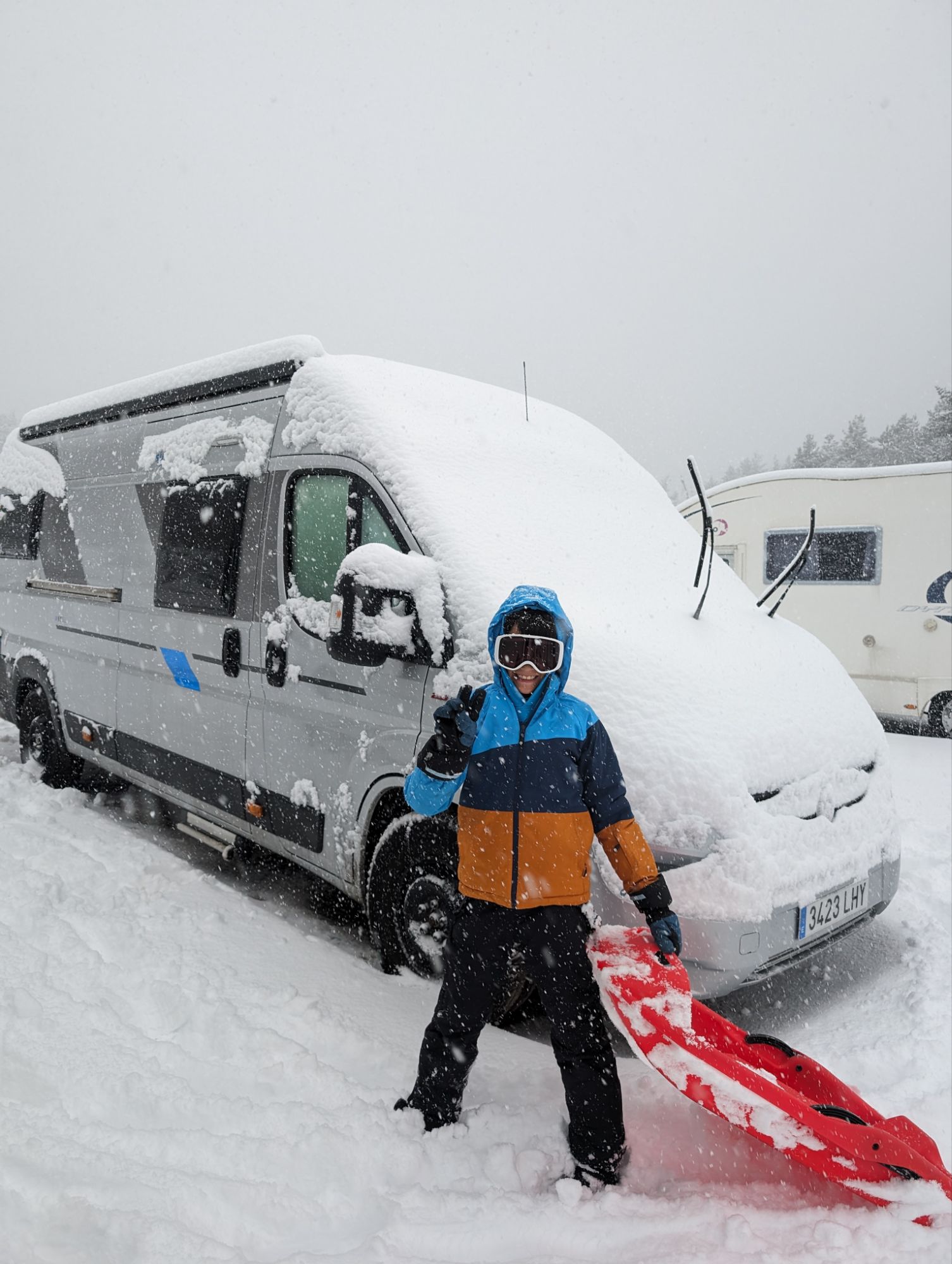 Doncs dissabte al matí, al llevar-nos, el parking era una pista d’esquí, amb 15cm de neu. No va parar de nevar fins al vespre, deixant un paisatge bucòlic de ple hivern (i nosaltres amb la calefacció a la furgo ben calentets!). Bé, el Gerard i jo sí que vam esquiar, una estona, i a la tarda tots 4 vam estar jugant amb el trineu i fent una excursió per la muntanya ben nevada.