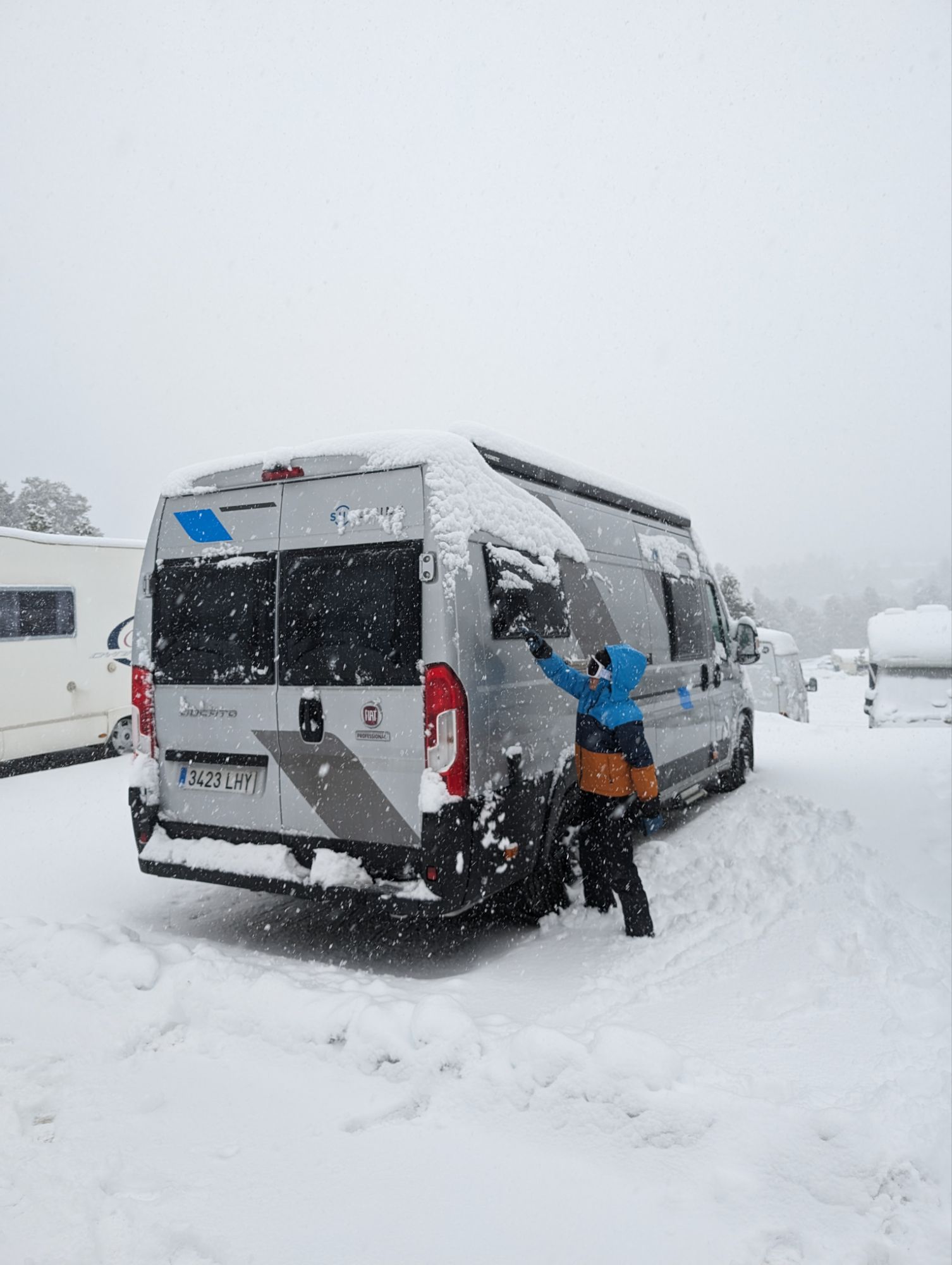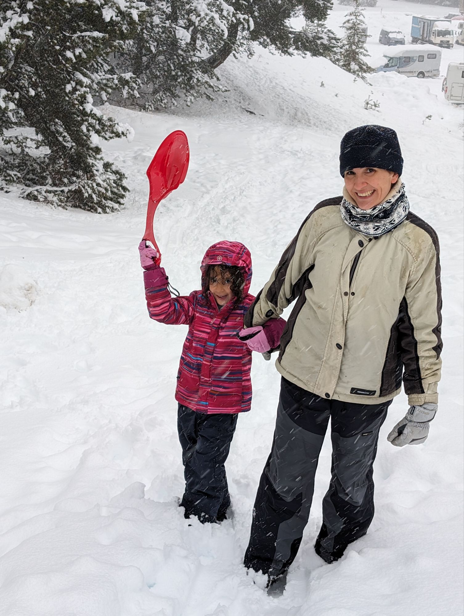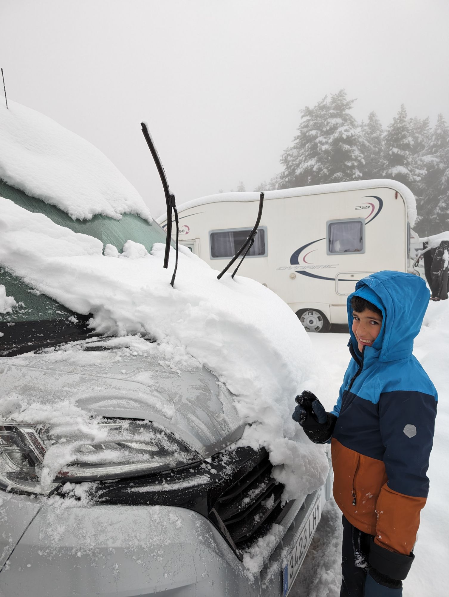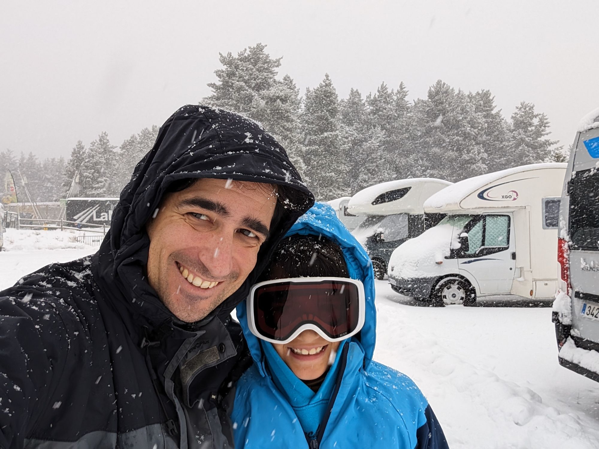 Doncs dissabte al matí, al llevar-nos, el parking era una pista d’esquí, amb 15cm de neu. No va parar de nevar fins al vespre, deixant un paisatge bucòlic de ple hivern (i nosaltres amb la calefacció a la furgo ben calentets!). Bé, el Gerard i jo sí que vam esquiar, una estona, i a la tarda tots 4 vam estar jugant amb el trineu i fent una excursió per la muntanya ben nevada.