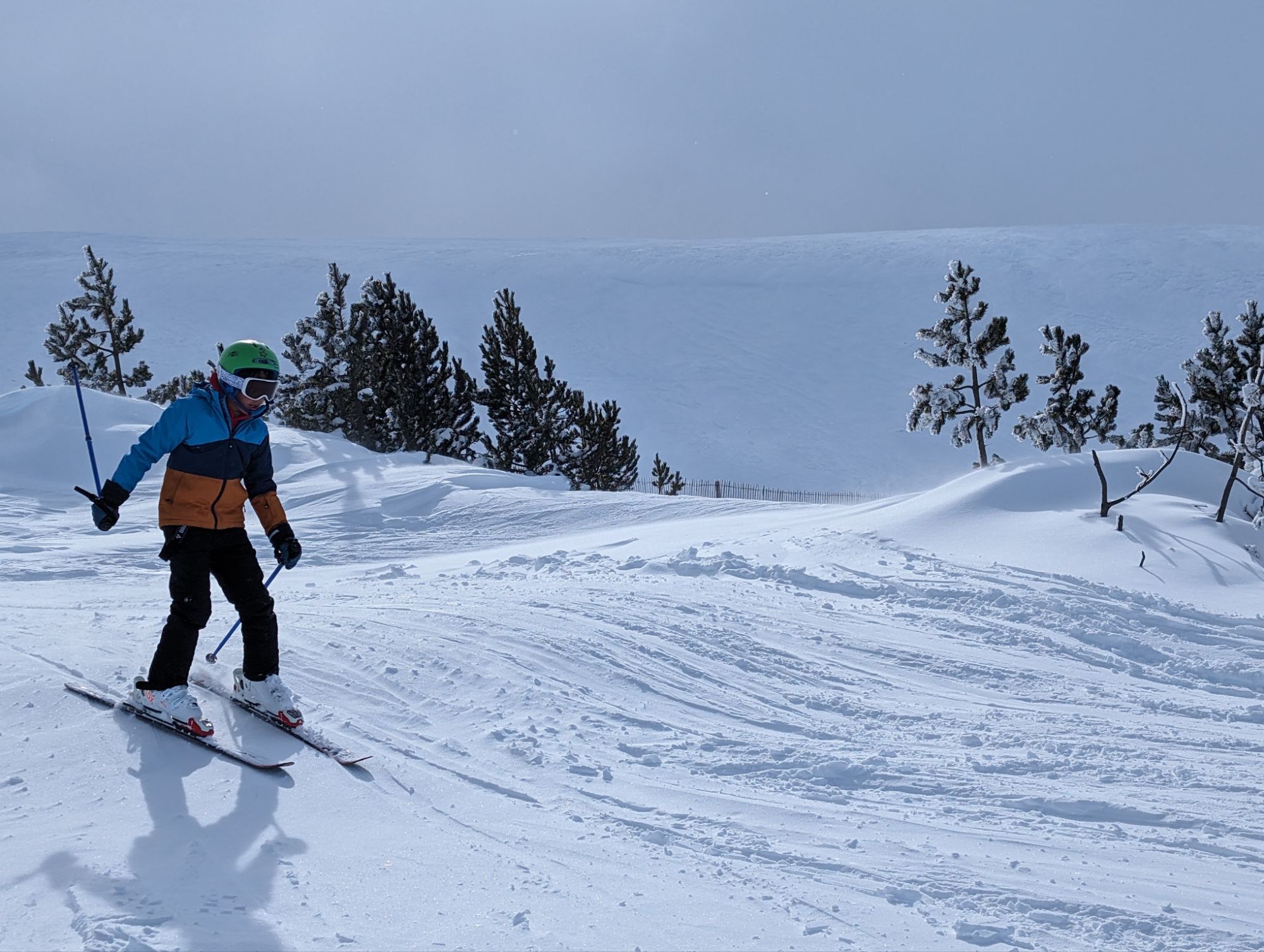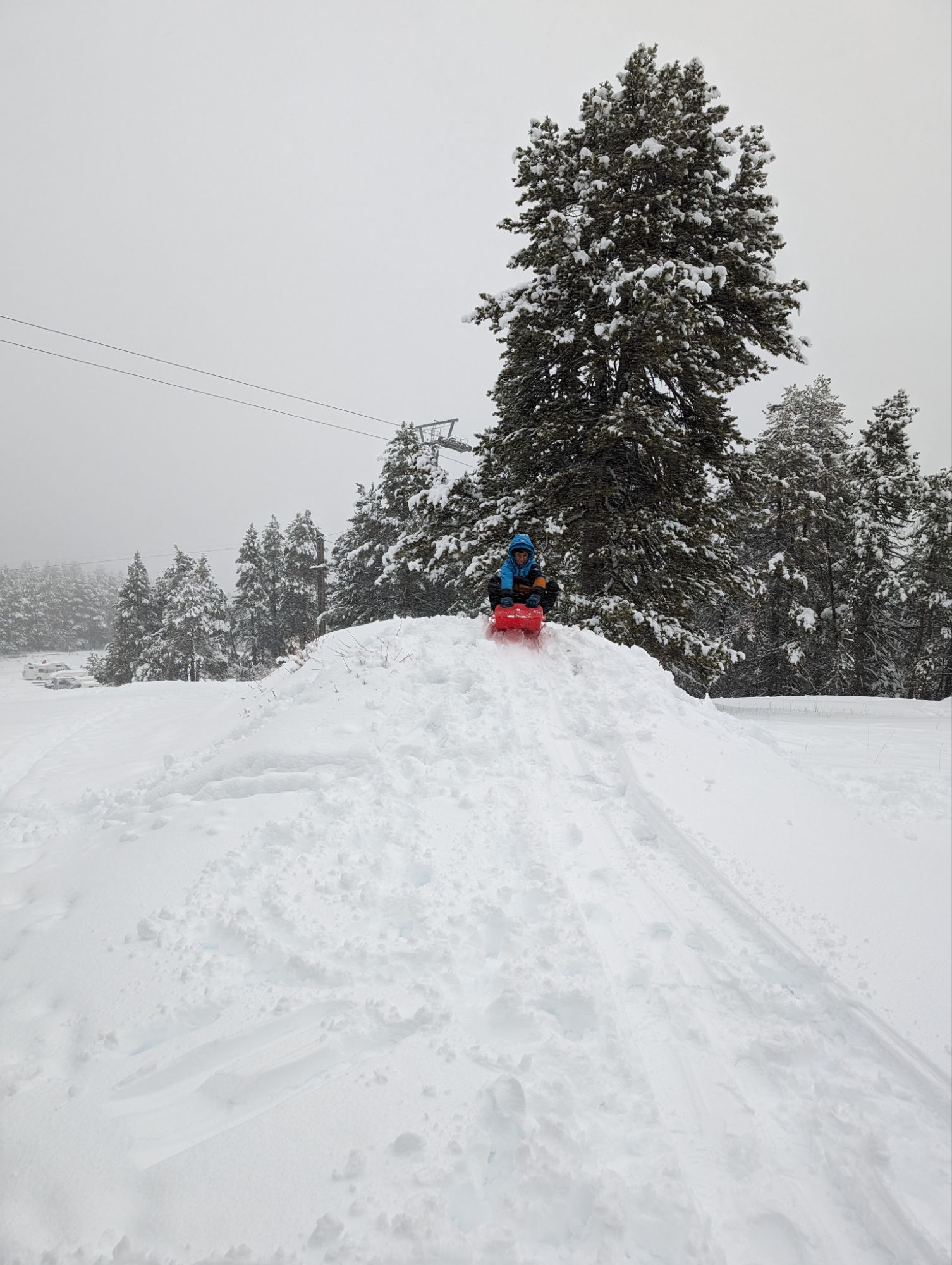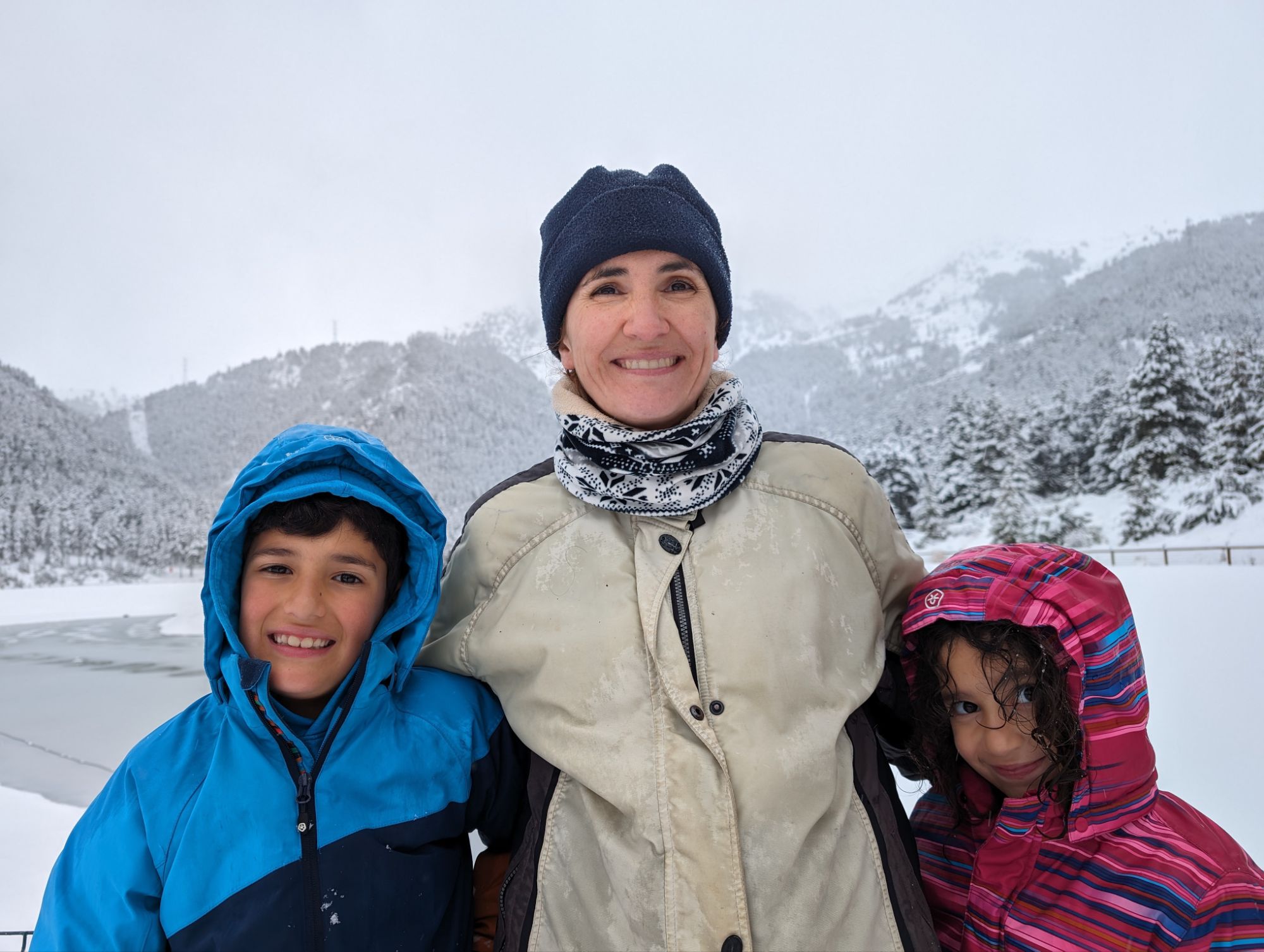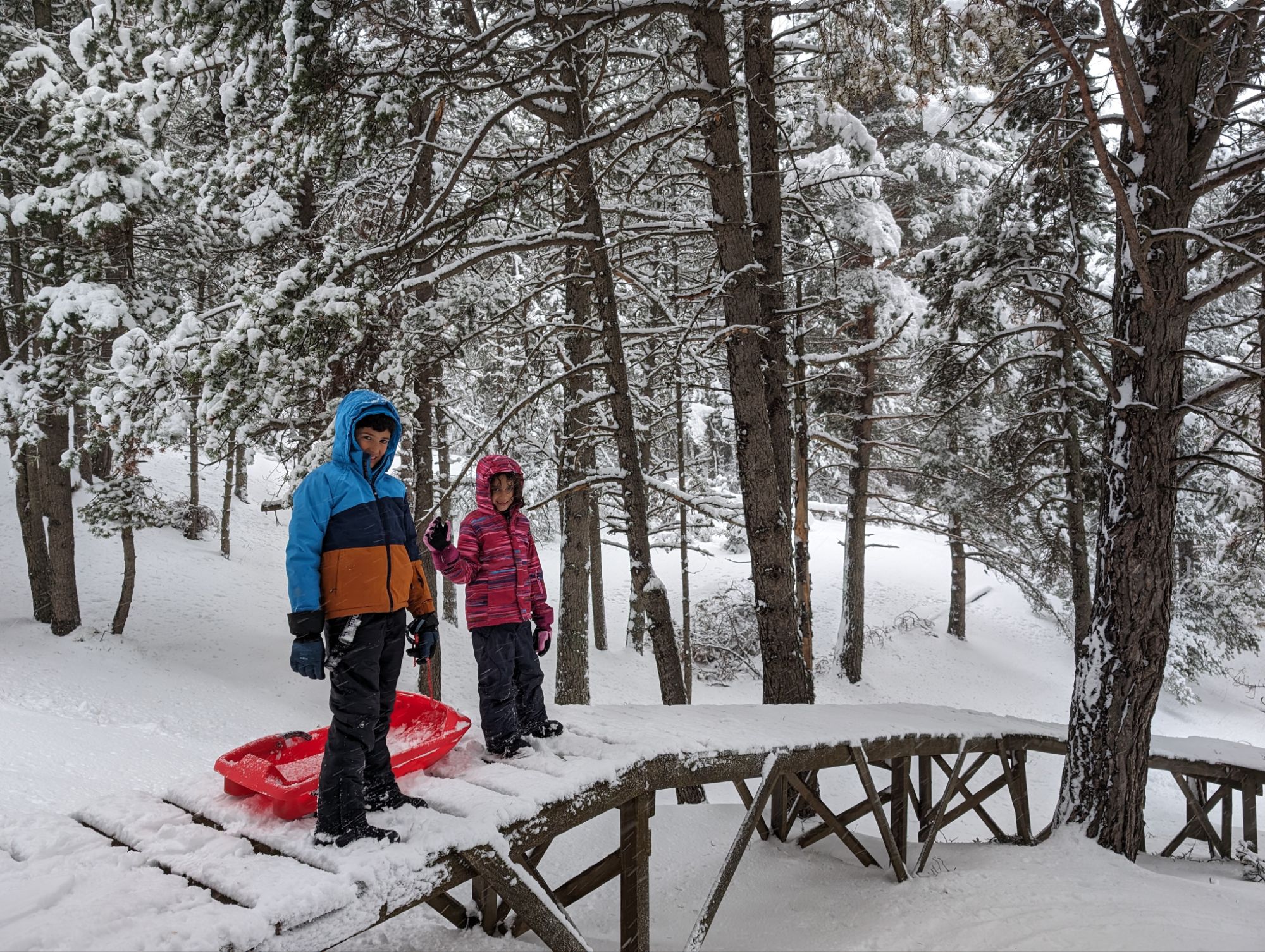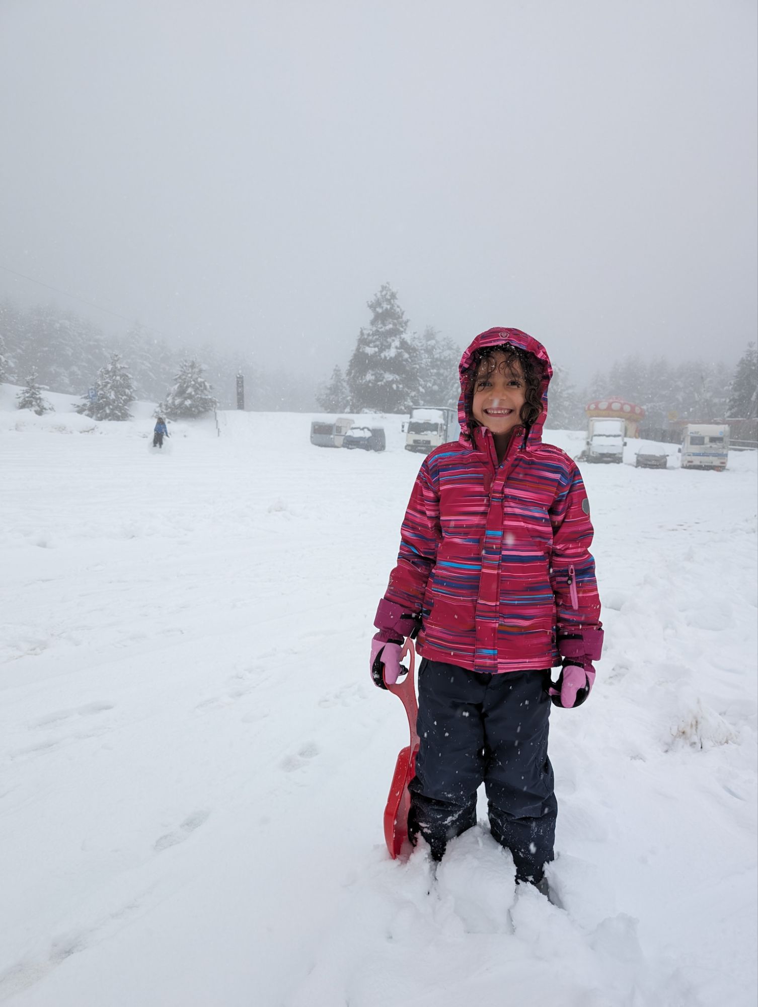 Doncs dissabte al matí, al llevar-nos, el parking era una pista d’esquí, amb 15cm de neu. No va parar de nevar fins al vespre, deixant un paisatge bucòlic de ple hivern (i nosaltres amb la calefacció a la furgo ben calentets!). Bé, el Gerard i jo sí que vam esquiar, una estona, i a la tarda tots 4 vam estar jugant amb el trineu i fent una excursió per la muntanya ben nevada.