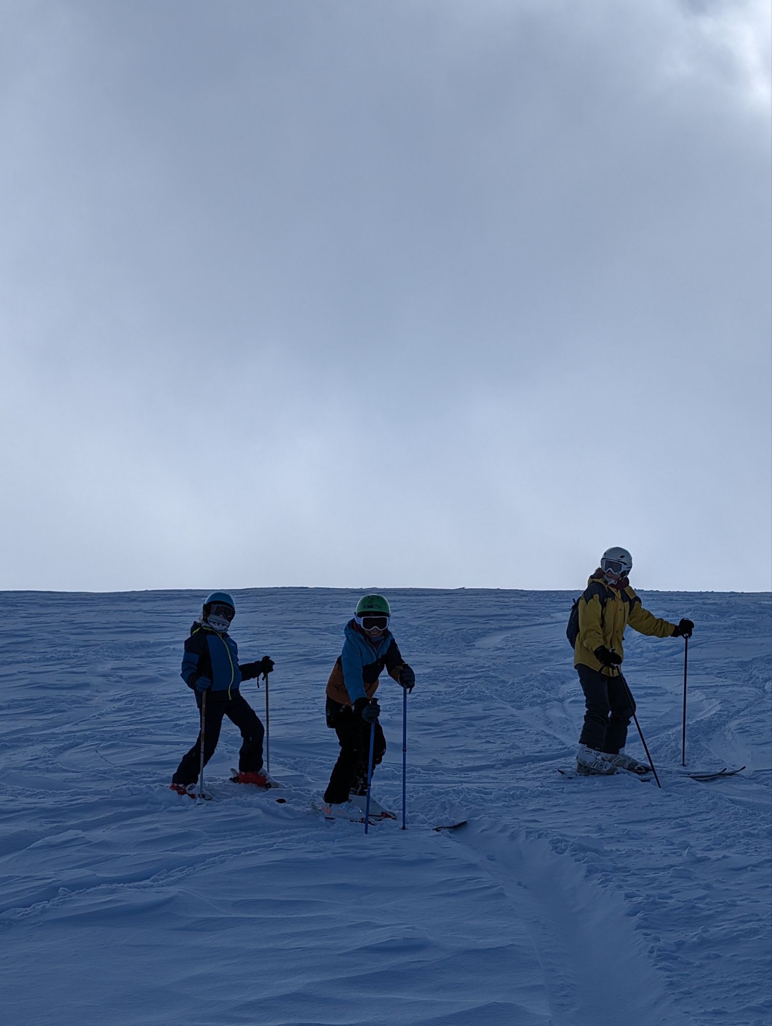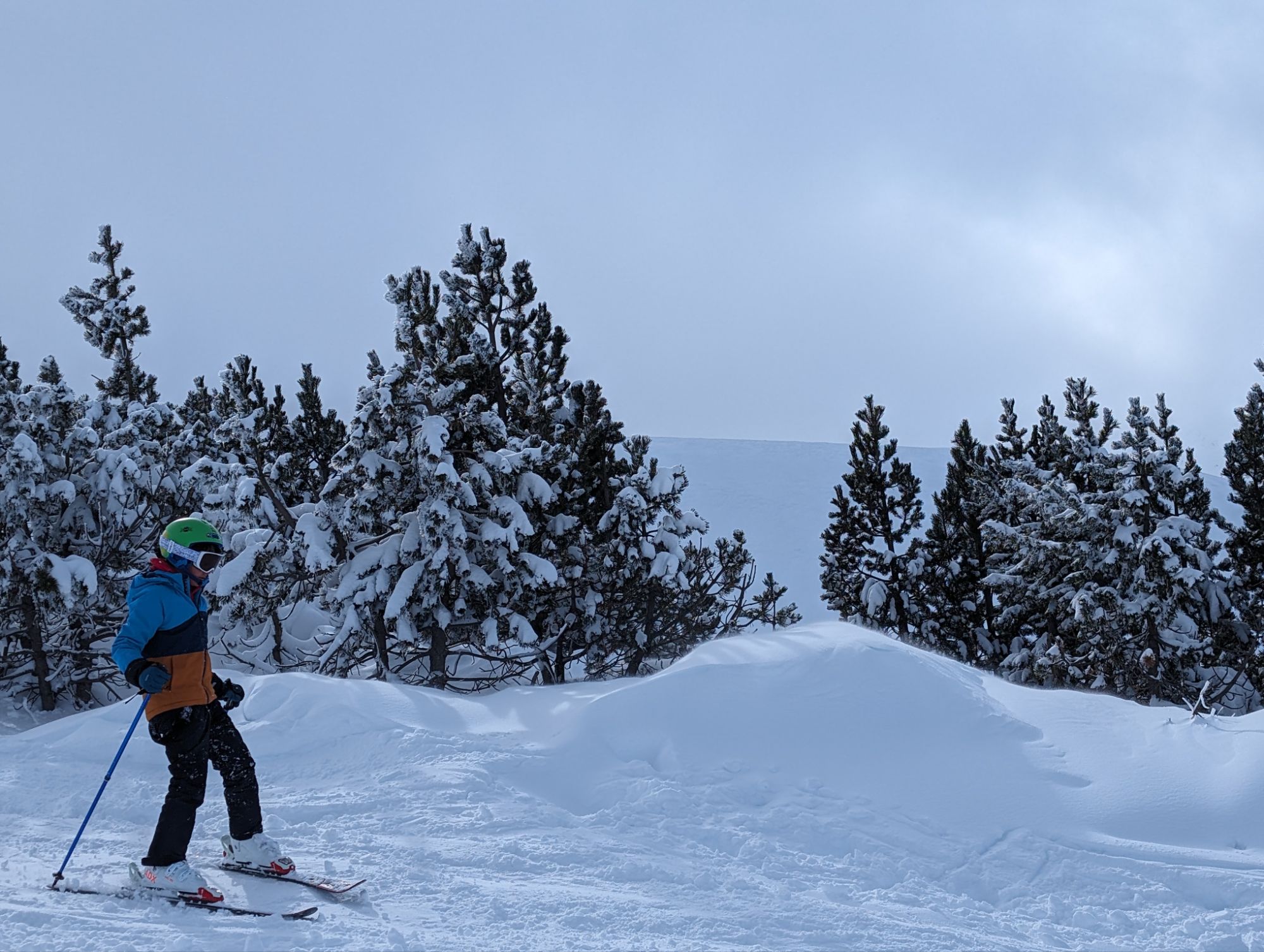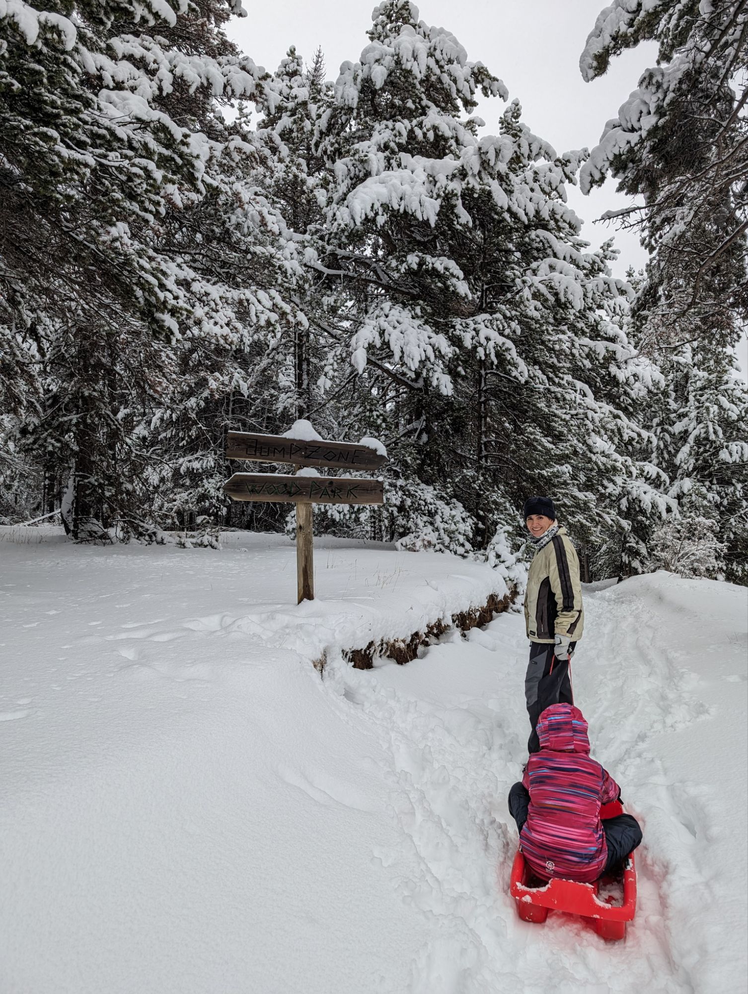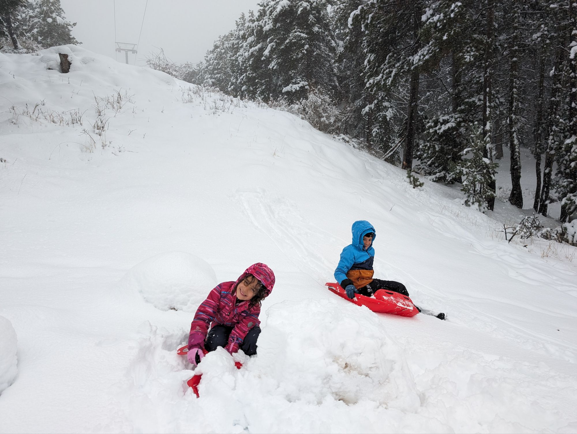 Doncs dissabte al matí, al llevar-nos, el parking era una pista d’esquí, amb 15cm de neu. No va parar de nevar fins al vespre, deixant un paisatge bucòlic de ple hivern (i nosaltres amb la calefacció a la furgo ben calentets!). Bé, el Gerard i jo sí que vam esquiar, una estona, i a la tarda tots 4 vam estar jugant amb el trineu i fent una excursió per la muntanya ben nevada.