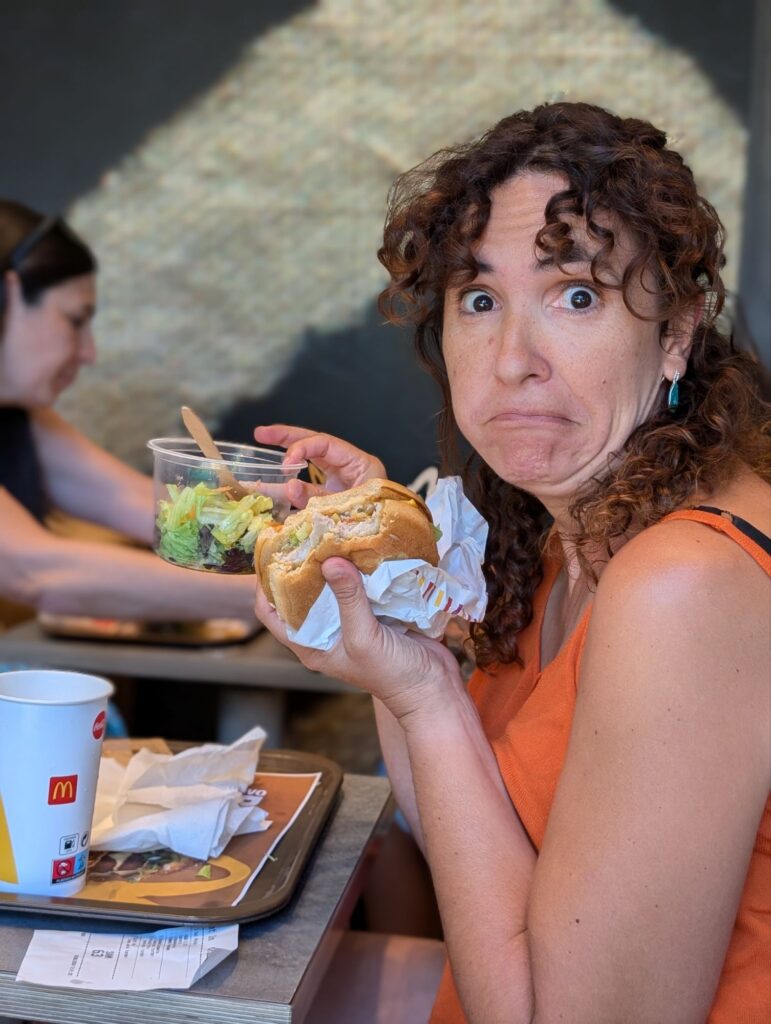 Després hem dinat (al McDonald’s, petició del Gerard), on la Beth s’ha menjat la primera hamburguesa en els 26 anys que portem junts. Tothom diu que la gastronomia a Portugal és fantàstica, però amb els nostres fills és complicat, estan molt poc acostumats a dinar fora de casa (o de la furgo) i ens costa molt trobar algun lloc en el que mengin a gust. Les hamburgueses i els nuggets del McDonald’s, en canvi, són tota una delicatessen…