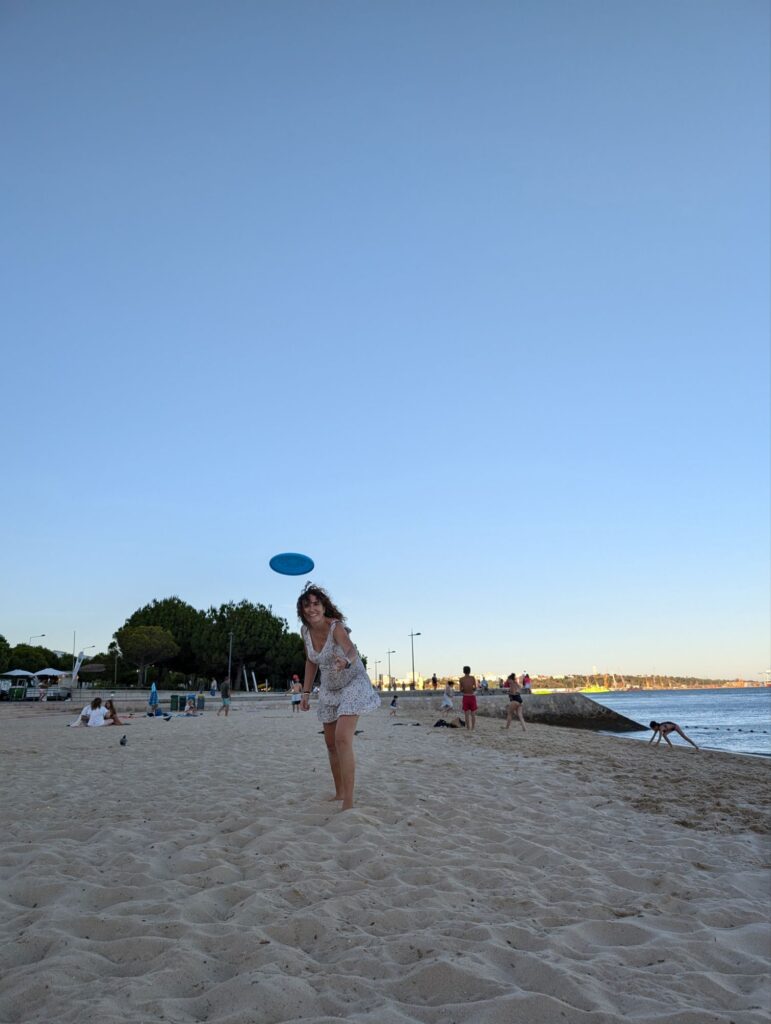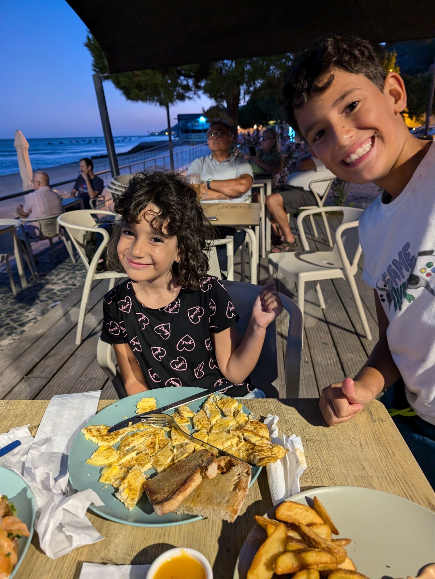 Després de dinar, hem enfilat cap a Setúbal. Allà teníem la intenció de fer un creuer per l’estuari del Sado per veure dofins. Havia buscat informació per internet, però quan hem arribat a lloc no hem trobat la caseta de l’agència que ho fa. Finalment he trucat i m’han dit que demà ho tenen ple. Malgrat quedar-nos una mica xafats, hem decidit que passaríem igualment la nit aquí. Hem trobat una platgeta amb un xiringuito on hi havia un bon ambient i on hem sopat molt bé. El canvi d’humor dels nens ha estat també radical, aquí estaven tots dos ben contents, jugant junts i fins i tot el Gerard li ha regalat patates fregides a la Jana, sense demanar res a canvi! Tot i que hem estat desfullant la margarida fins a última hora, pensant en marxar després de sopar cap a Comporta, la nostra següent destinació, finalment ens hem quedat aquí a passar la nit. La veritat és que, com tots els llocs que hem visitat a Portugal, Setúbal ens ha enganxat.